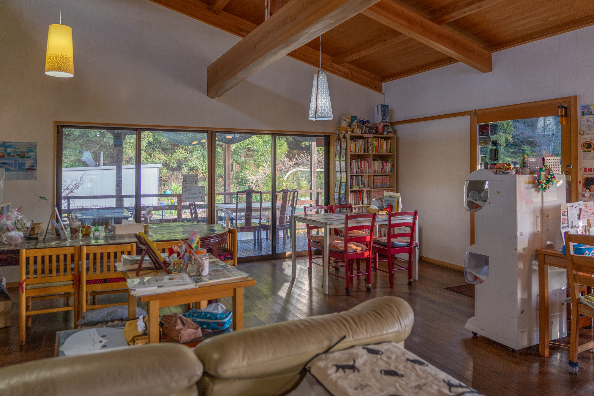 「気の合う仲間が集まって、お喋りや食事を楽しめる場所を作りたい」。そんな想いを実現したお店は、少人数のテーブル席にゆったり座れるソファー席、大テーブルや子供用の椅子も用意され、ゲストを優しく迎えてくれます。入口までのスロープや幅広の引き戸、車椅子も入れる広々としたトイレにおむつ替えベッドなど、バリアフリーにも配慮。近くの「わけまろパーク」を利用した後の子ども連れのお客さんにも好評です。「ハレいろ・サイクリング OKAYAMA」のサイクルカフェ登録店のため、サイクリストも多く来店。積極的に保護猫活動も行っており、猫好きな人も集まるそう。テラス席はペット同伴OK。