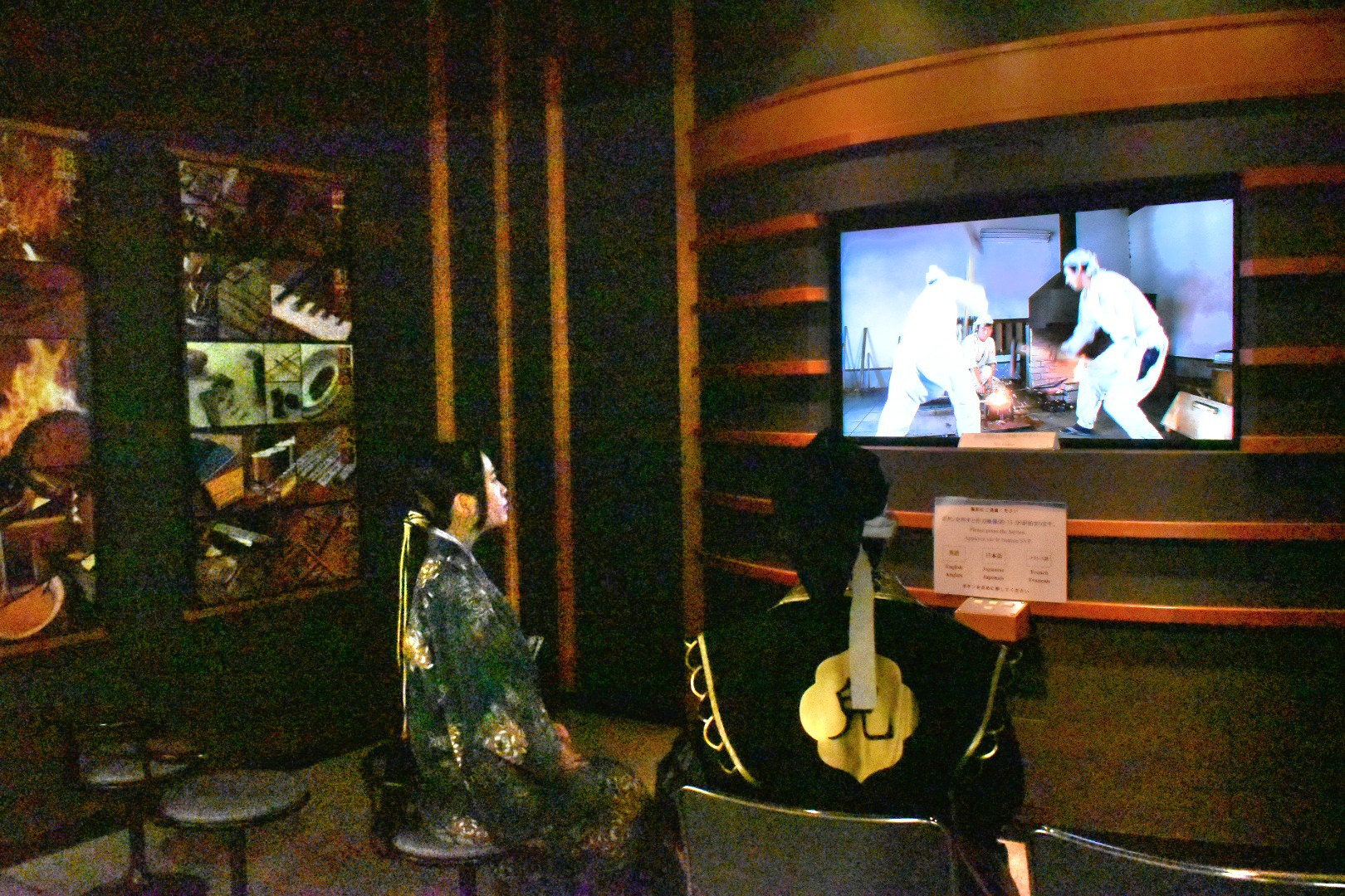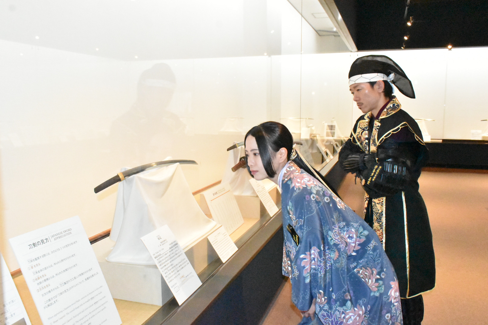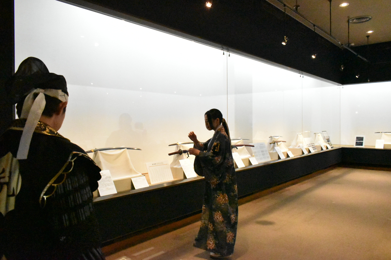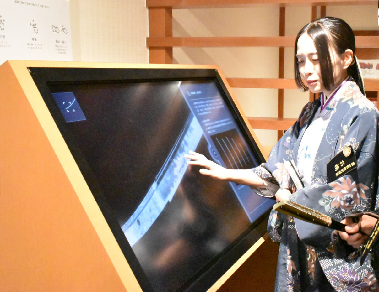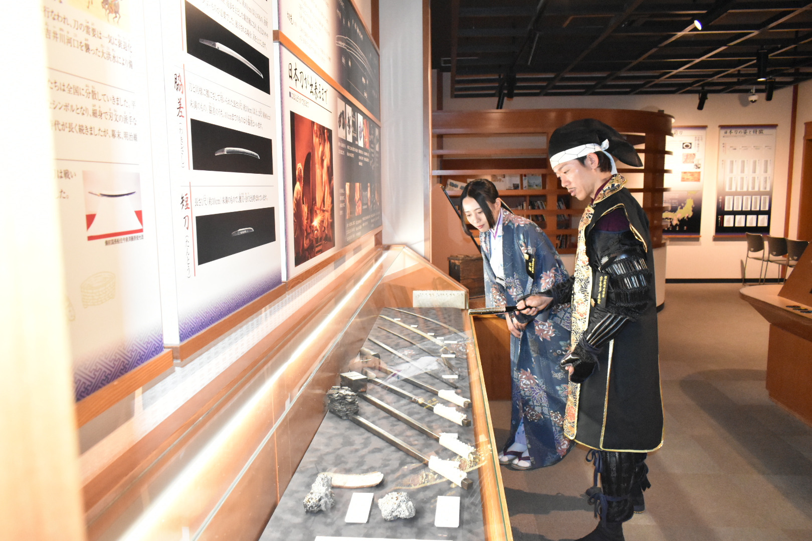 まず、入口を入り正面のチケット売場で入館券を購入。その右側には刀作りの様子を一からわかりやすく解説している情報コーナー「刀剣の世界」がある。「刀ってどうやって作るの?」「どこを見ればいいの?」をやさしく動画やパネルで説明されておる。初心者の方はまず、ここで刀の仕組みを学んでから本物を見ると、理解がより深まりますぞ。ここで予備知識を得たあとはいよいよ実物の刀を見てまいろう。