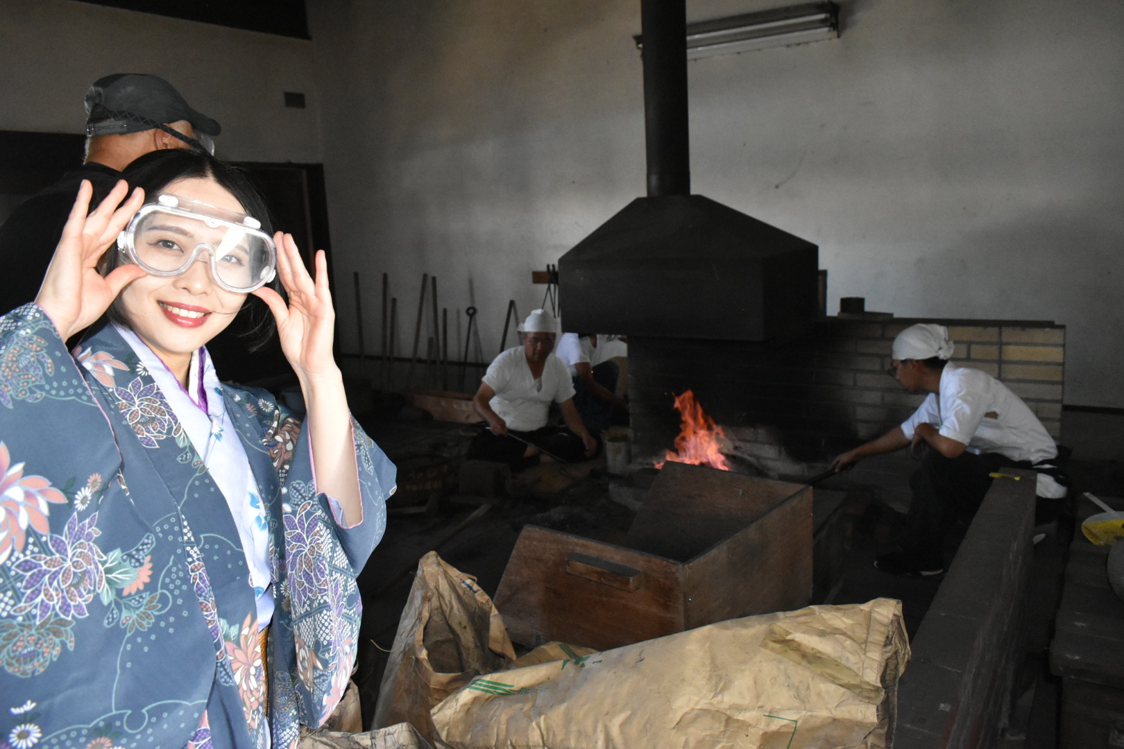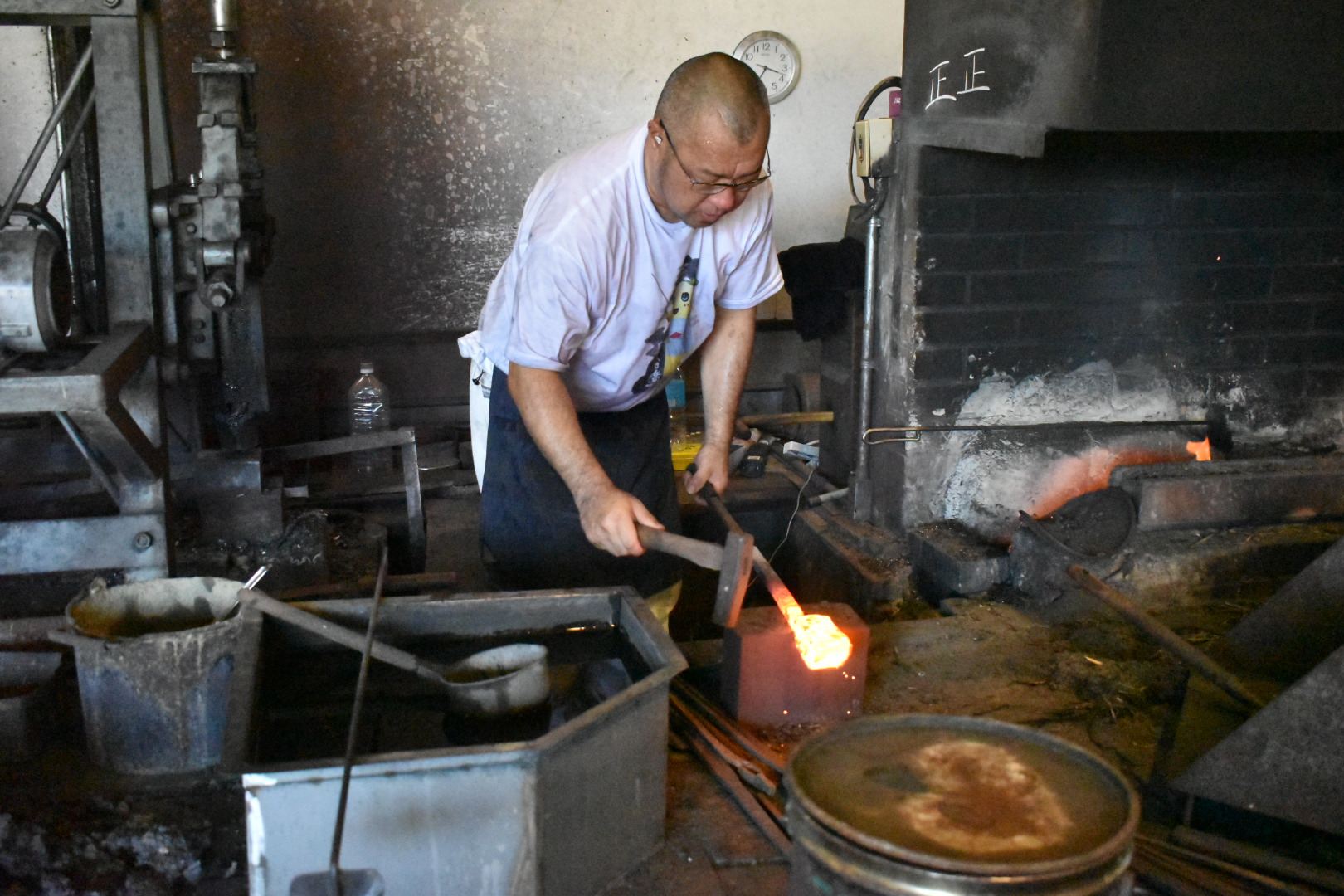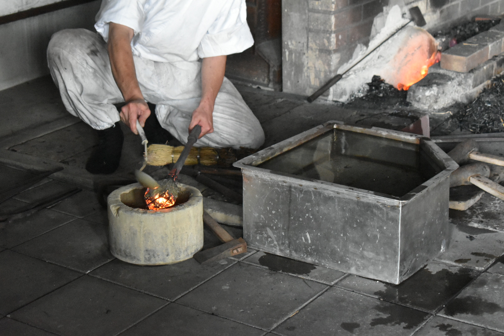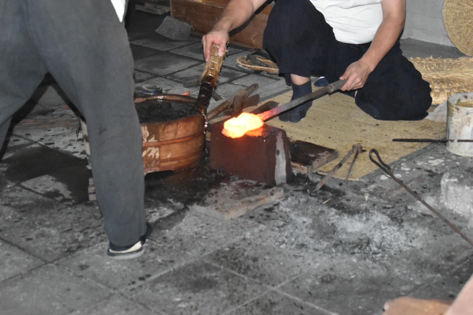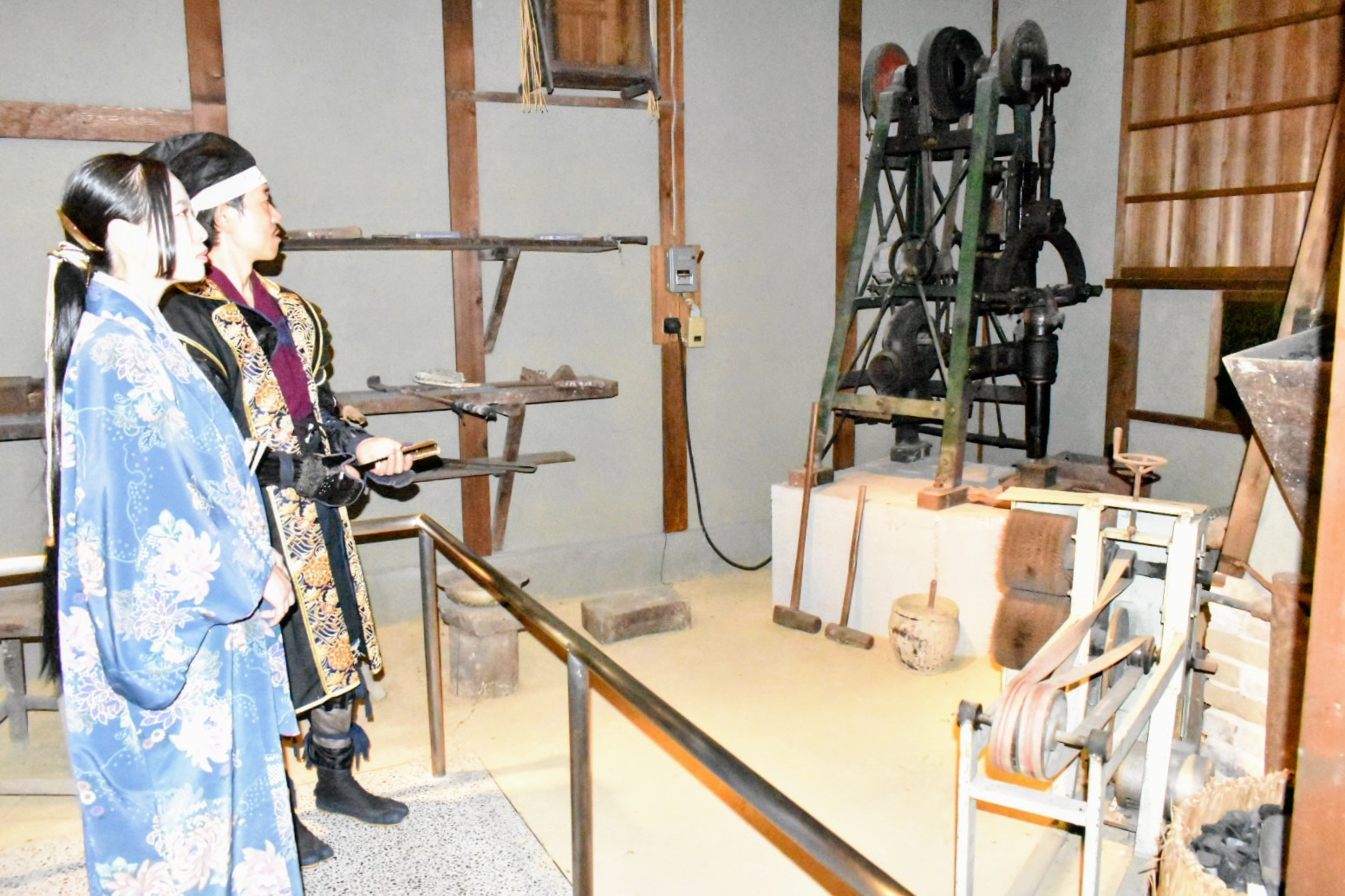 刀匠とはたたら製鉄から得られた玉鋼を材料に日本刀の素材を鍛え、焼き入れ、研ぎ、銘を切るまでの刀身を作る専門職のことじゃ。安藤広康(あんどうひろやす)刀匠が常駐しており日本刀作りの鍛錬などの一連の作業を間近に見学することが出来る。安藤刀匠は現代刀職展で数々の優秀賞を受賞されておる刀匠で、お話をお聞きするとやはり焼入れの時が日本刀作りが成功するか失敗するか決まるので一番緊張すると。未だ自分で満足できる刀はできていないとおっしゃり、日々研究に明け暮れていると。じゃが、一連の作業はどの作業も楽しいという。安藤刀匠は一見怖そうに見えるが、とても優しい気さくなお方なので来館の折には話しかけられてみるとよろしかろう。作刀に関するいろんなお話を聞くことができるやもしれぬ。