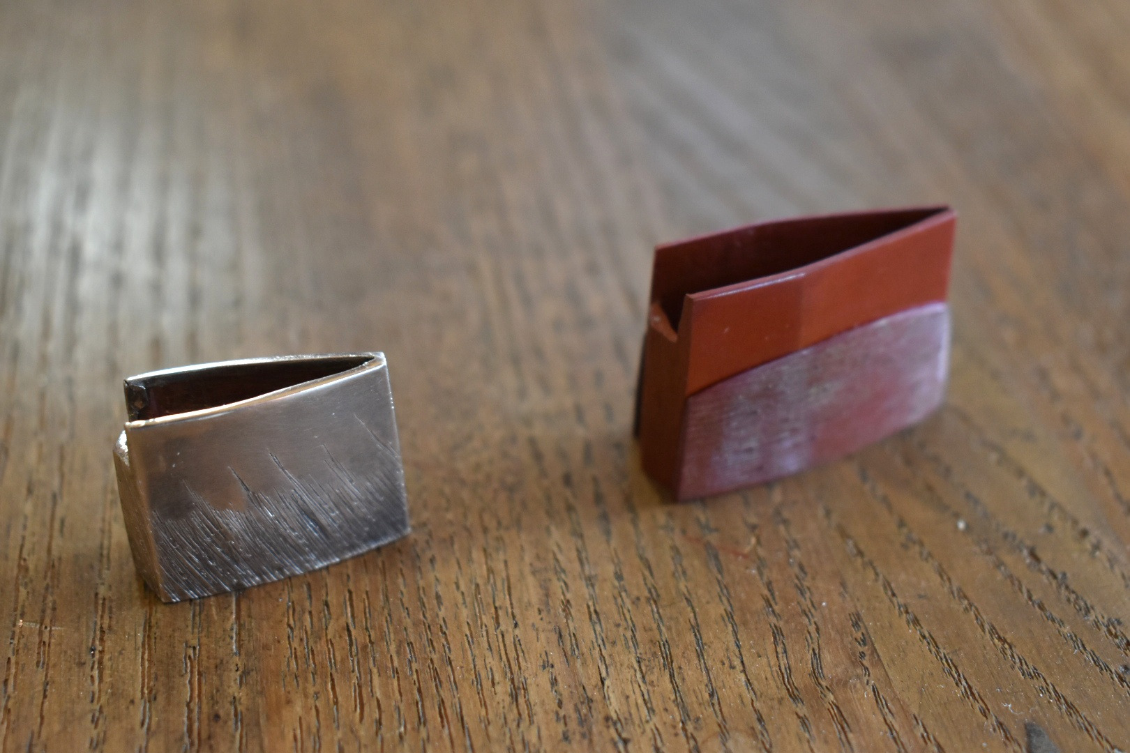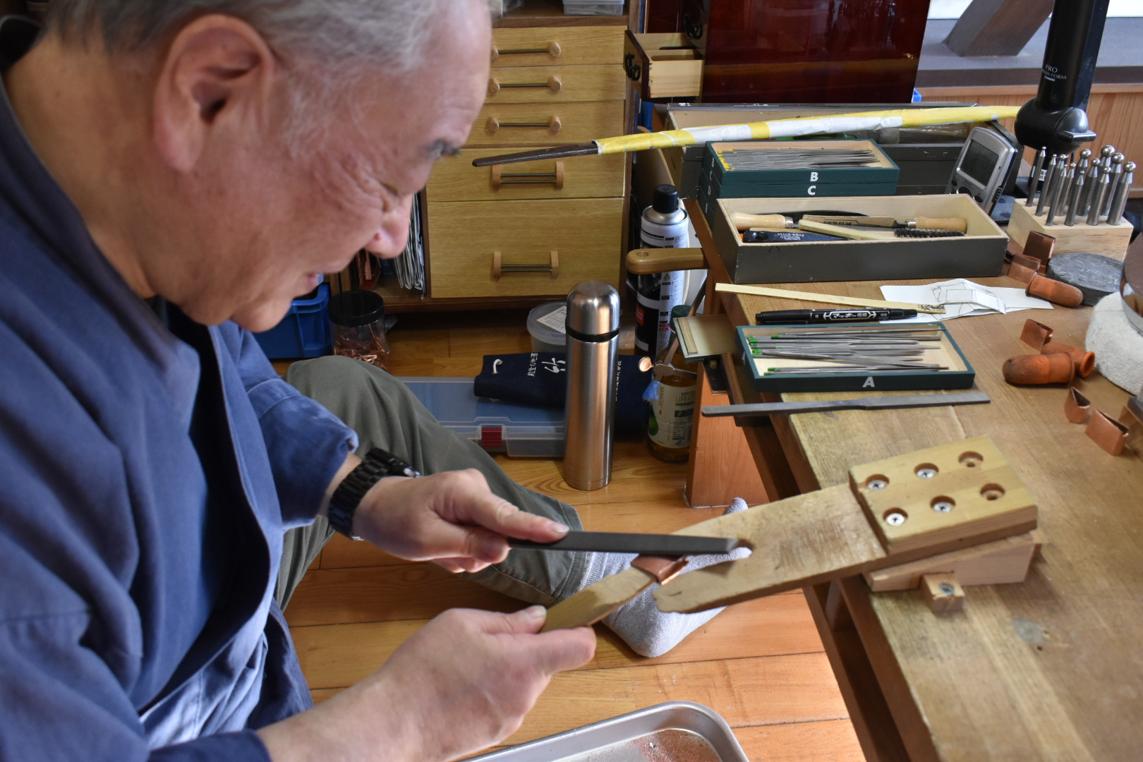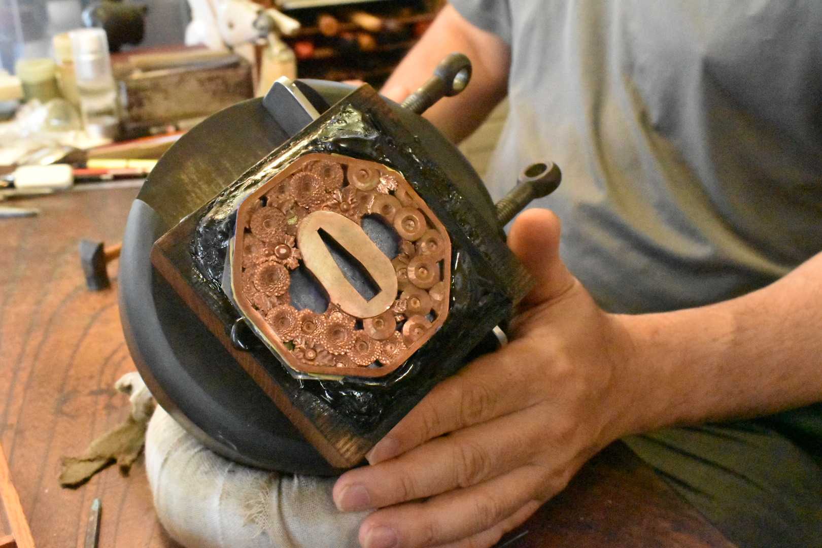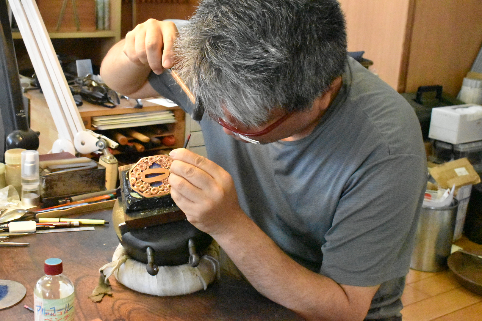 鍔(つば)、縁頭、目貫などの金具を作る装飾金工の職人。象嵌の技術なども使い美術工芸の要素が強い。また刀に信仰的・芸術的価値を付与するために刀身に彫物を施す職人は金工師とよばれる。常駐の片山 重恒(かたやま しげつね)殿が作業公開をおこなっておる。片山氏によると、「刀匠を目指して岡山に来たのですが、ここ備前長船刀剣博物館で師匠の刀身彫刻をみて感激したのと同時に装剣金工というものがあると知りこの世界に入りました。新しいデザインなど今までなかったようなものを作ってみたい。」とおっしゃっておった。手元にはデッサンノートがあり、刀身彫刻や鍔などの新作デザインがたくさん入っておった。また、彫金を自分でもやってみたいという方は直接片山殿に話してみられるとよかろう。この場所で初心者向けに教室もやられておるそうじゃ。