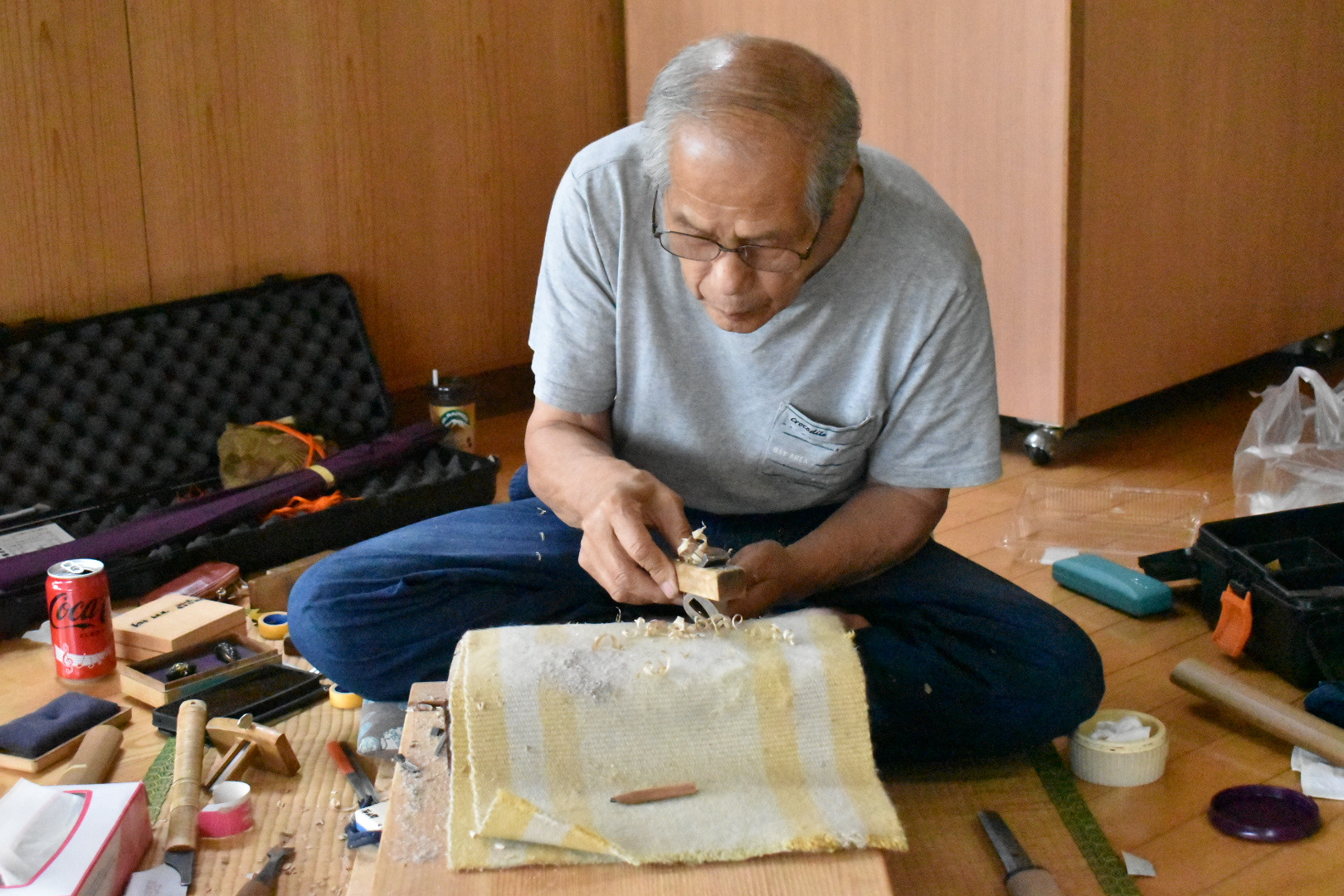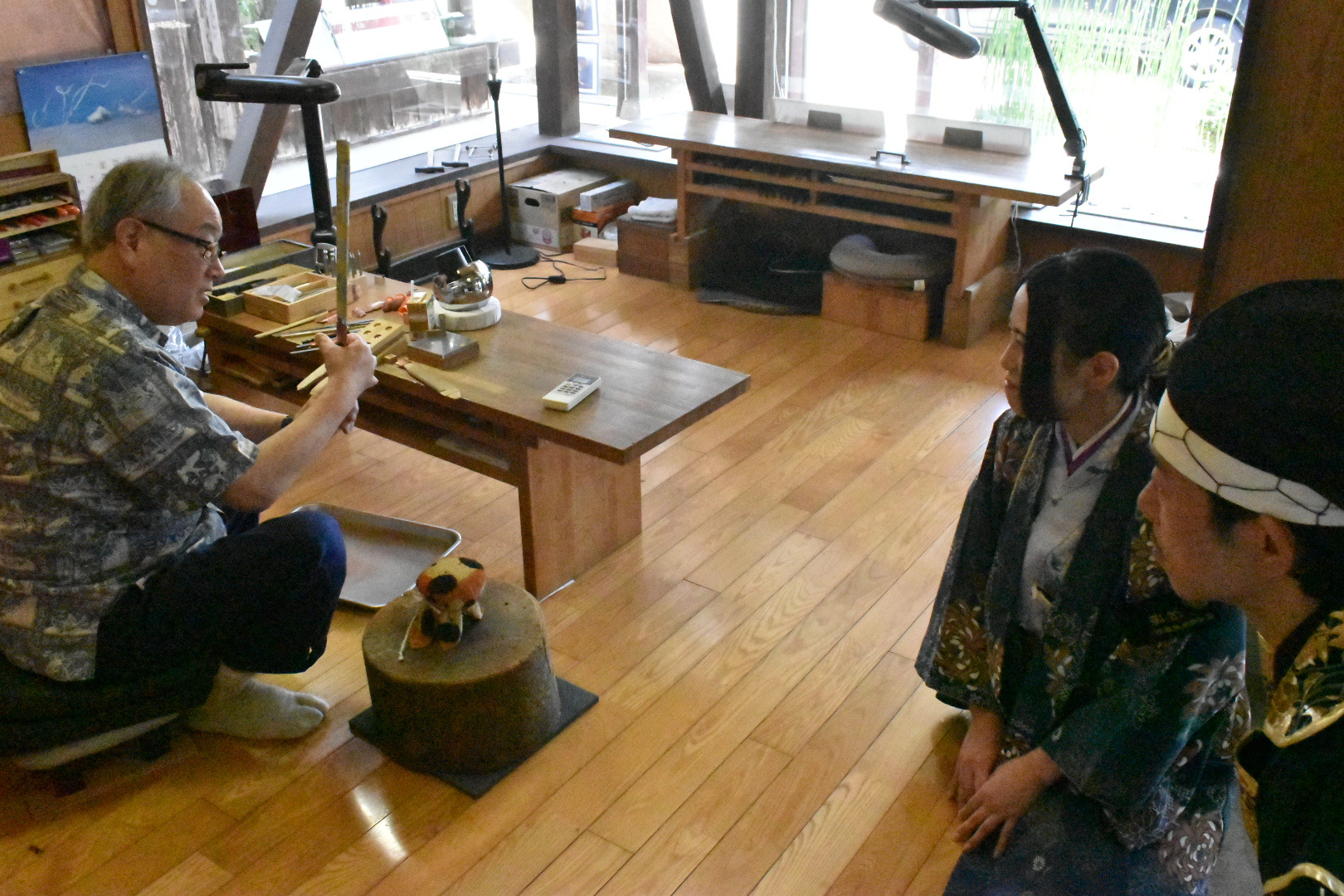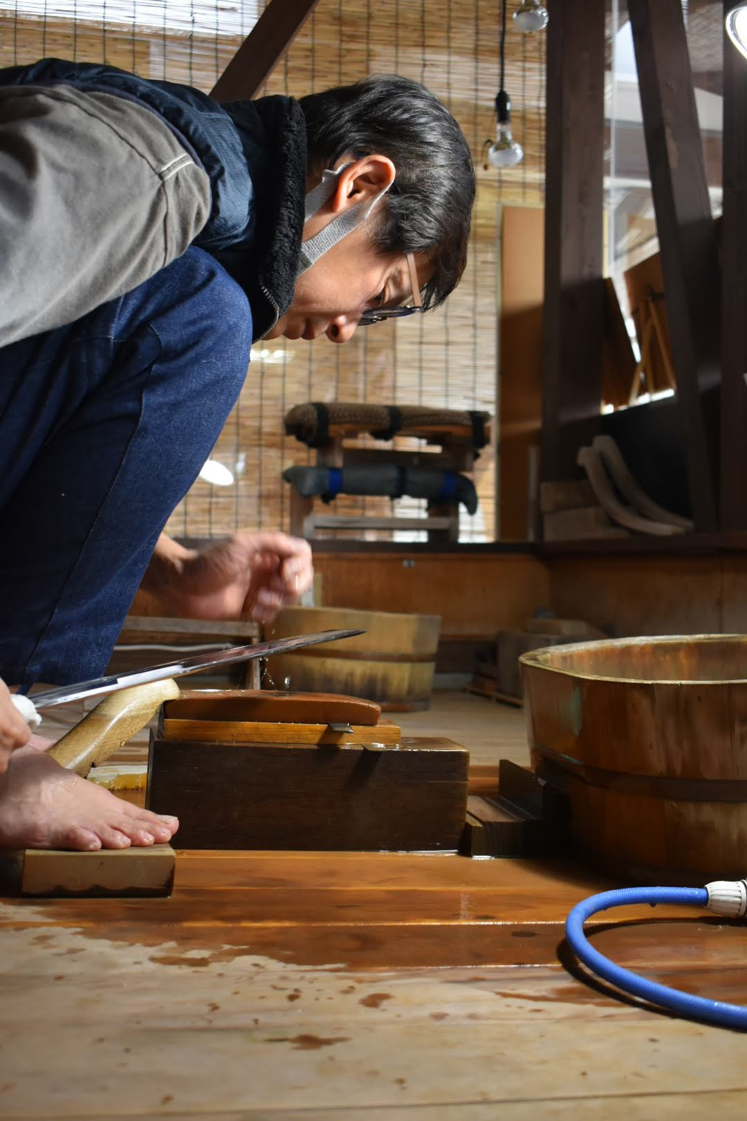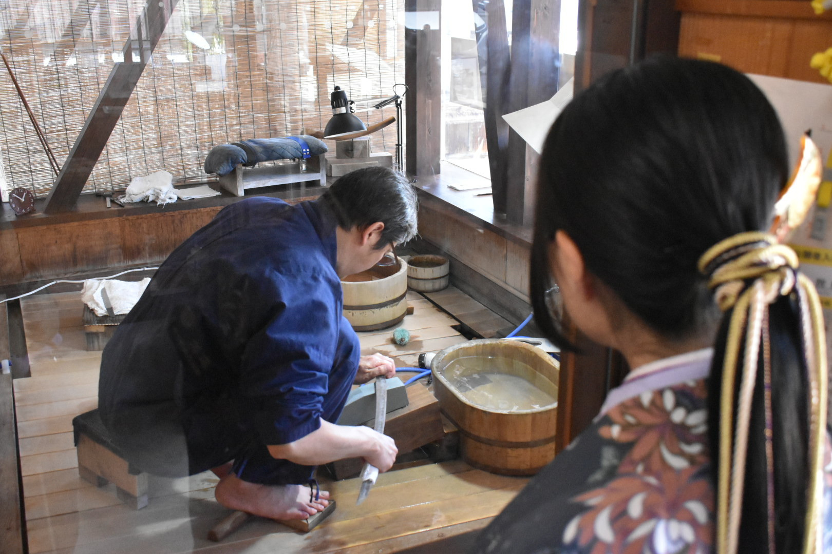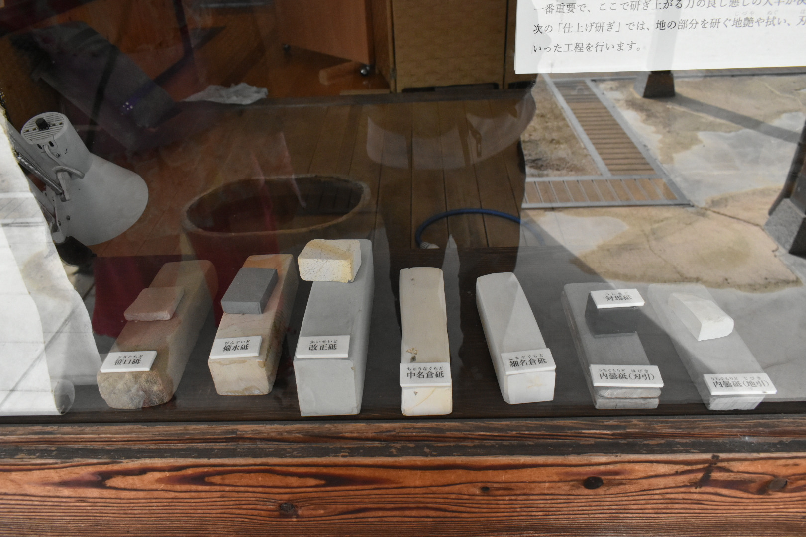 日本刀を美しく、そして正しく見せるために研磨(とぎ)を行う専門職。刀匠が鍛えた刀は焼き入れのままでは刀身が白っぽく曇っており、刃文や地肌もはっきり見えぬ。そこで研師が仕上げることで、刃文や地鉄の美しさが際立ち、刀剣本来の姿が現れるのじゃ。実用的にも、刃を研ぎ澄ますことで切れ味が整えられるのじゃ。横山 智庸殿、安井 隆之殿の2名の研師が定期公開をおこなっておる。横山殿にお話をおききすると、「刀匠の作った現代刀から研ぎ直しの刀まで様々な刀が持ち込まれます。研ぎ直しは研ぎすぎてもダメで、最小限の研ぎで刀をまた甦らせます。」という。砥石も荒いものから細かいものと大小数多くの種類の砥石がありそれを使い分けておるそうじゃ。とても細かく気を遣う仕事じゃと思うた。
