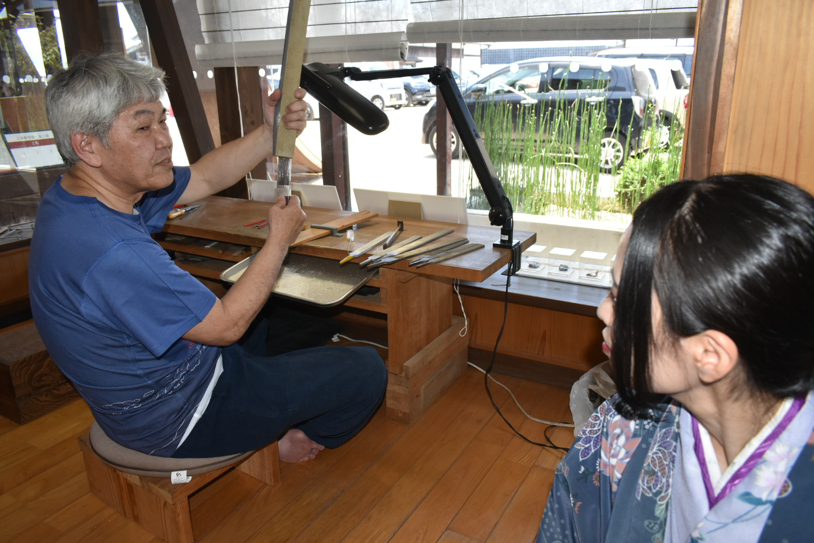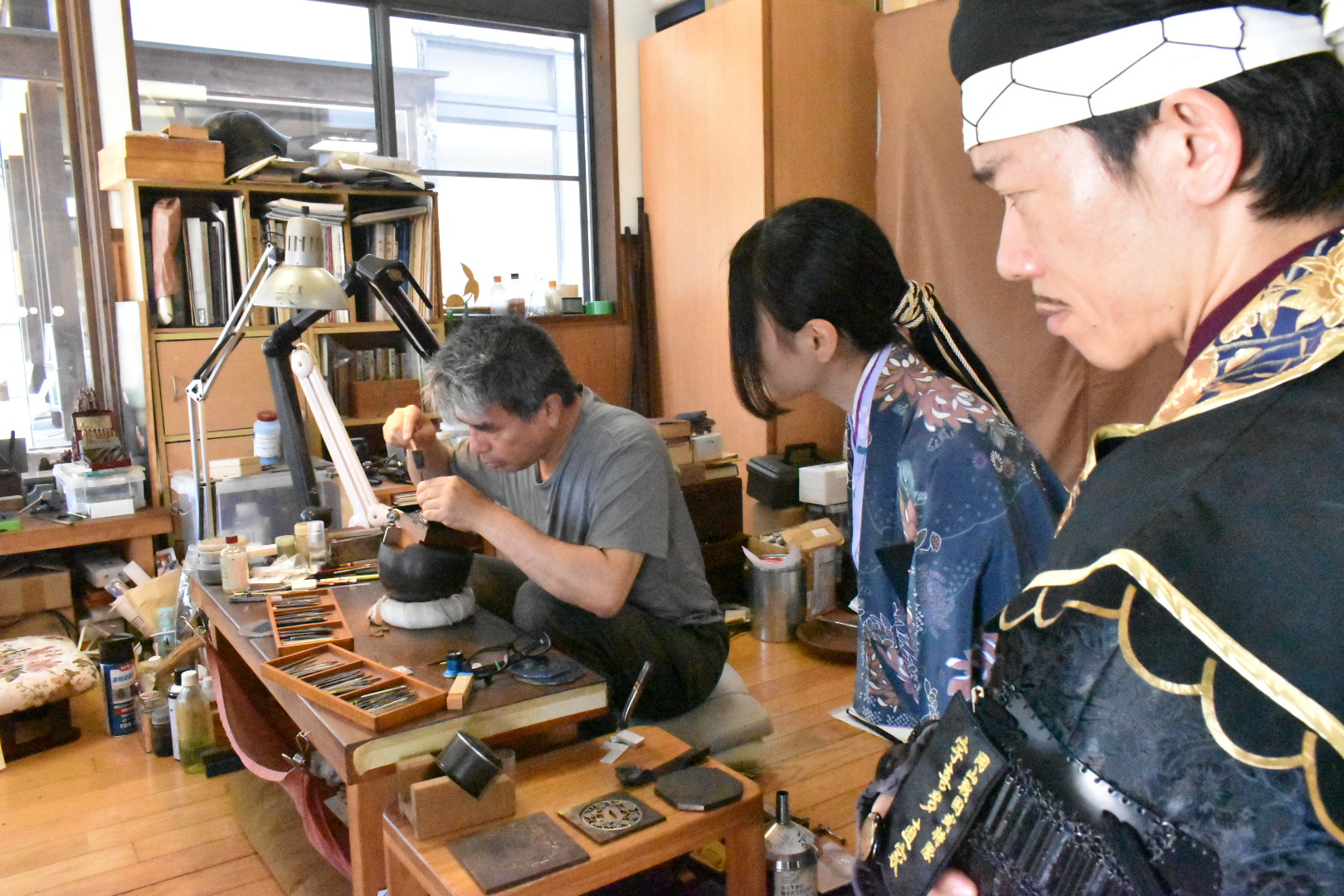 「白銀」とは銀や金属を指す言葉で、刀剣の外装(拵=こしらえ)の中で、主に金属部分を担当し刀の装飾金具や補強具を製作する職方なんじゃ。白銀師がいなければ刀は「鞘に納まらず、武器としての実用や装飾美を持てない」存在になってしまう。常駐の武藤 健(むとう たけし)殿と定期公開の小池 哲(雅号:重之)殿のお二人が作業を公開しておる。