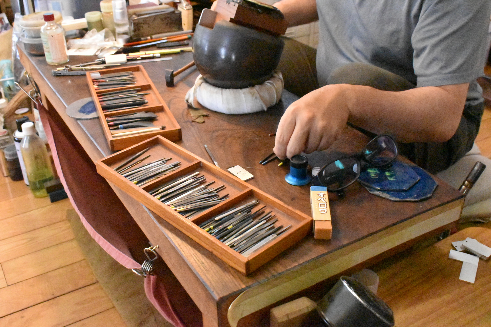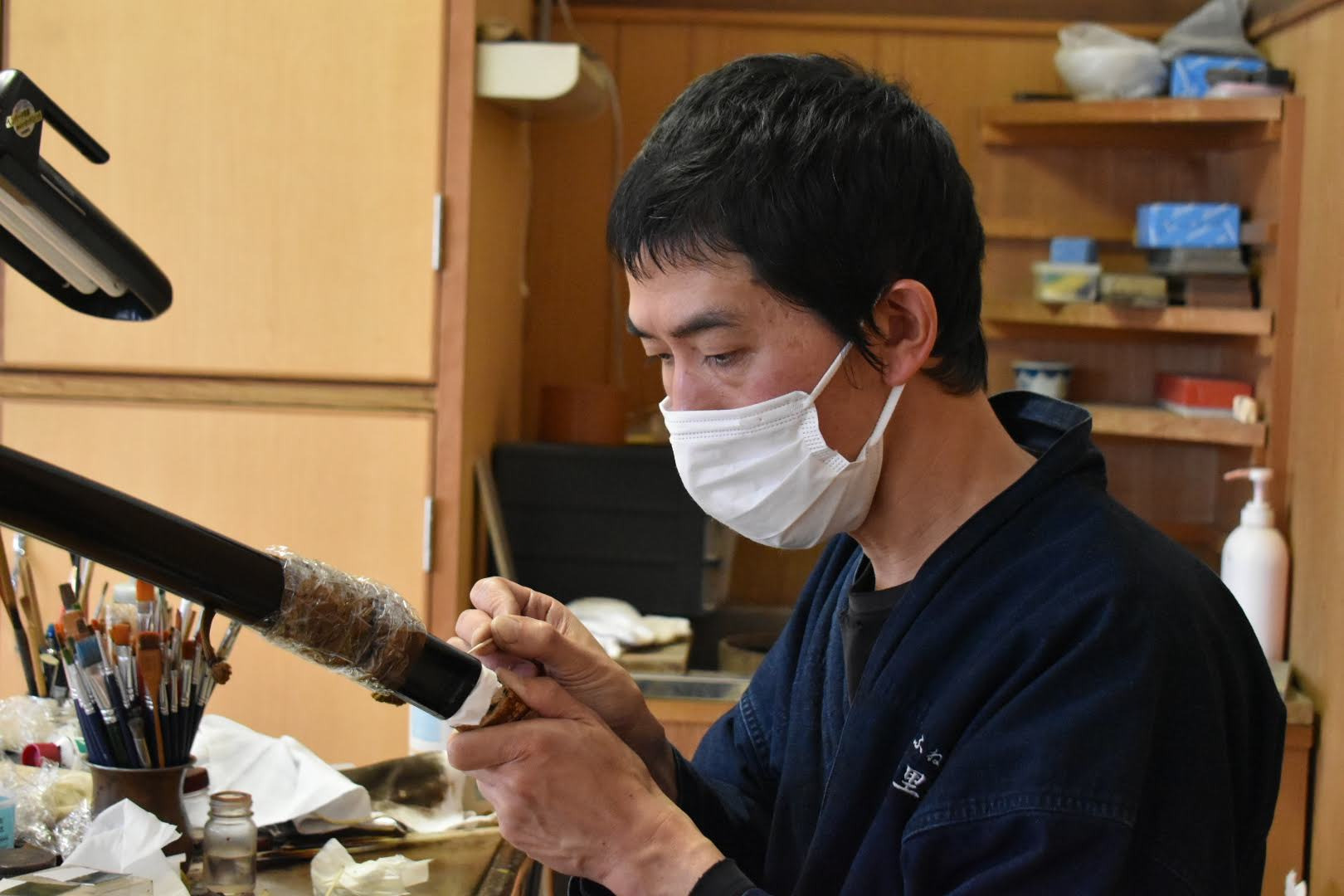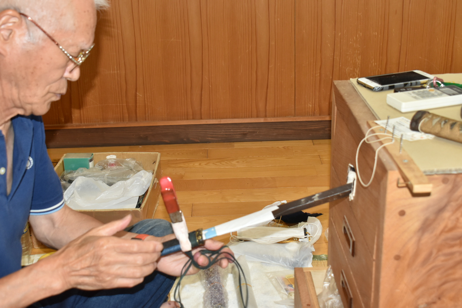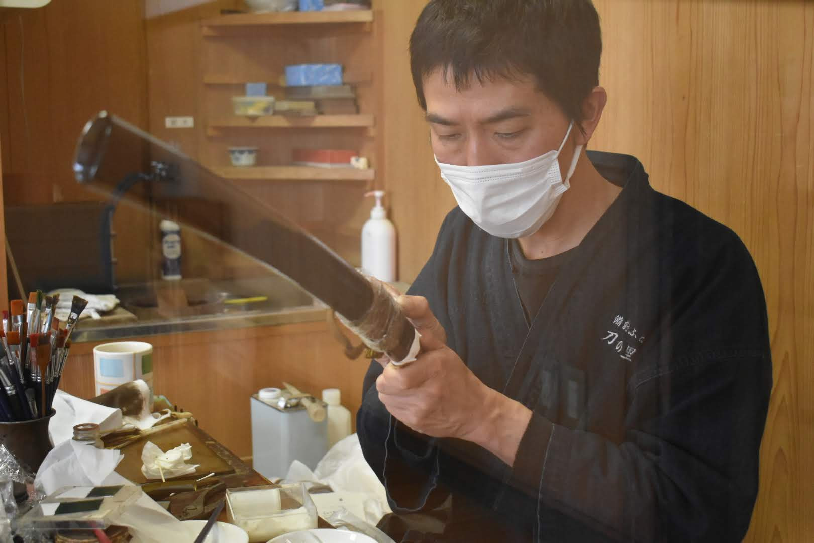 塗師は、主に鞘(さや)や刀装具の表面を漆(うるし)で仕上げる職人で、日本刀制作における重要な職方の一つなんじゃ。現在、岸野 輝仁(きしの てるひと)殿が博物館の常駐塗師として作業公開をおこなっておる。塗師の仕事についてお聞きすると「鞘に漆を塗る工程は約50工程あります。塗っては磨ぎ、塗っては磨きの繰り返しです。ただ塗るだけではなく、鞘師さんと部位によって塗りの厚さなどの綿密な打ち合わせをして作業にかかります。あと、鞘師さんの作った鞘の形を細かい部分まで塗りの厚みなどで変えないように仕上げることも大切です。」とお話くだされた。ここで漆を塗るときや、乾燥させる時には埃が鞘につかないようにとても気をつかわれておった。皆様も塗りの作業中に出くわした時には埃をたてぬよう気をつけて見学なされよ。