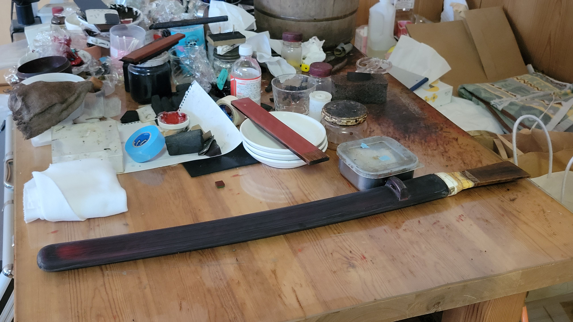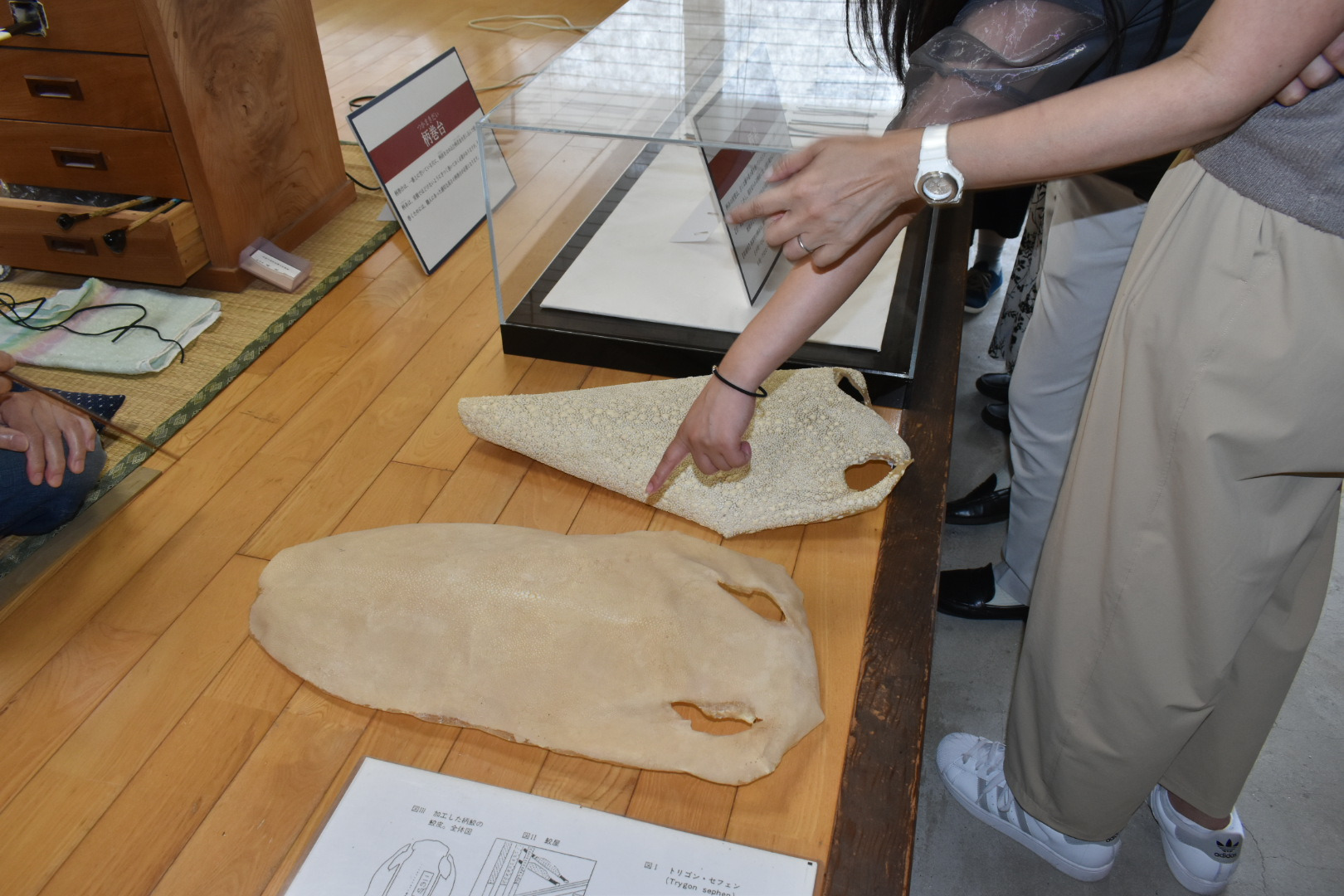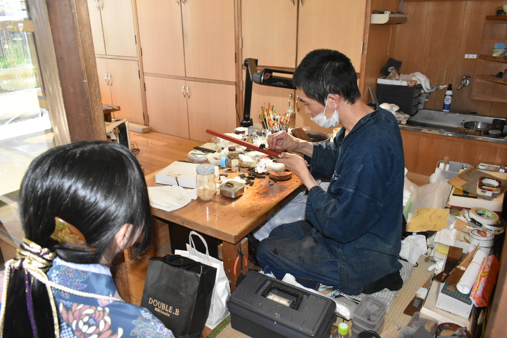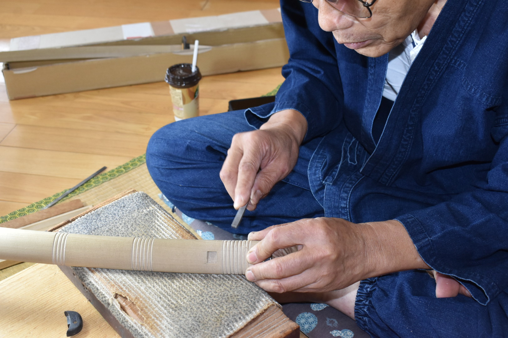 塗師は、主に鞘(さや)や刀装具の表面を漆(うるし)で仕上げる職人で、日本刀制作における重要な職方の一つなんじゃ。現在、岸野 輝仁(きしの てるひと)殿が博物館の常駐塗師として作業公開をおこなっておる。塗師の仕事についてお聞きすると「鞘に漆を塗る工程は約50工程あります。塗っては磨ぎ、塗っては磨きの繰り返しです。ただ塗るだけではなく、鞘師さんと部位によって塗りの厚さなどの綿密な打ち合わせをして作業にかかります。あと、鞘師さんの作った鞘の形を細かい部分まで塗りの厚みなどで変えないように仕上げることも大切です。」とお話くだされた。ここで漆を塗るときや、乾燥させる時には埃が鞘につかないようにとても気をつかわれておった。皆様も塗りの作業中に出くわした時には埃をたてぬよう気をつけて見学なされよ。