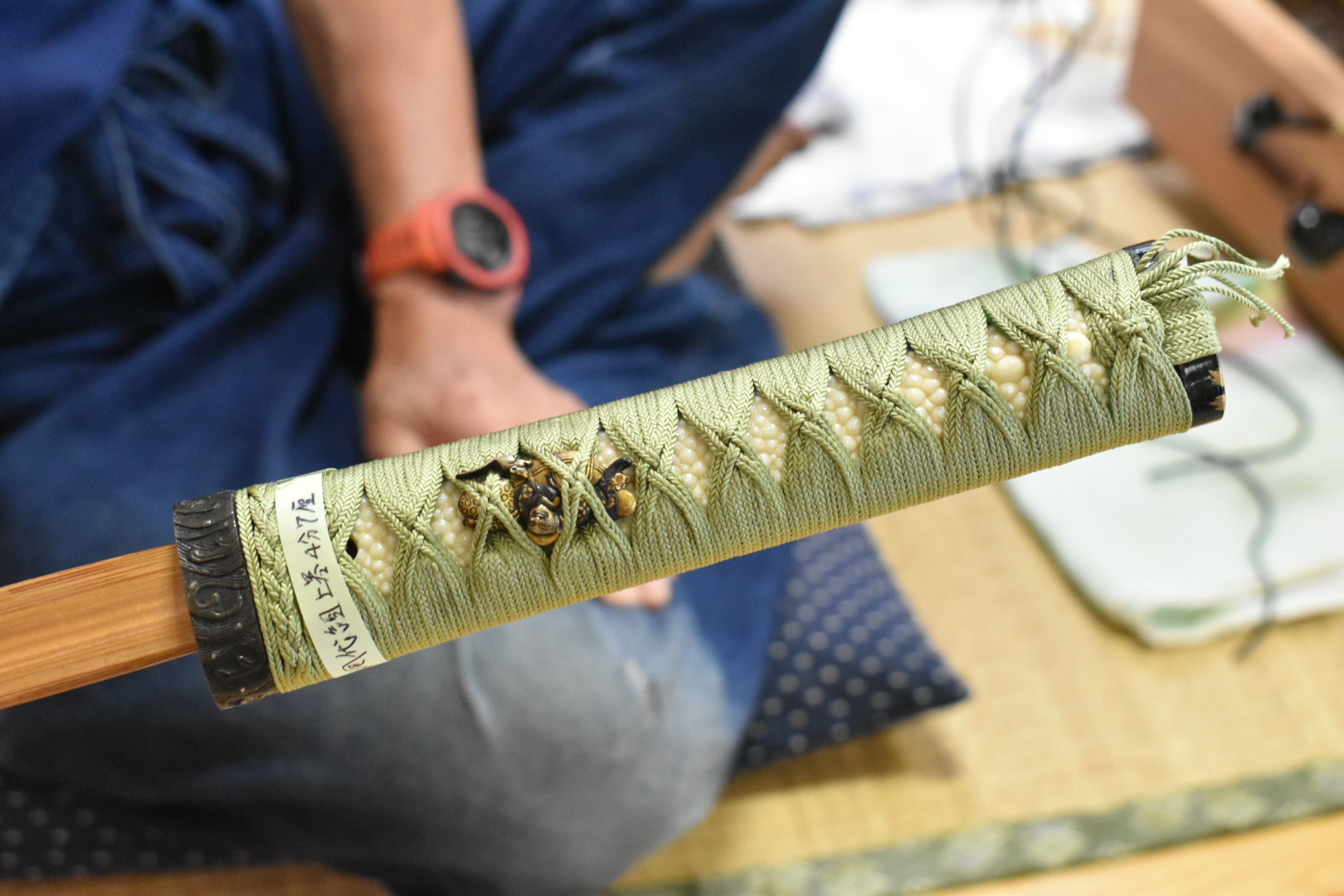 柄巻師(つかまきし)とは、刀の外装を作る職方その一つで、日本刀の柄(つか)に糸や革を巻き付けて仕上げる職人のことなんじゃ。見た目の美しさだけでなく、実用性と耐久性を兼ね備えた重要な役割を担う。高見 信夫(たかみ のぶお) 殿が定期公開の柄巻師として作業を公開しておる。1988年にこの道に入られたそうじゃ。幅広の平紐を捻りながらただ巻いているのではなくて、よく見てみると何と細いひもを何本も使って編み込むように巻いておられたのじゃ。交差しているところはとても複雑で見た目もとても美しく、外側からみえないように和紙を詰めておる。こうすることによってとても握り心地が良くなり手になじむ柄になるということじゃ。目に見えぬところまでに気を使うまさに職人芸じゃ。