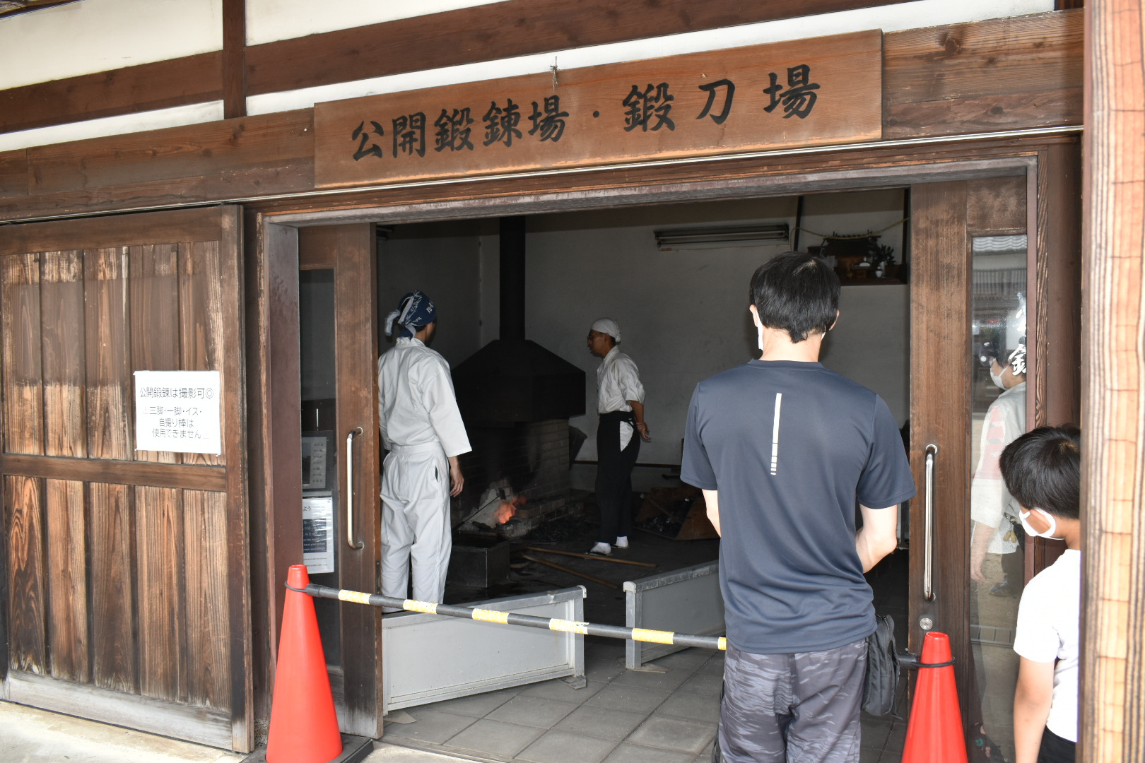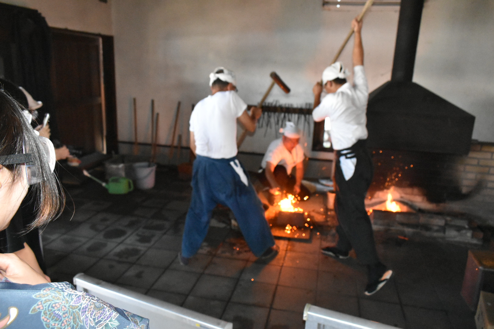 古式鍛錬(こしきたんれん)」とは、日本刀を製作する過程の中で、伝統的な手法で鋼を高温で加熱し、大鎚でたたき延ばす鍛錬(打ち延ばし・折り返し鍛錬など) の技術・工程を指すのじゃ。特に刀身の内部組織を精練し、不純物を排除したり、鋼の均質性を高めたりして、強く、しなやかで切れ味のよい刀を作るための肝となる部分じゃ。月一回第2日曜日に刀匠が持ち回りで担当して「折り返し鍛錬」の公開実演が行われておる。大槌を振り上げ鉄に打ちつけるとき火花が飛び散り大迫力!見学するには、必ず予約をして備前長船刀剣博物館に入館して受付を済ませ、貸し出される保護眼鏡を着用しての見学となる。刀匠のかたも説明して下さるので刀作りを実際に見て理解することができるのじゃ。