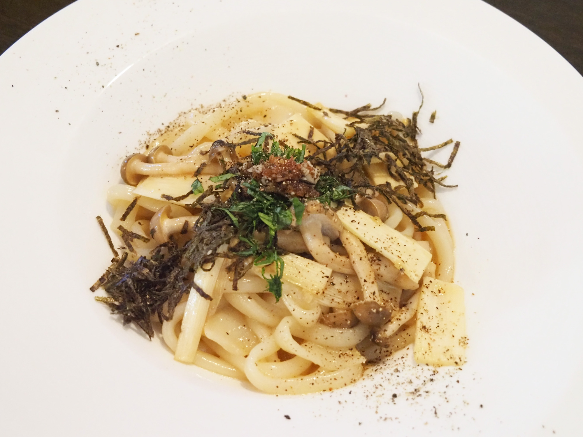 私がオーダーしたのは「まこもたけの和風パスタ 青紫蘇のせ」。食欲をそそる和風ソースと、もちもちの麺とシャキシャキのまこもたけのコンビネーションがたまりません。