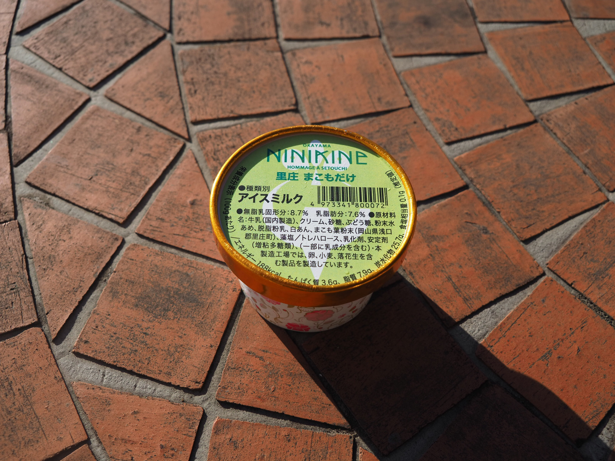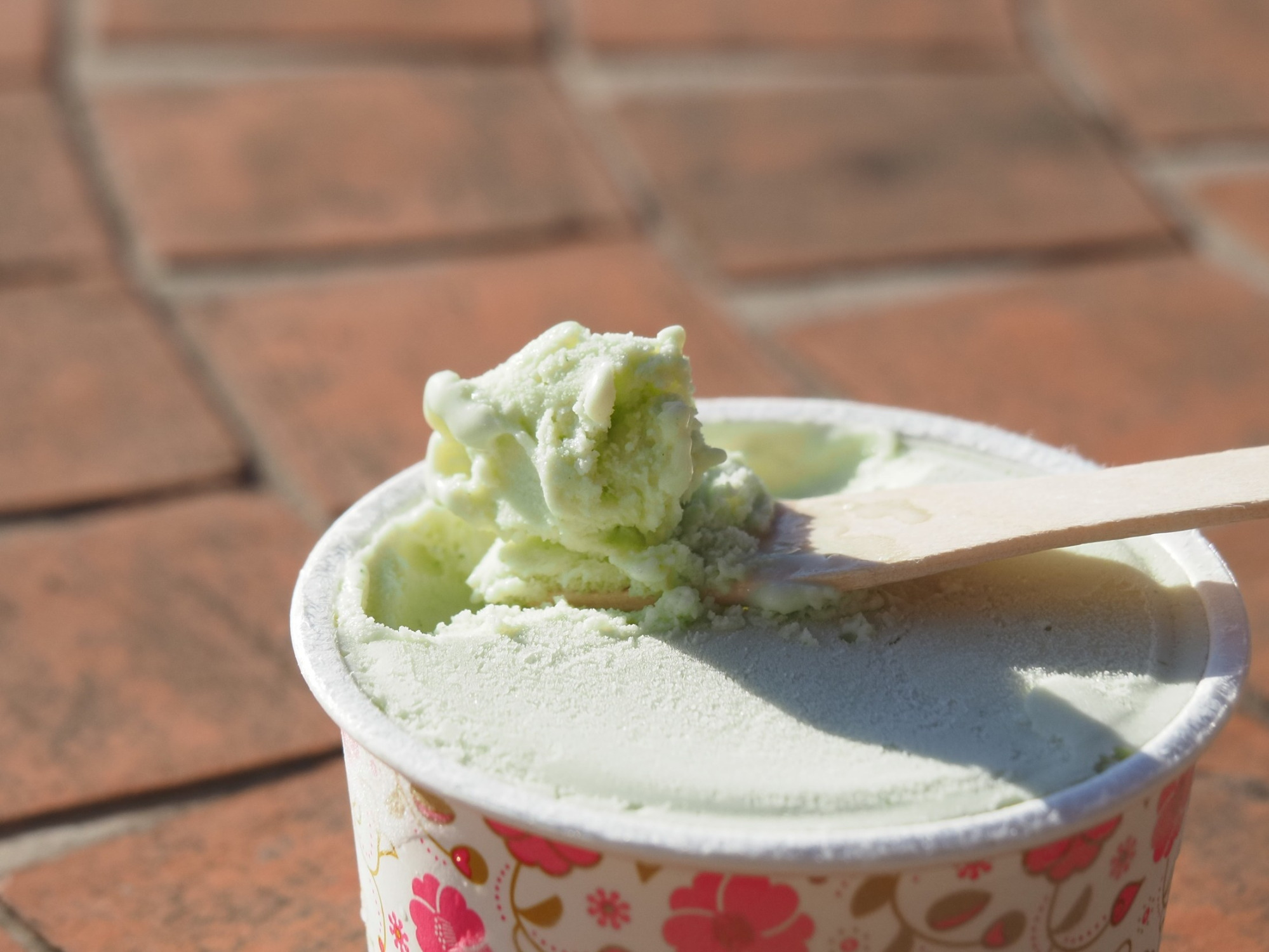 蓋を開けると、うっすらと緑色。まこも葉パウダーを使ったジェラートです。ミルクの優しい甘さの中に、まこも葉の香りがふわりと広がります。