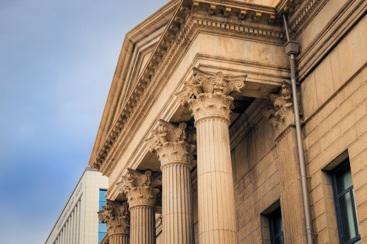 まるでフランスのメゾン・カレ神殿やローマのパンテオン神殿を思わせる荘厳なファサードが印象的です。柱の中間部がわずかに膨らんだ「エンタシス柱」が用いられ、柱頭にはアカンサスの葉をモチーフにしたコリント式の装飾が施されています。豪華で重厚感あふれる建築に、思わず見入ってしまいます。