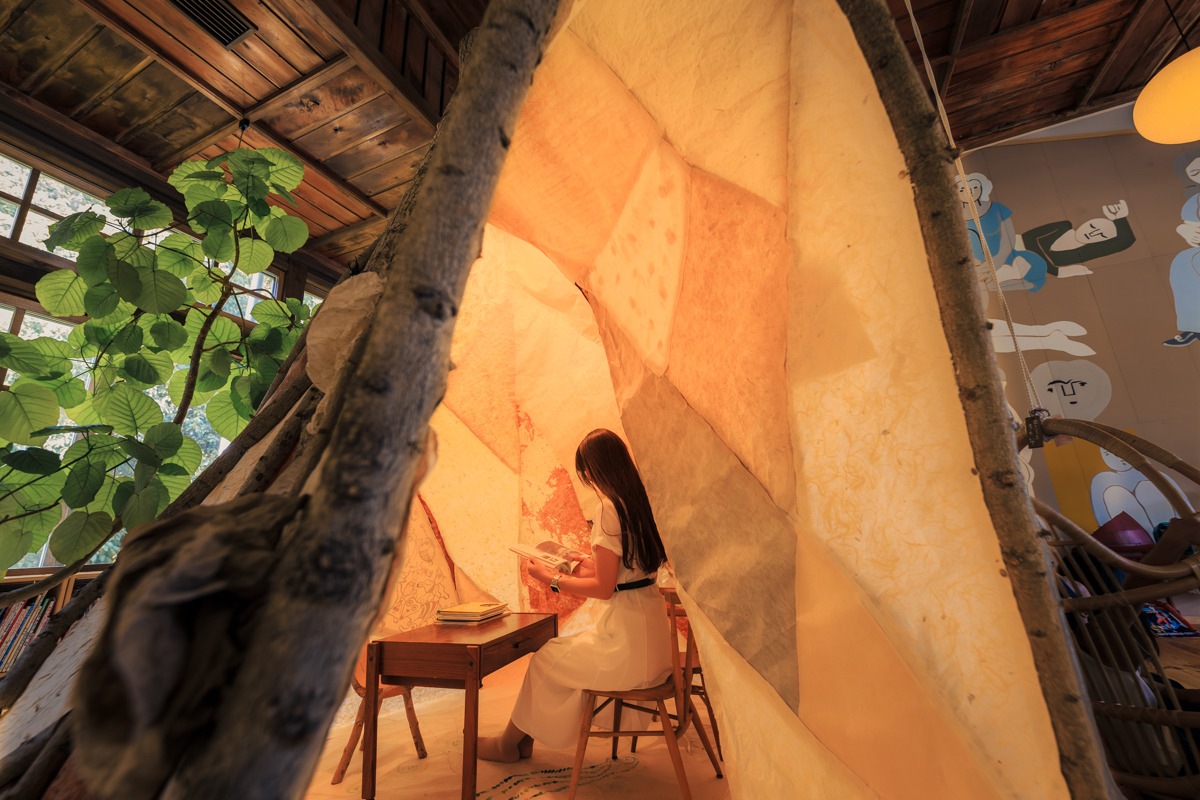現在は子どもたちが自由に本を楽しめる「子ども図書館ほたる」として利用されています。もちろん、大学生や大人も利用可能。アンティークの椅子やハンギングチェアなどが配され、おしゃれなカフェのような雰囲気と子どもがワクワクする要素が共存する空間です。
