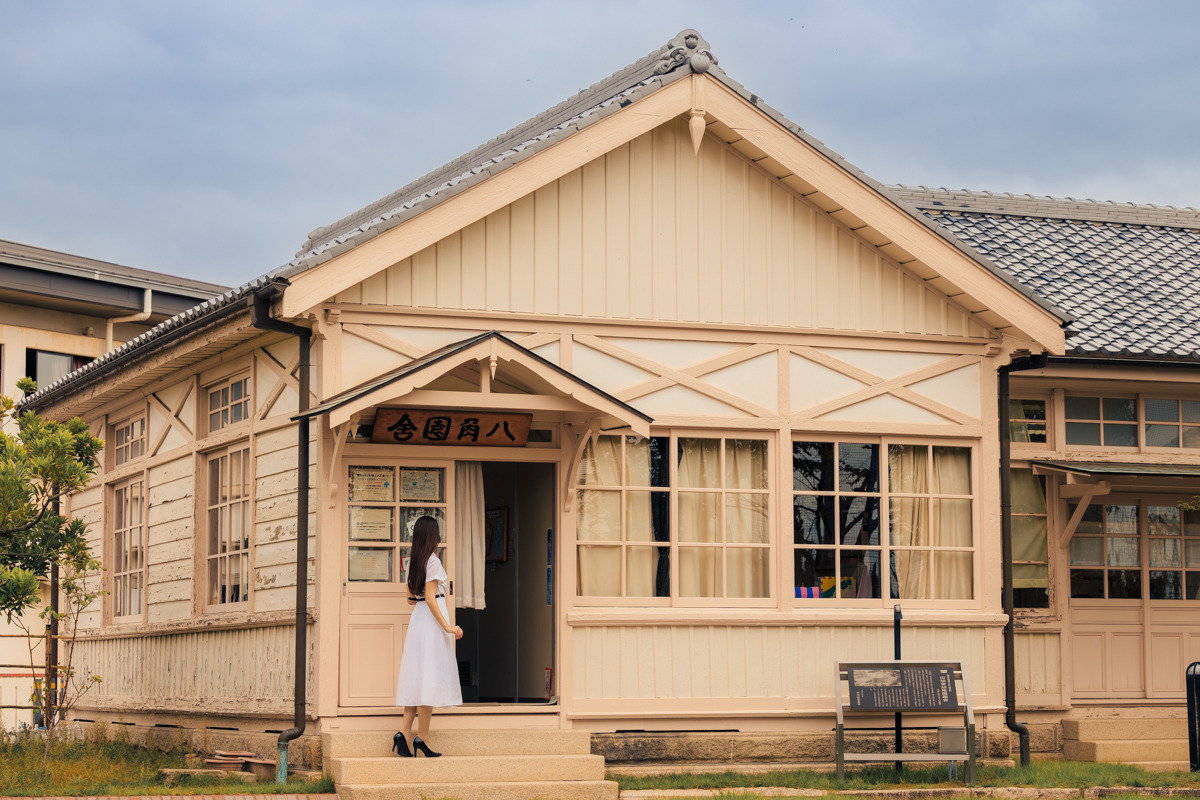 構造は木造平屋瓦葺で、中央に正八角形の遊戯室、その四方に切妻造りの保育室が取り付けられた「梅鉢型平面」が特徴です。八角形という形状は世界的にも珍しく、日本の近代教育建築史において貴重な存在です。外観は明治時代の初期にみられる擬洋風建築で、白い壁に桃色の木製の扉や窓枠が、温かみのある美しさを醸し出しています。移築復元後の現在は、絵本やおもちゃなどが用意され、歴史的な文化財を楽しみながら子どもたちも安心して利用できる空間となっています。