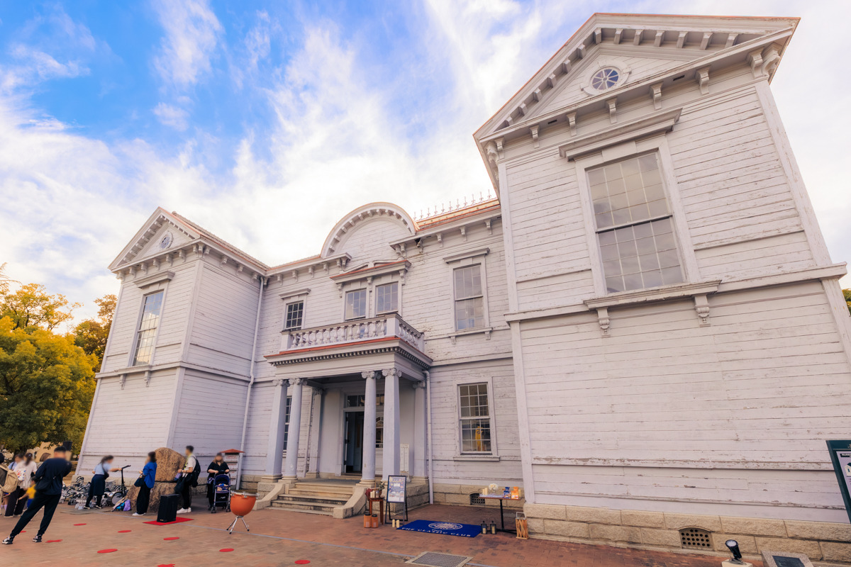 「旧岡山偕行社」は、1910年(明治43年)に陸軍将校の社交場として建てられた建物です。偕行社は全国の師団所在地に設けられた軍人クラブで、将校たちの親睦を深めるとともに、軍事研究や教養向上の場として利用されていました。岡山の偕行社も第17師団の将校たちが集った場所です。建物は寄棟造・桟瓦葺で、正面のベランダをイオニア式風の柱が優美に支えています。明治後期を代表する近代洋風建築として、現在は登録有形文化財に指定されています。訪れたこの日はイベントが開催され、多くの人で賑わっていました。