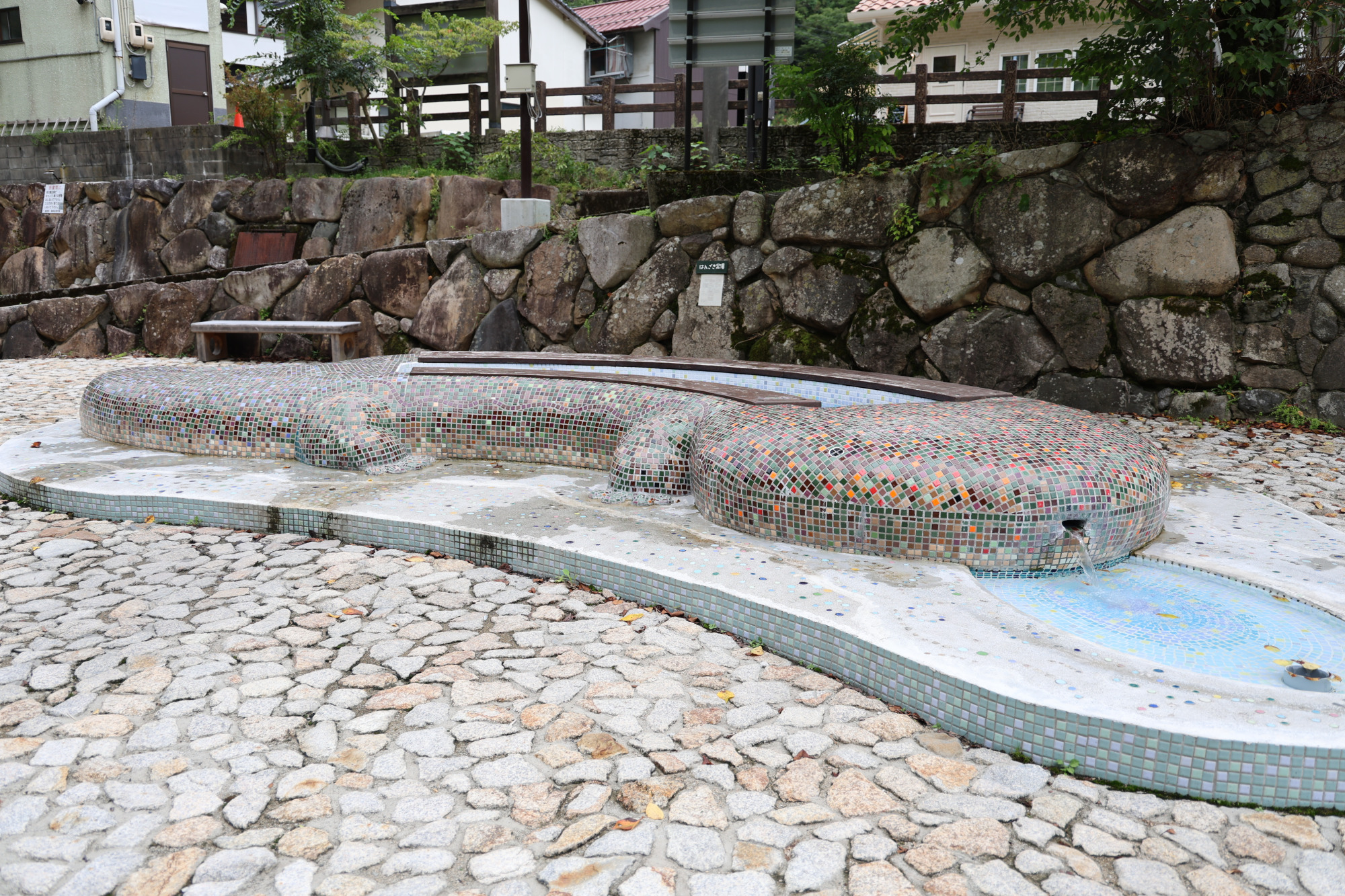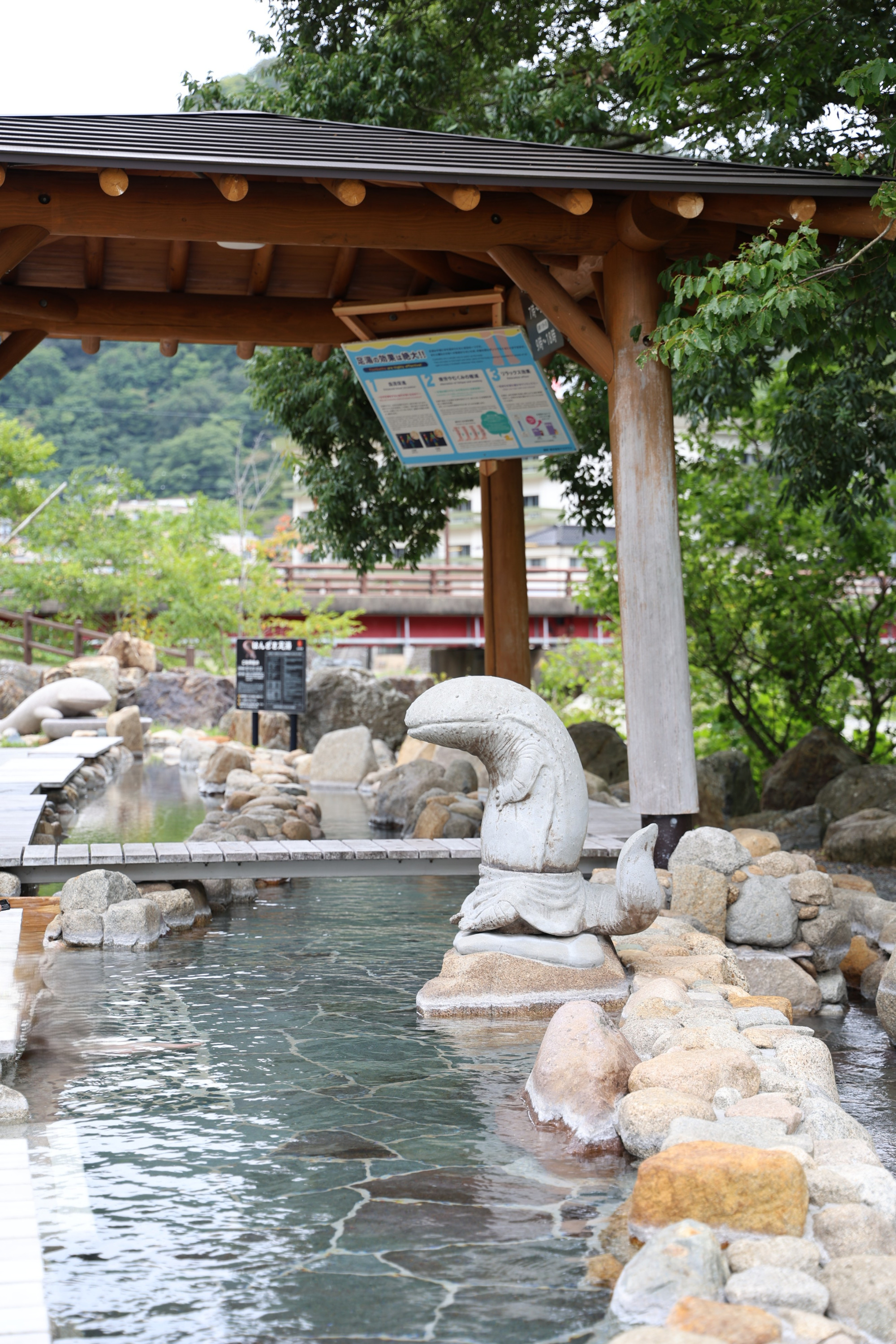 湯原温泉の玄関口に位置する足湯公園は、総幅延長約26メートルの“はんざき足湯”です。はんざきとは国の特別天然記念物のオオサンショウウオのことで、半分に引き裂かれても生きているという言い伝えから、そう呼ばれています。湯原温泉で「はんざき」はシンボルマスコットになっており、足湯公園では2016年から3年ごとに開催されている「美作三湯芸術温度」の2019年開催時の作品、「はんざきさん湯冷め姿」のオブジェがお出迎えしてくれます。