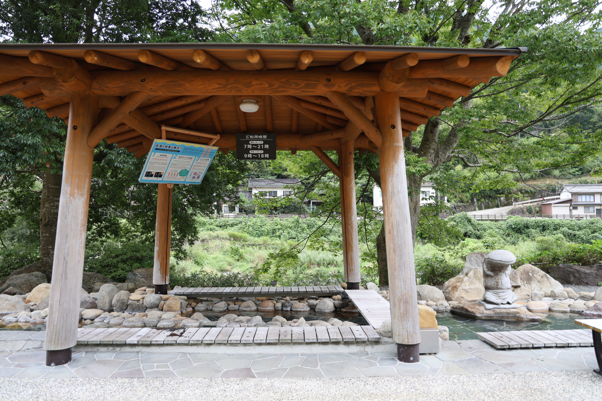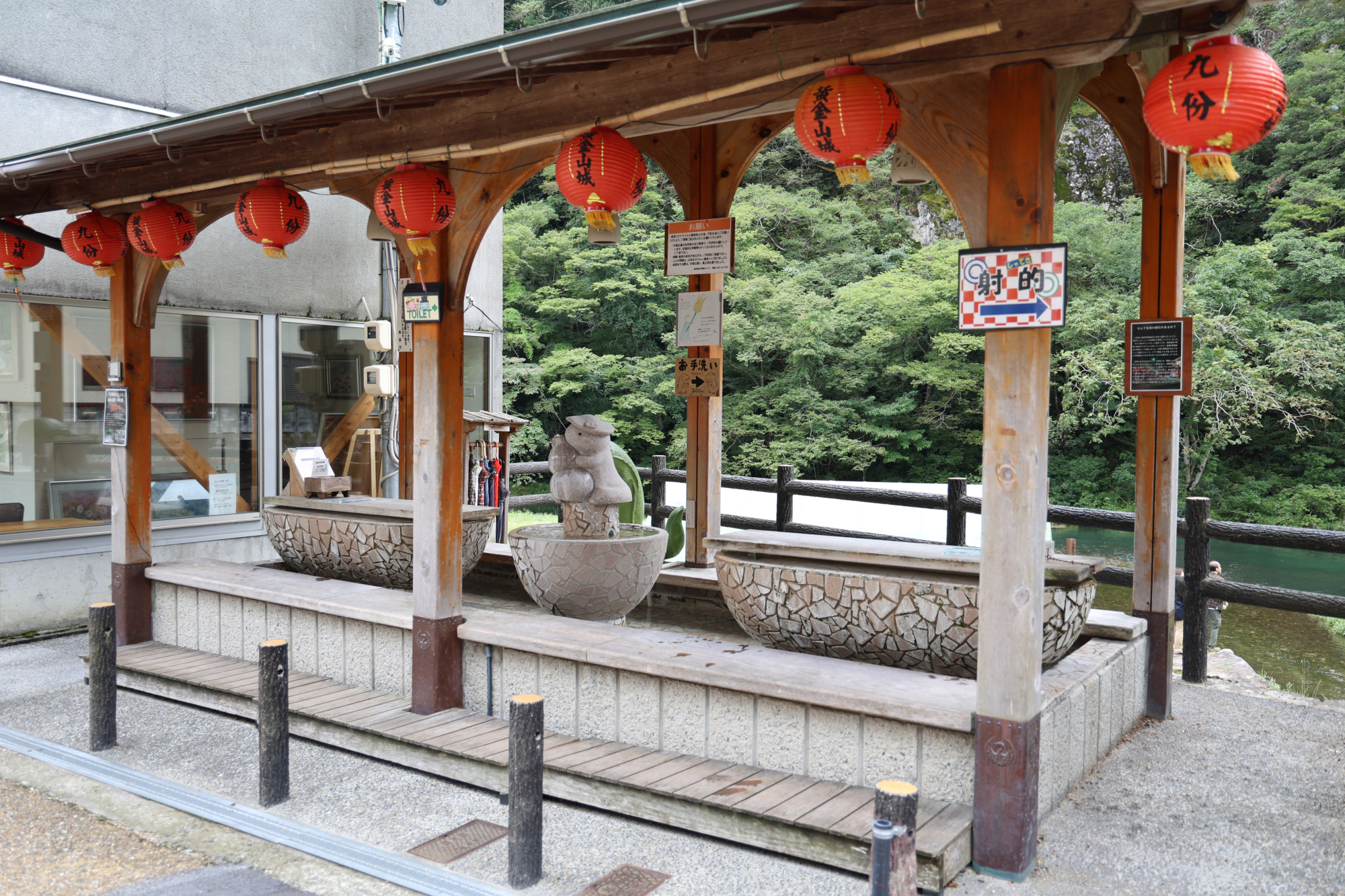 湯原温泉街のちょうど真ん中あたりに、手と足を浸けられる手湯足湯があります。台湾の観光地のような雰囲気で、気軽に座って手足を温泉に浸けることができます。湯元からも近いため、お湯の温度が少し高いような気がしましたが、すぐに慣れて心地よくなりました。施設の下は清流が流れていて、こちらも目の前の山の自然を眺めながら、川音を聞きながら温泉気分を味わえます。