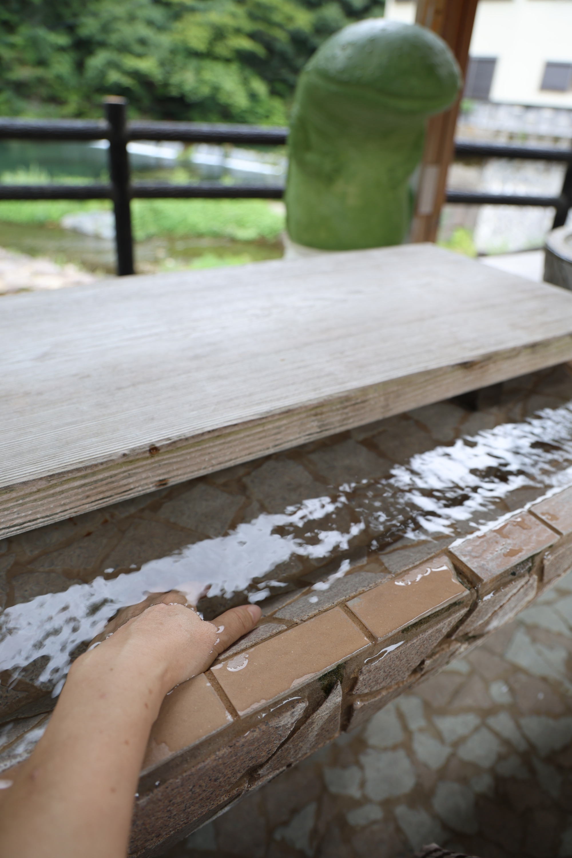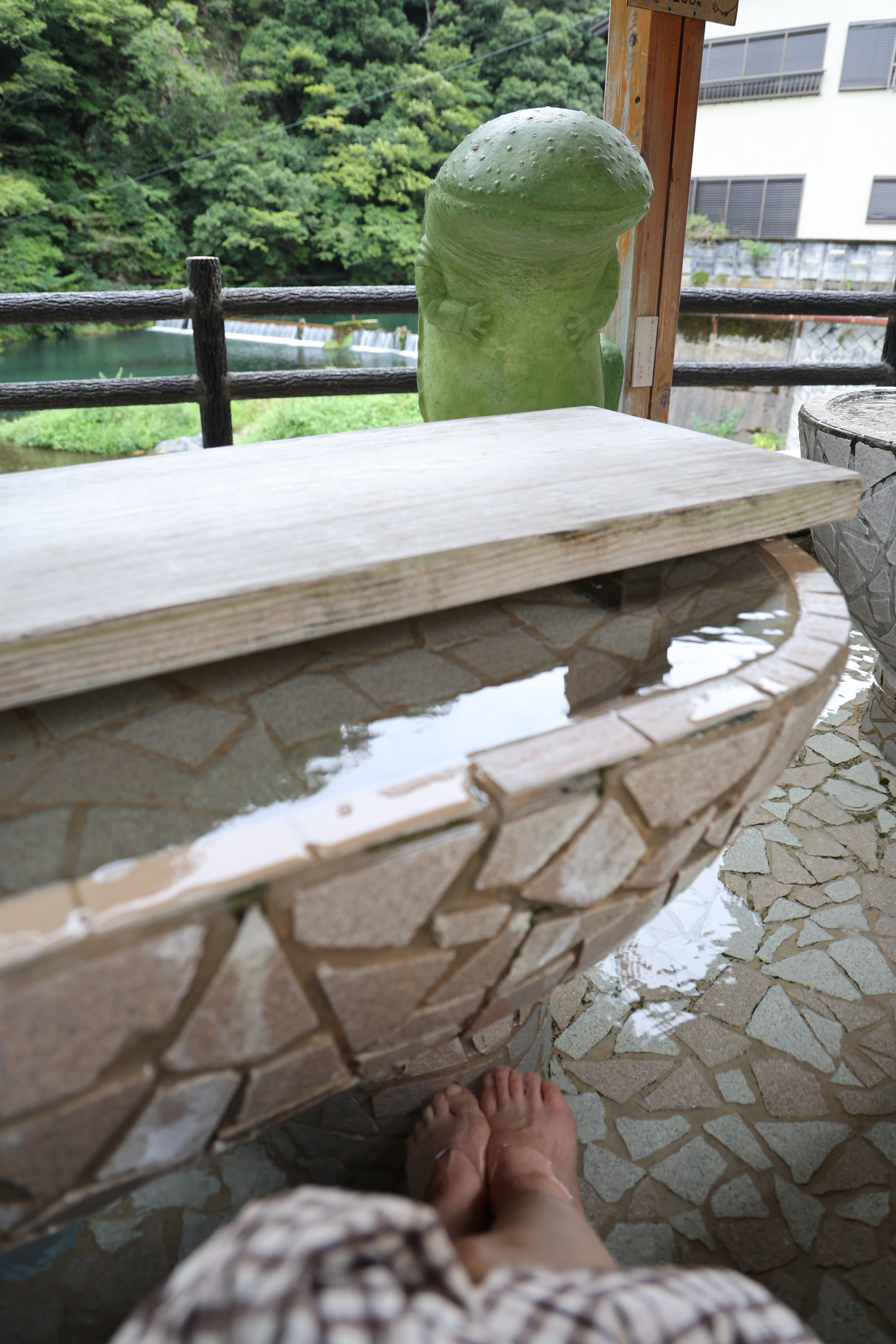 河川敷の駐車場のエリアにある「はんざき足湯」は、少し温めのお子様でも平気な温度です。はんざきの形をした足湯では、目の前の清流が自分の目線で流れていて、自然の中にいる感じがしました。人慣れしたアヒルが近くを歩いていたり、野鳥も飛んできたりと、自然に囲まれた環境です。気持ちよさそうに足湯をされていた方に写真のモデルに協力いただきました。