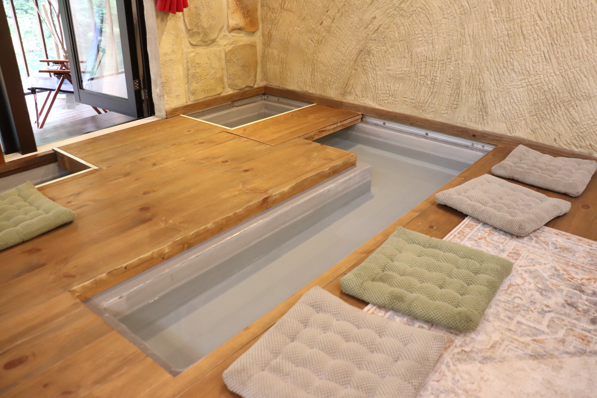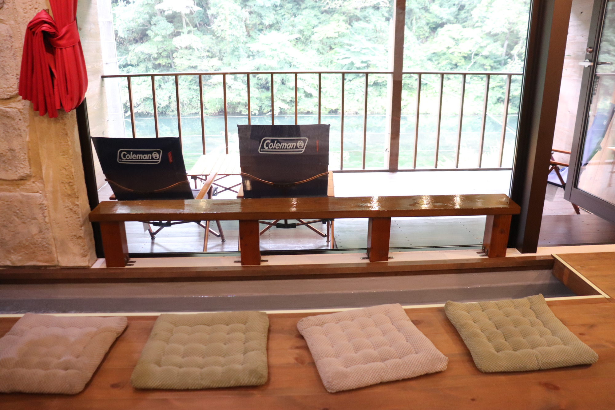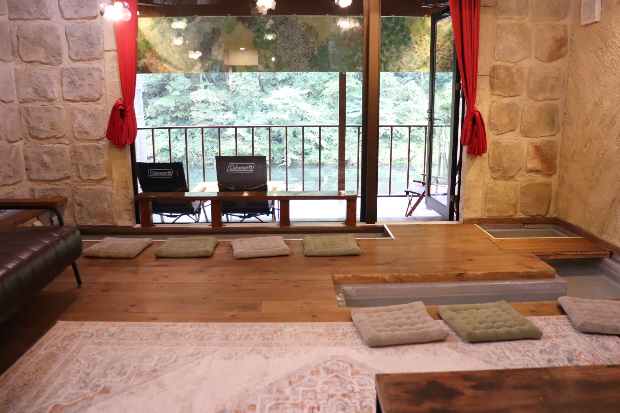 湯原温泉には、1日1組限定で1棟貸し切りできるゲストハウス「YUBARA BASE」もあります。部屋の中を温泉が流れる面白いスタイルにいなっていて、宿泊者専用の源泉かけ流し温泉付きの足湯があり、インバウンドのお客様にも人気だそうです。宿泊すると写真のような癒しの絶景がいつでも楽しむことができます。部屋の中で足湯を楽しみ、眠くなればベッドルームに行って深い眠りに落ちれそうです。