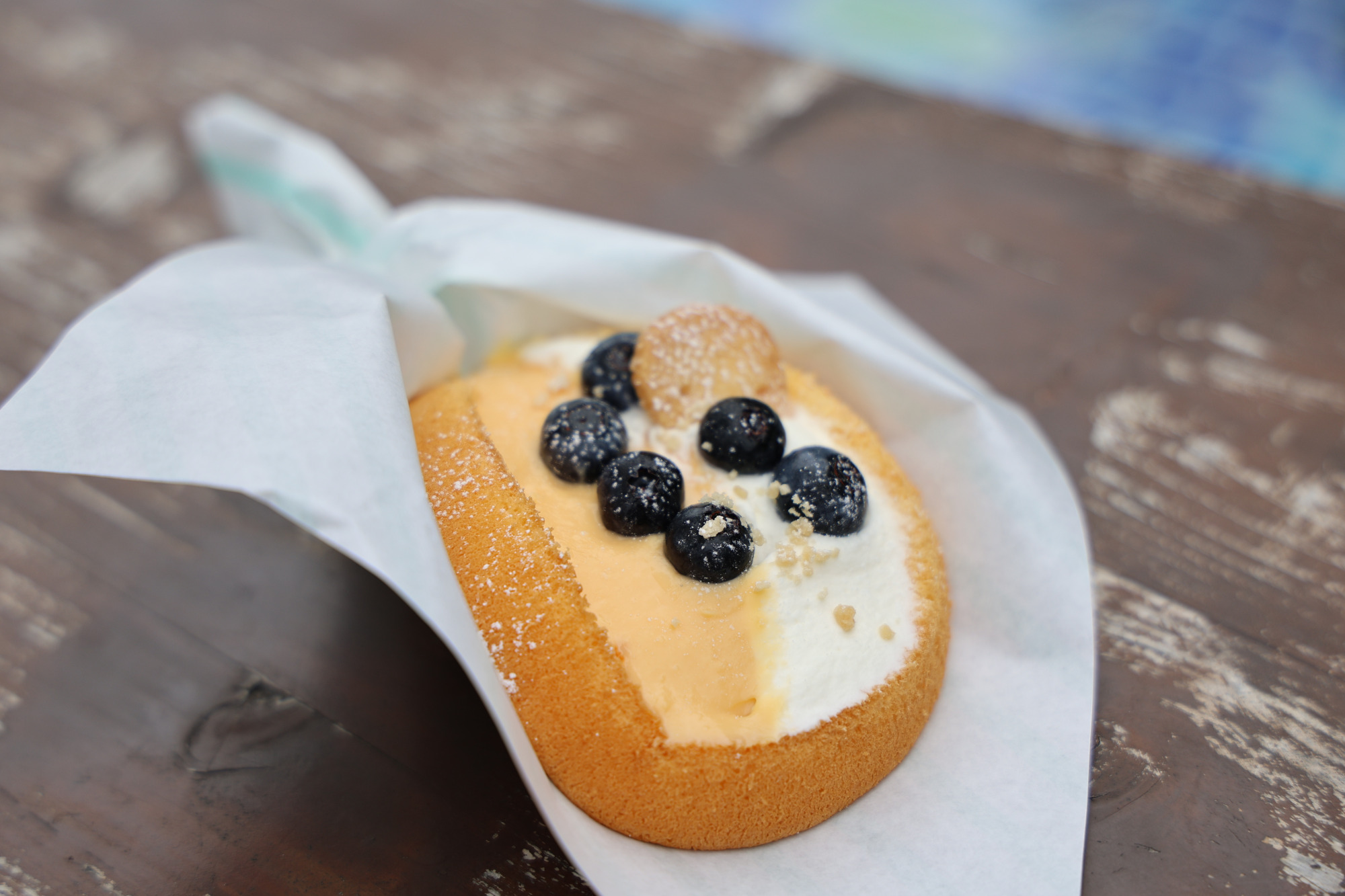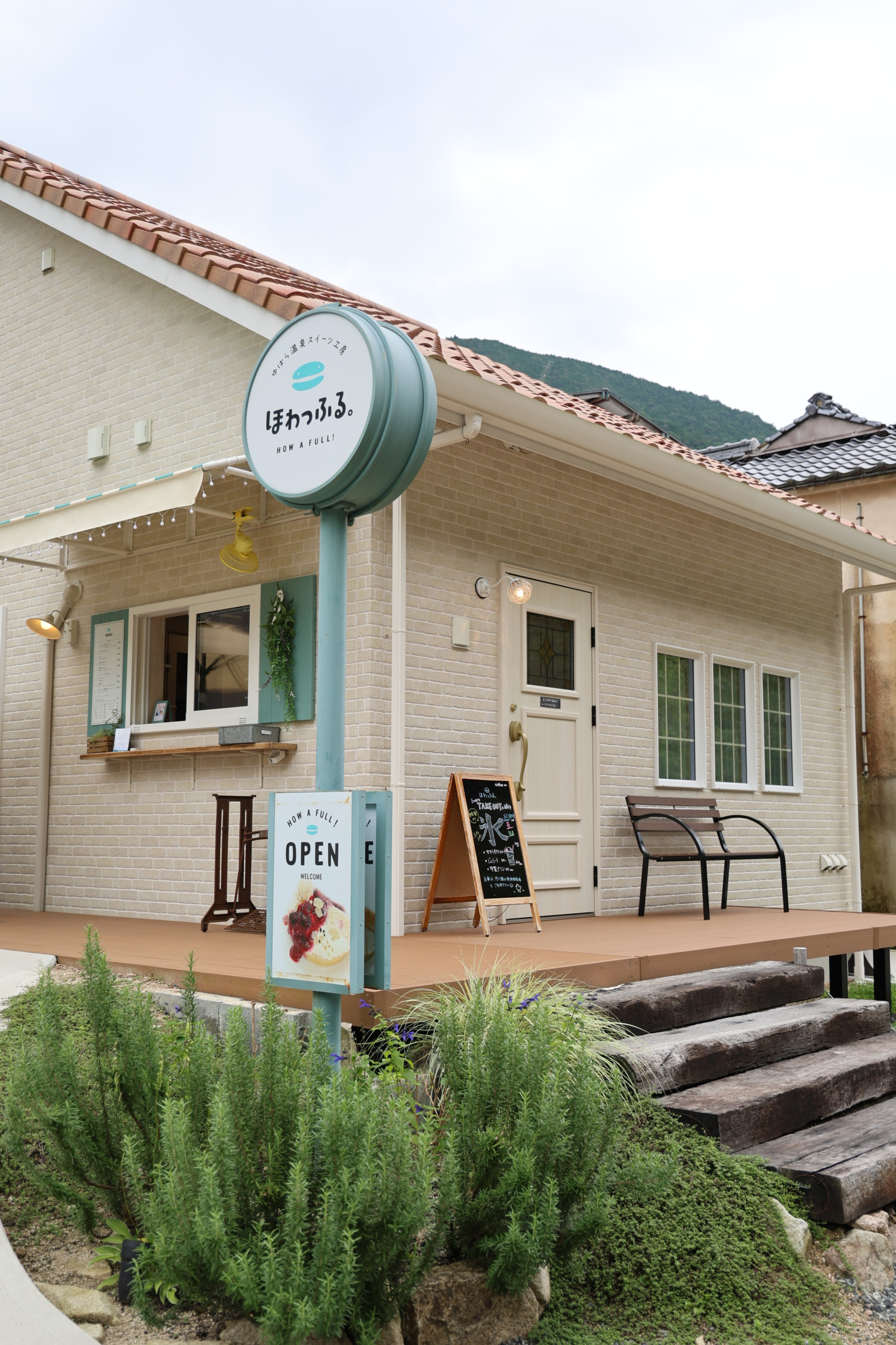 川沿いのかわいいお店「ほわっふる」で人気のワッフルをテイクアウトしました。旬の季節のフルーツを使ったワッフルが人気だそうで、取材で伺った時期はブルーベリーのワッフルがありました。カスタードのワッフルは通年であります。すぐ下の河川敷に下りれば、はんざき足湯があります。