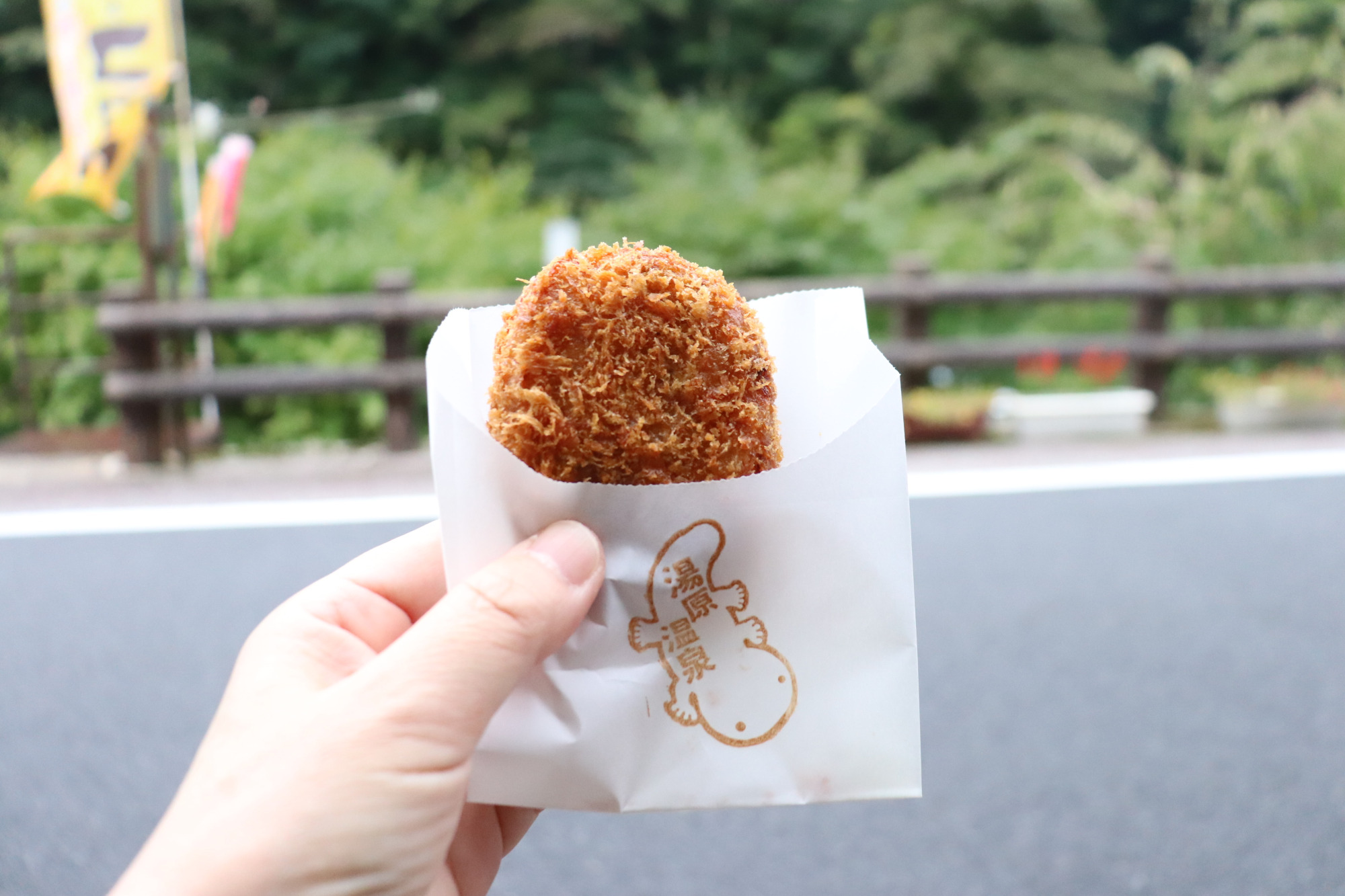 川沿いの「久本精肉店」のコロッケは揚げたて熱々ホクホクで、食欲をそそります。平日のみの販売ですが、コロッケ片手に足湯もサイコーでした。