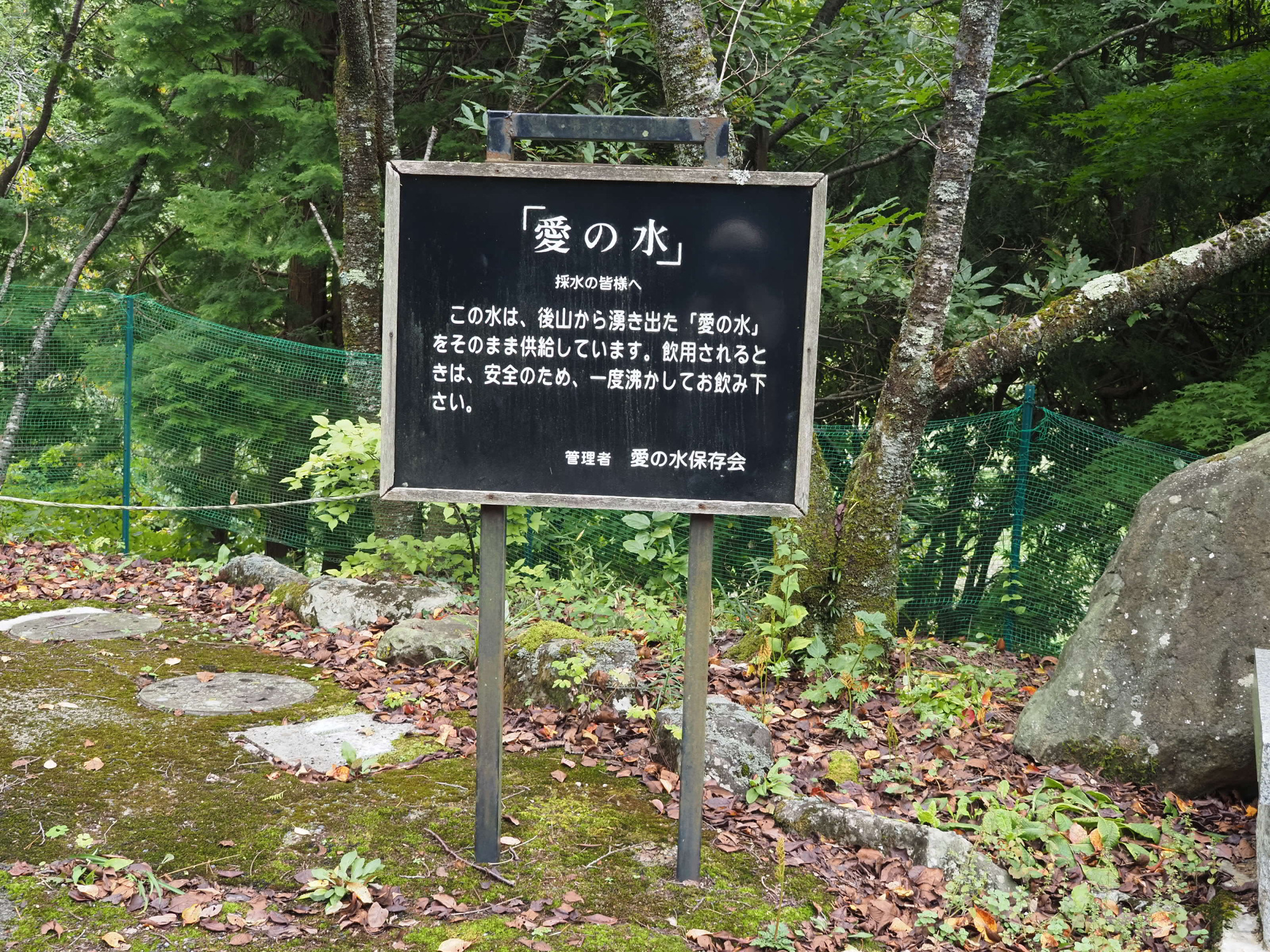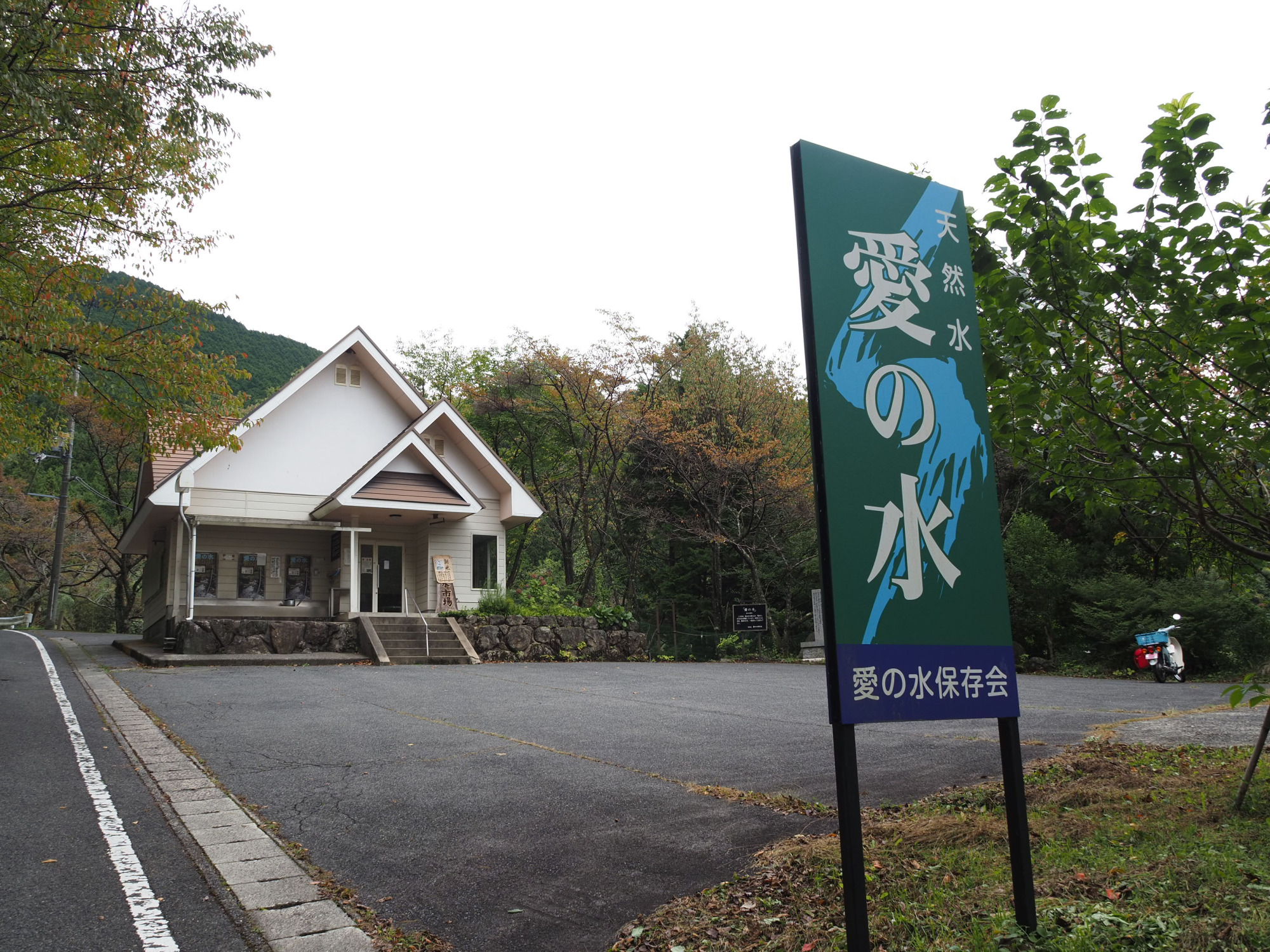 まず向かったのは「愛の水給水施設」。後山の山麓に湧き出る天然水で、県内はもちろん、遠く関西からも多くの人がこの水を求めて訪れるという名水スポットです。20リットル100円で持ち帰ることもできます。