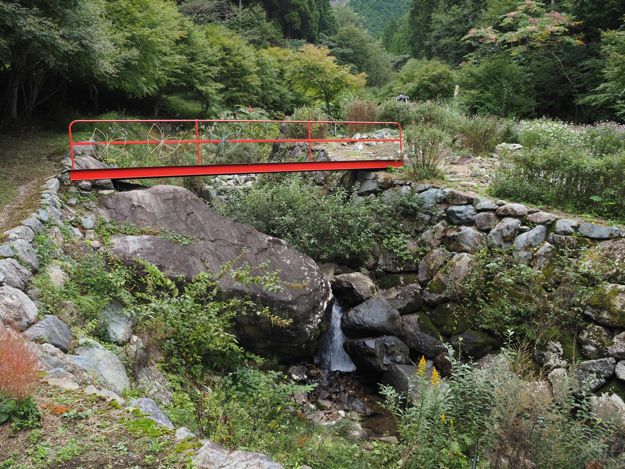 周辺には、海を越えて旅する蝶・アサギマダラを呼ぶフジバカマが植えられ、美しい花畑が広がっていました。可愛らしいちょうちょがデザインされた橋も魅力的です。