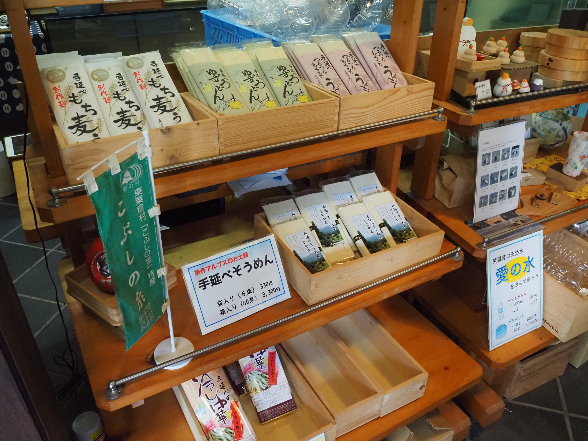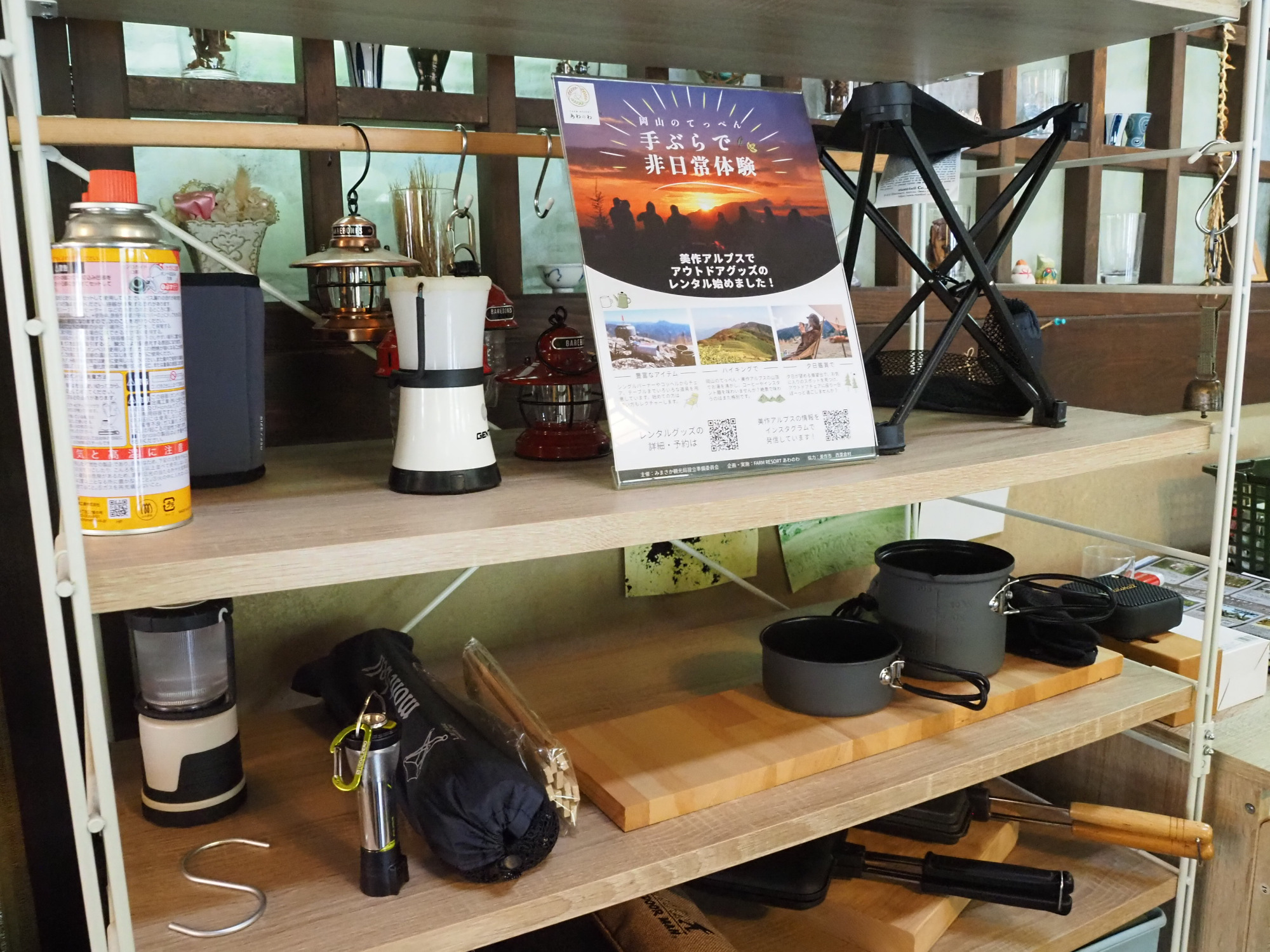 「こぶし庵」では、東粟倉名物の杵つき餅や手延べそうめんといったお土産が買えるほか、キャンプグッズのレンタルも行っています。地域の情報ステーションのような場所でした。