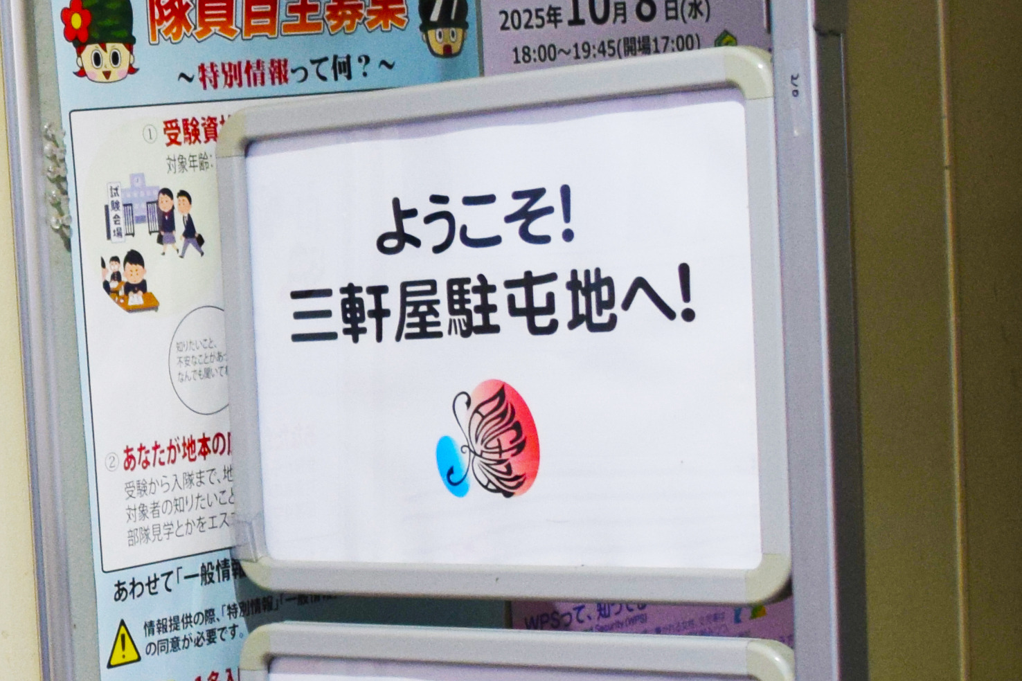 ちなみに、こちらの「ようこそ!三軒屋駐屯地へ!」の下にあるイラストは「三軒屋駐屯地」のロゴマークだそうです。一見するとアゲハチョウのイラストのように思えますが、よく注意して見ると「SANGENYA」という文字が表現されていることに気が付きます。素敵なデザインですね!様々な場所にこのロゴマークが入っているので、現地へ行ったら探してみてください。