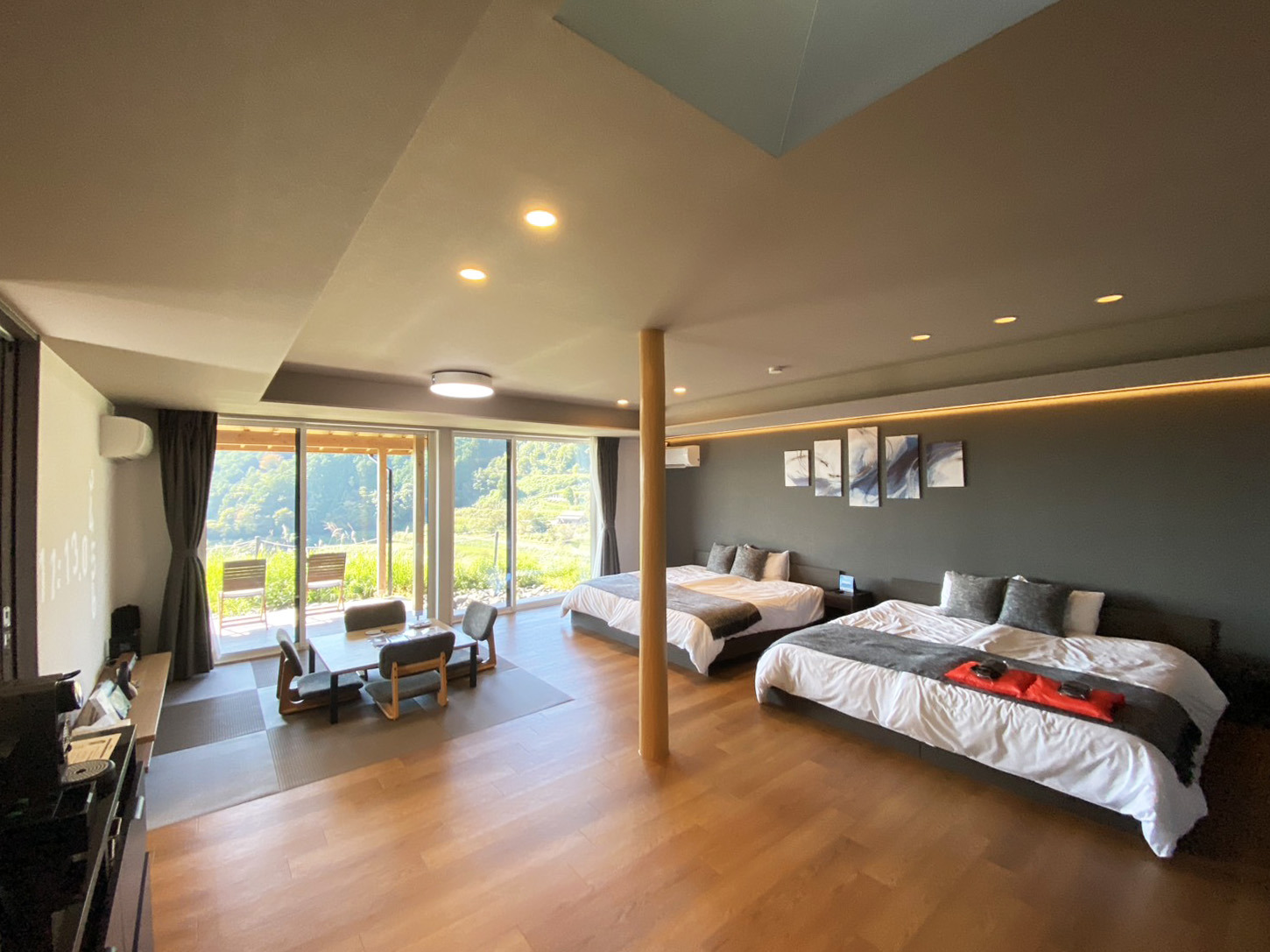 宿泊棟はプライベート感を重視した一棟貸しの「VILLA」と、3つの個室からなる「INN」の2タイプ。どの部屋からも、棚田の絶景を心ゆくまで眺めることができます。