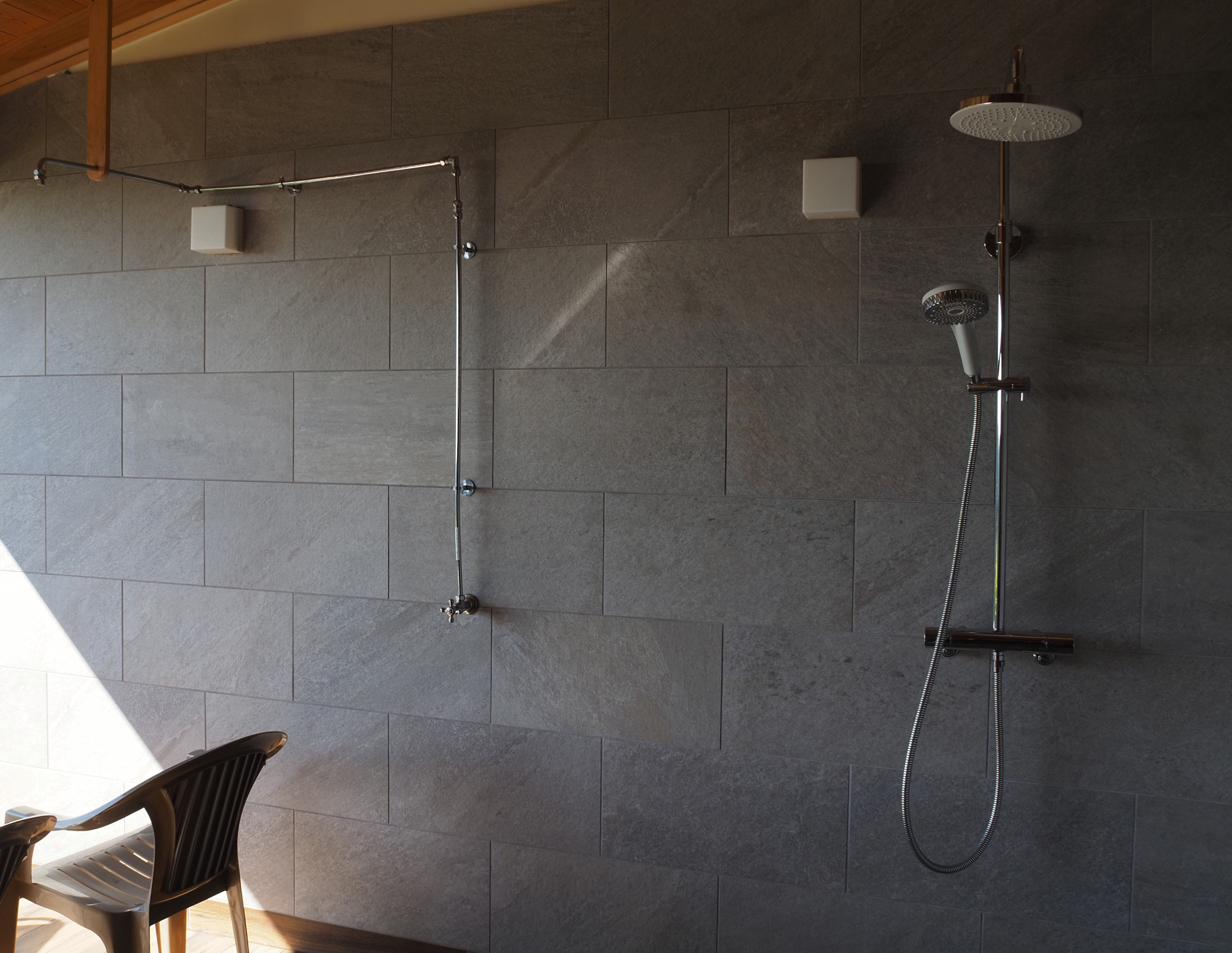 体の芯から温まったら、次は外気浴へ。屋外にはシャワー、ミストシャワー、そして棚田と同じ目線に作られた水風呂が。