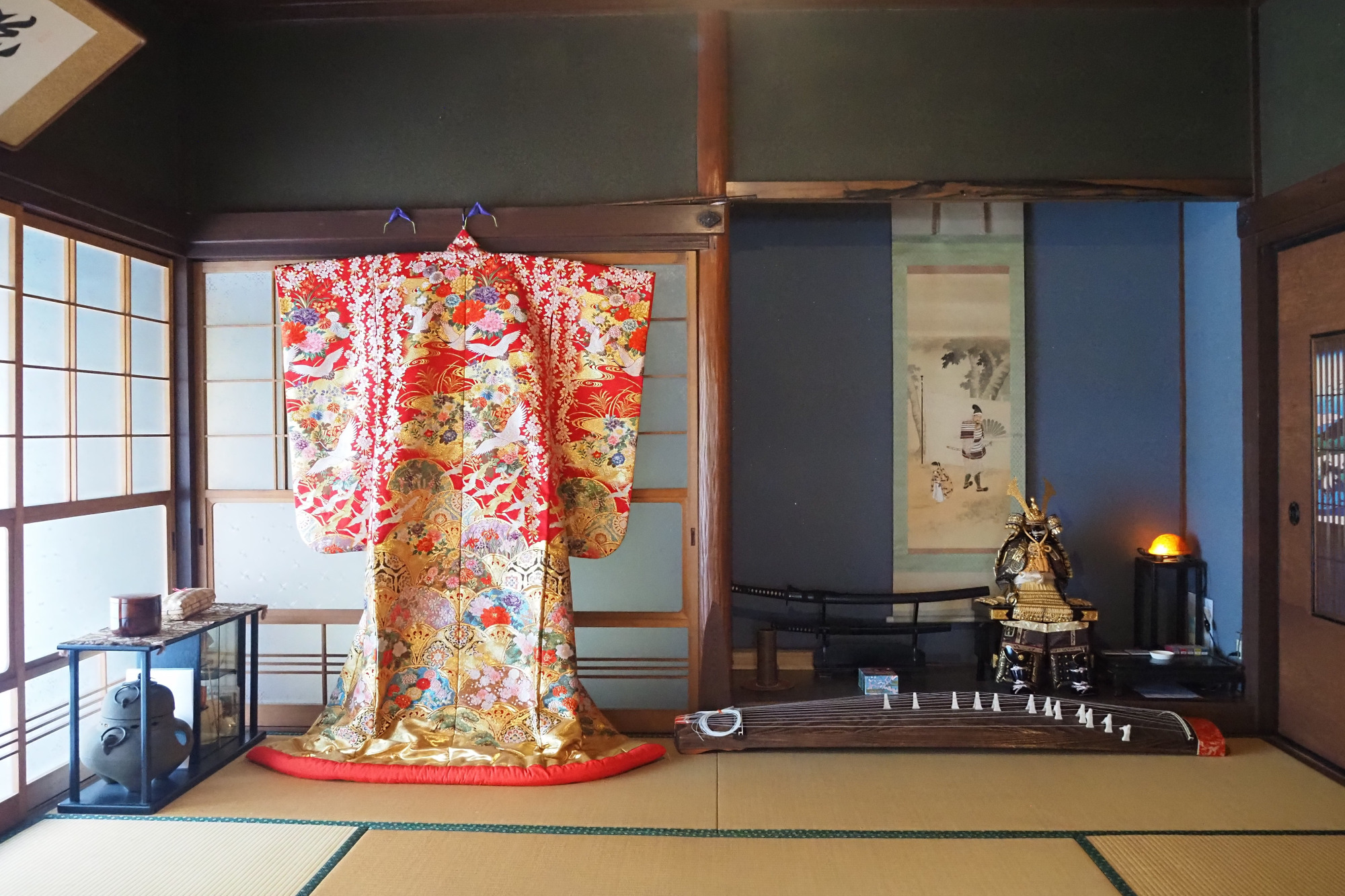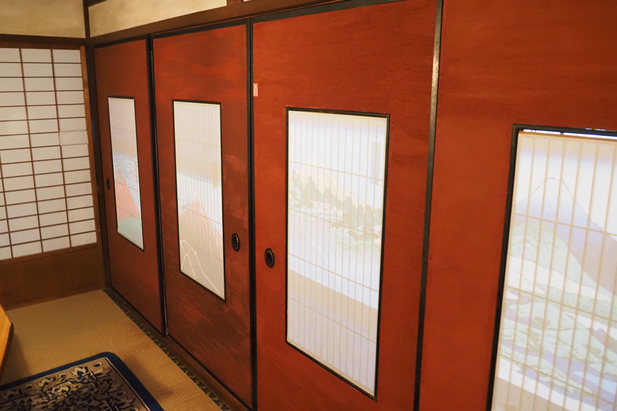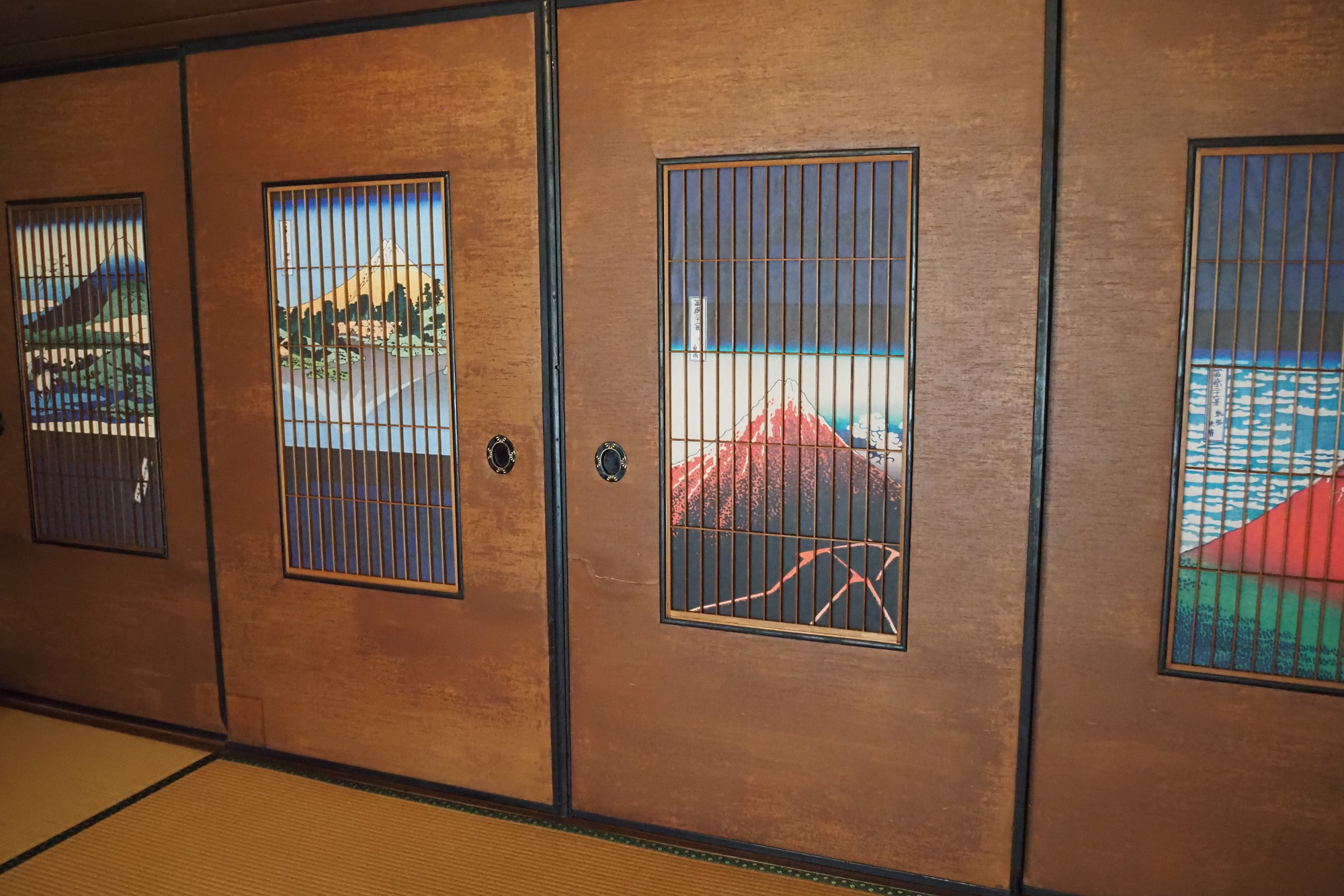 豪華絢爛な打ち掛けや五月人形が飾られていたり、ベンガラで彩られた壁があったり、葛飾北斎の浮世絵や天に昇る龍が描かれた襖があったりと、部屋ごとに異なる趣向が凝らされています。