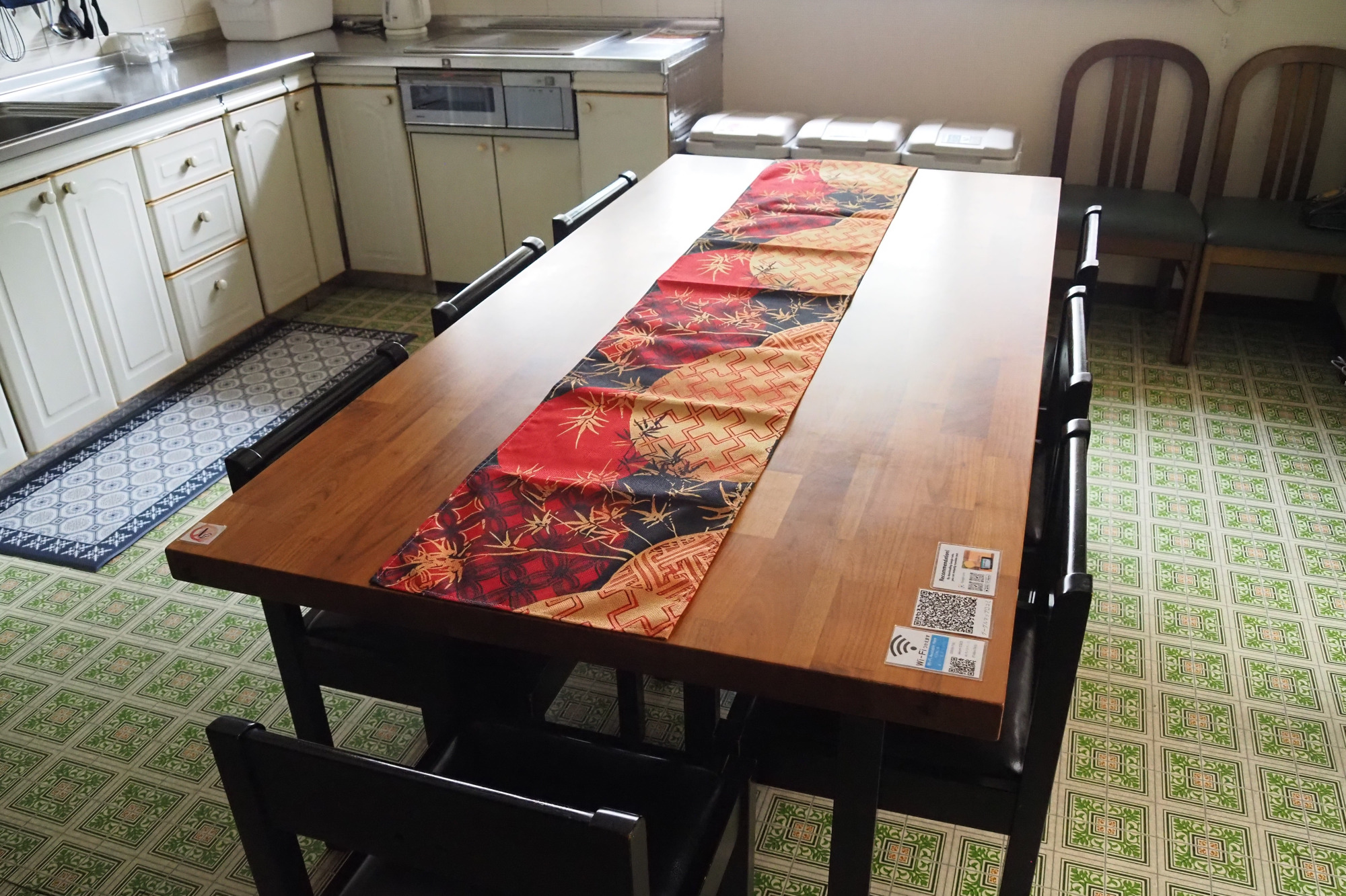 陽光が差し込む開放的な土間、自然と会話が弾む円卓のダイニングは、この宿の象徴的な空間。
