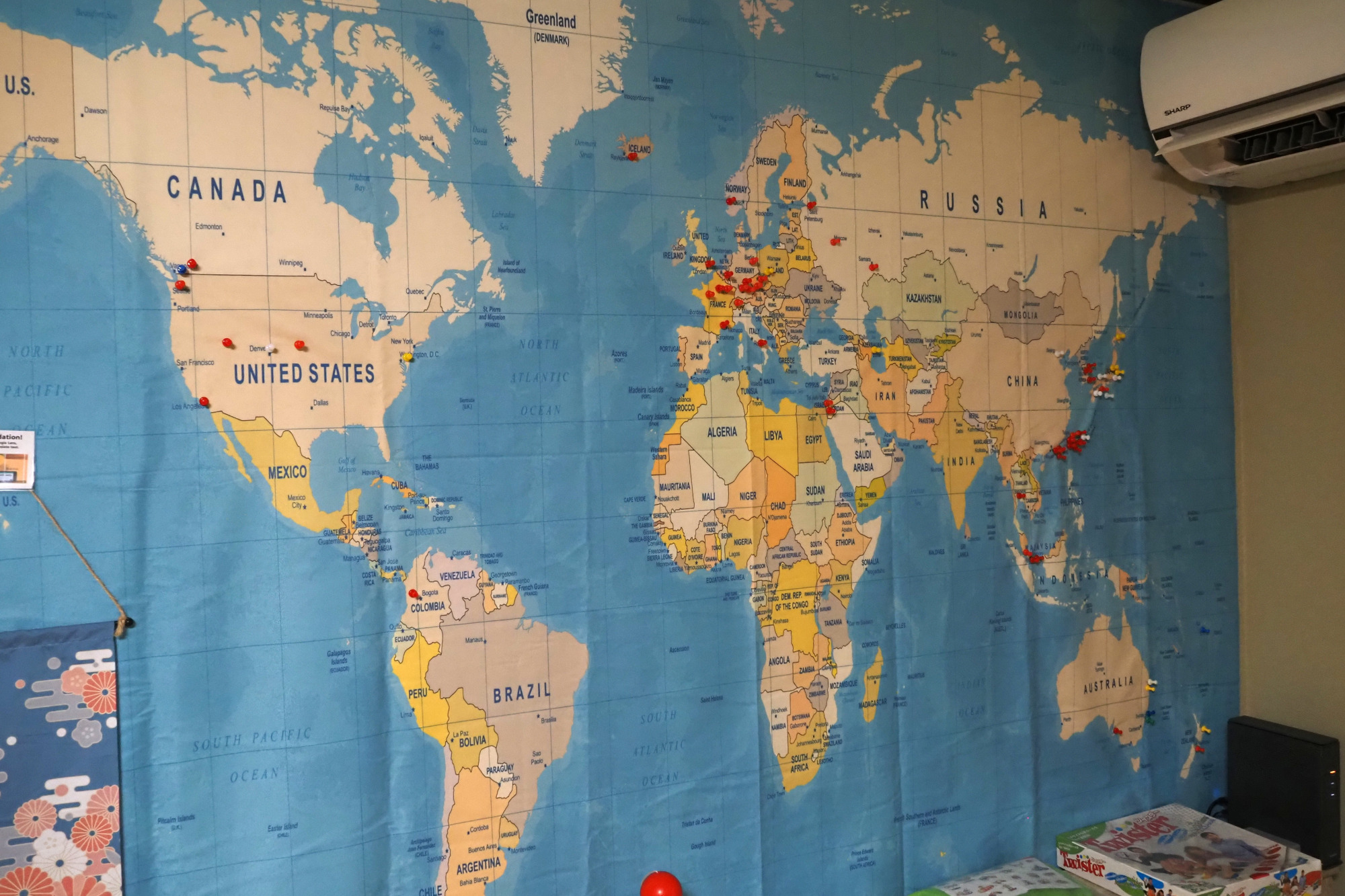 プロジェクターを備えた憩いの間には、これまで訪れた世界中のゲストの写真や国を示す世界地図が飾られ、世界各国からゲストが来ていることがわかります。
