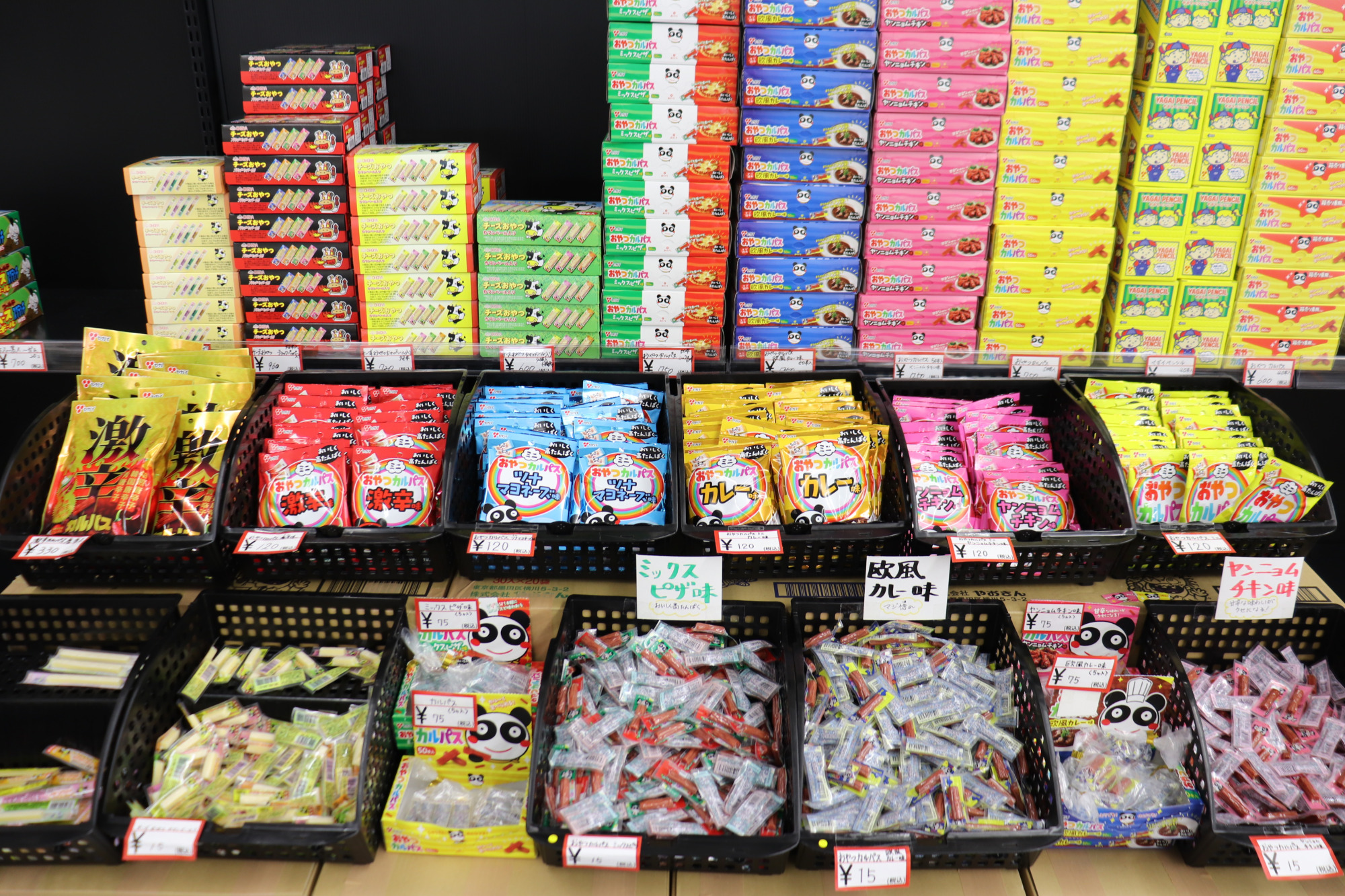 駄菓子の中でも人気ナンバー1は、おやつカルパス。バラ買いができるので、いろいろな種類を買うことができます。お子様の遠足のおやつから、大人のビールのおつまみまで楽しめそうです。