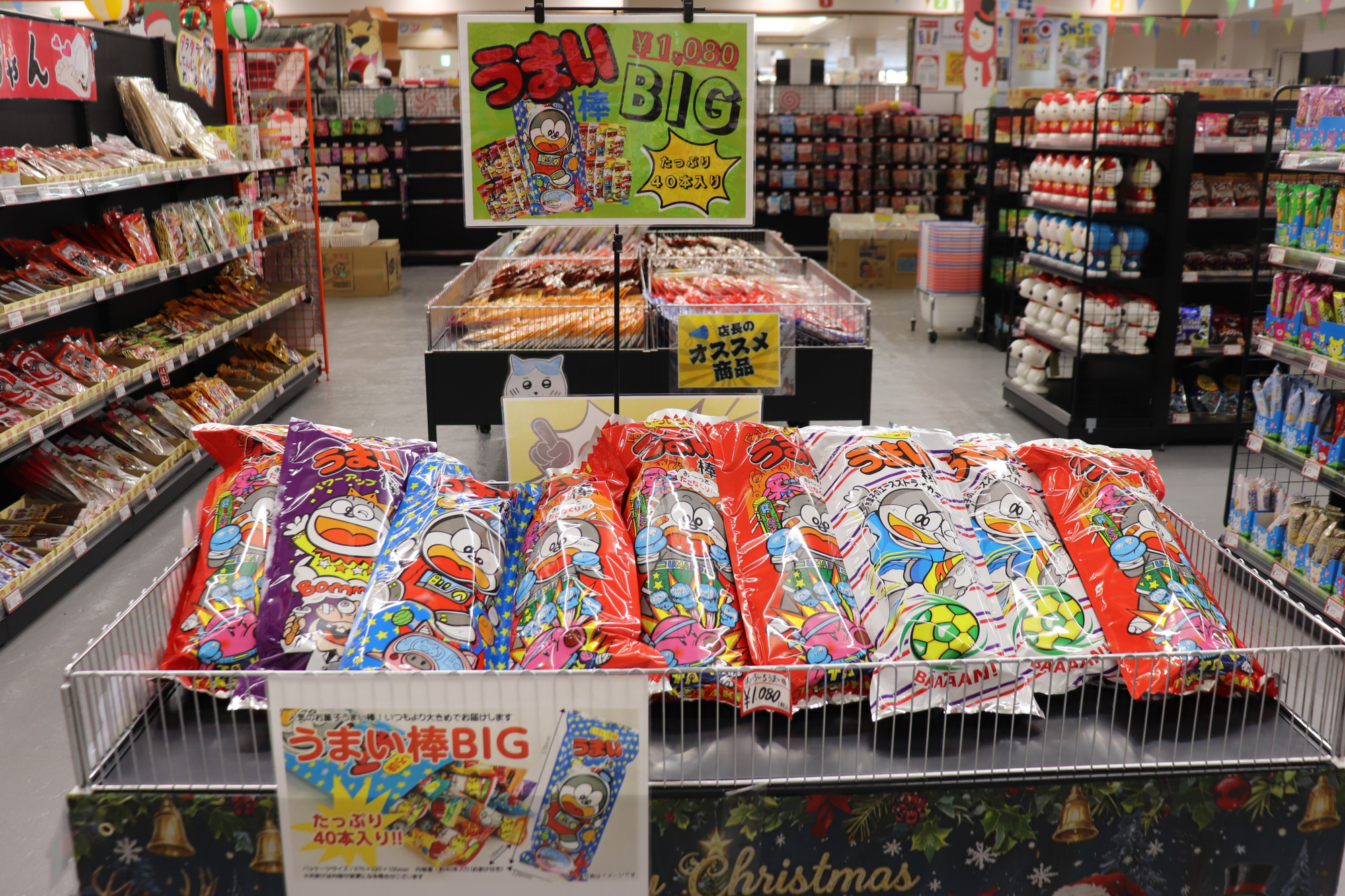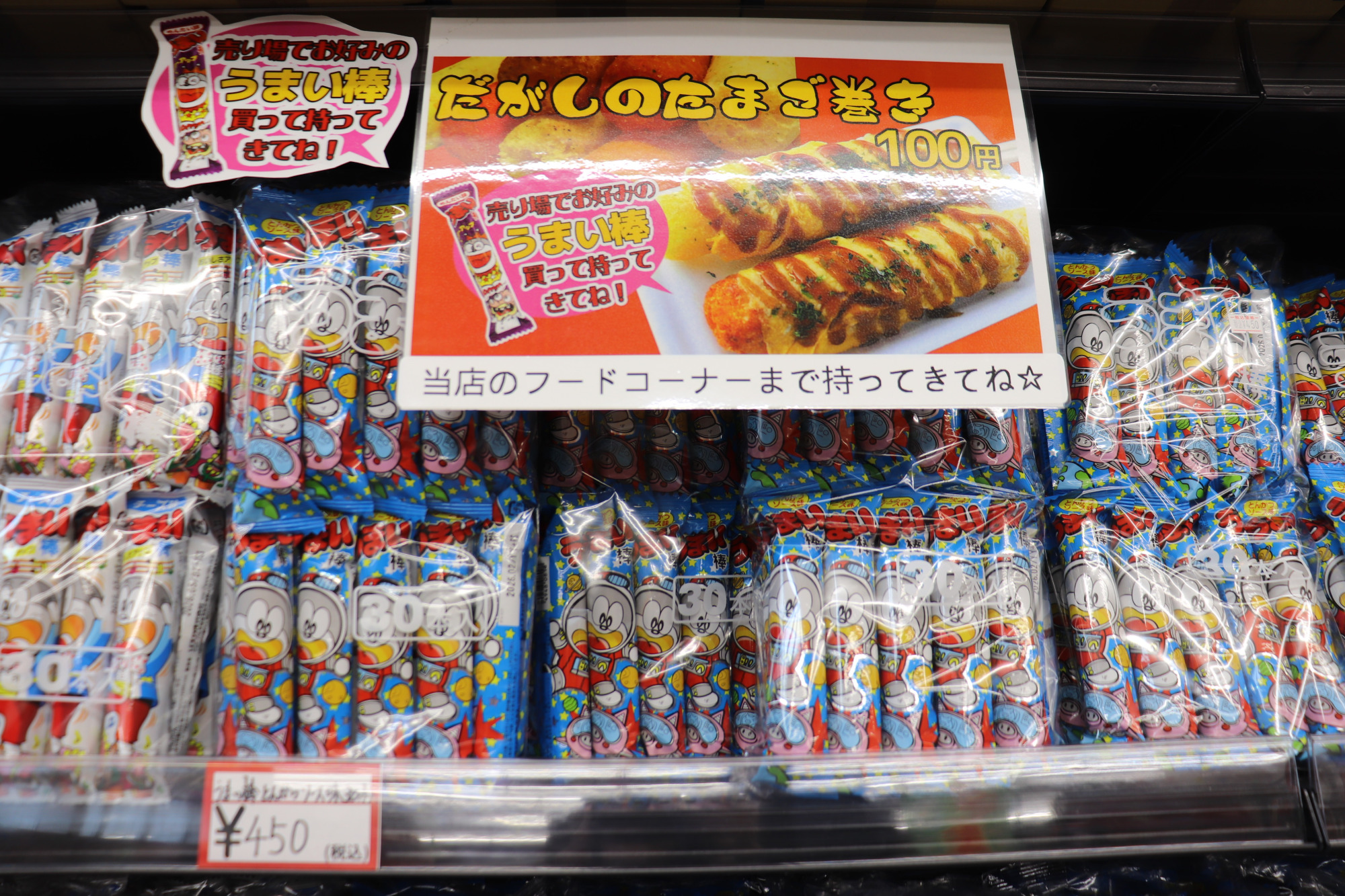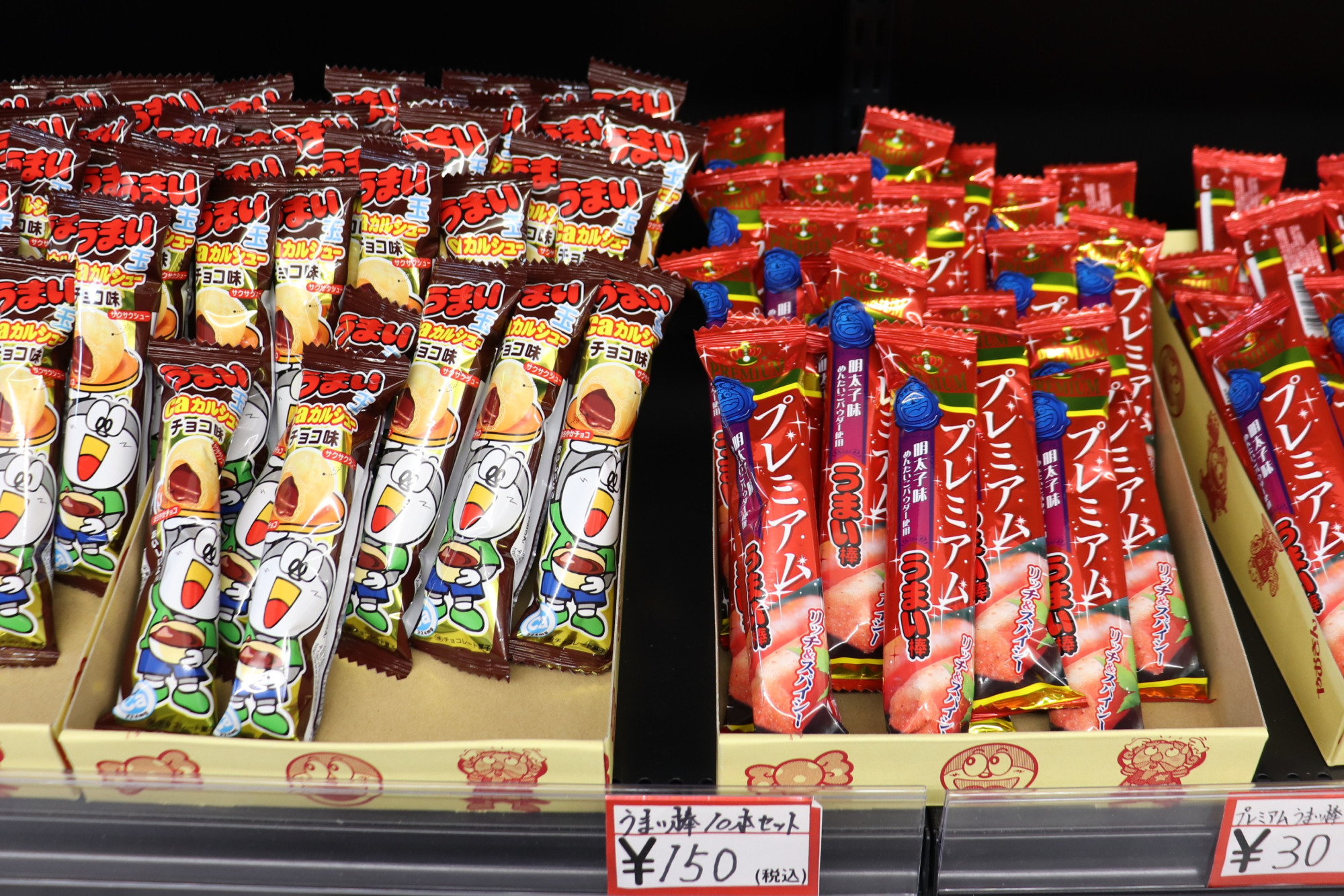 だがしランキング2位は、うまい棒です!こんなにも種類があるのかとびっくりするくらい並んでいました。こちらもバラ買いができるので、お好みの味を選ぶことができます。ゴージャス感のあるプレミアムうまい棒や、大きなサイズのビッグうまい棒など、レアなものもここにはあります。袋買いもできるので、買いだめも可能です。