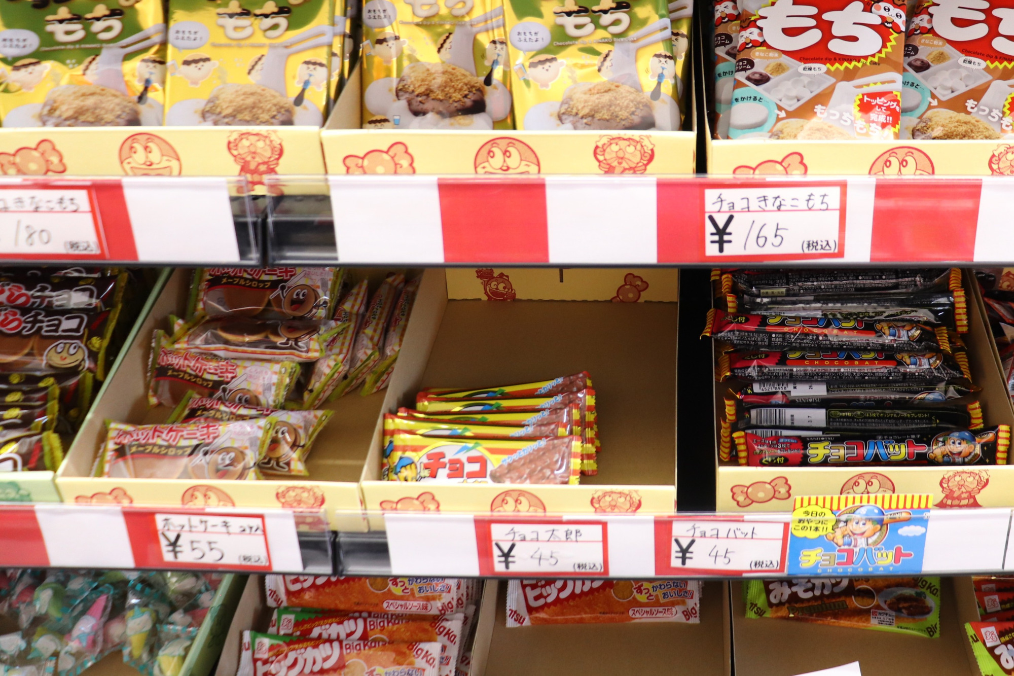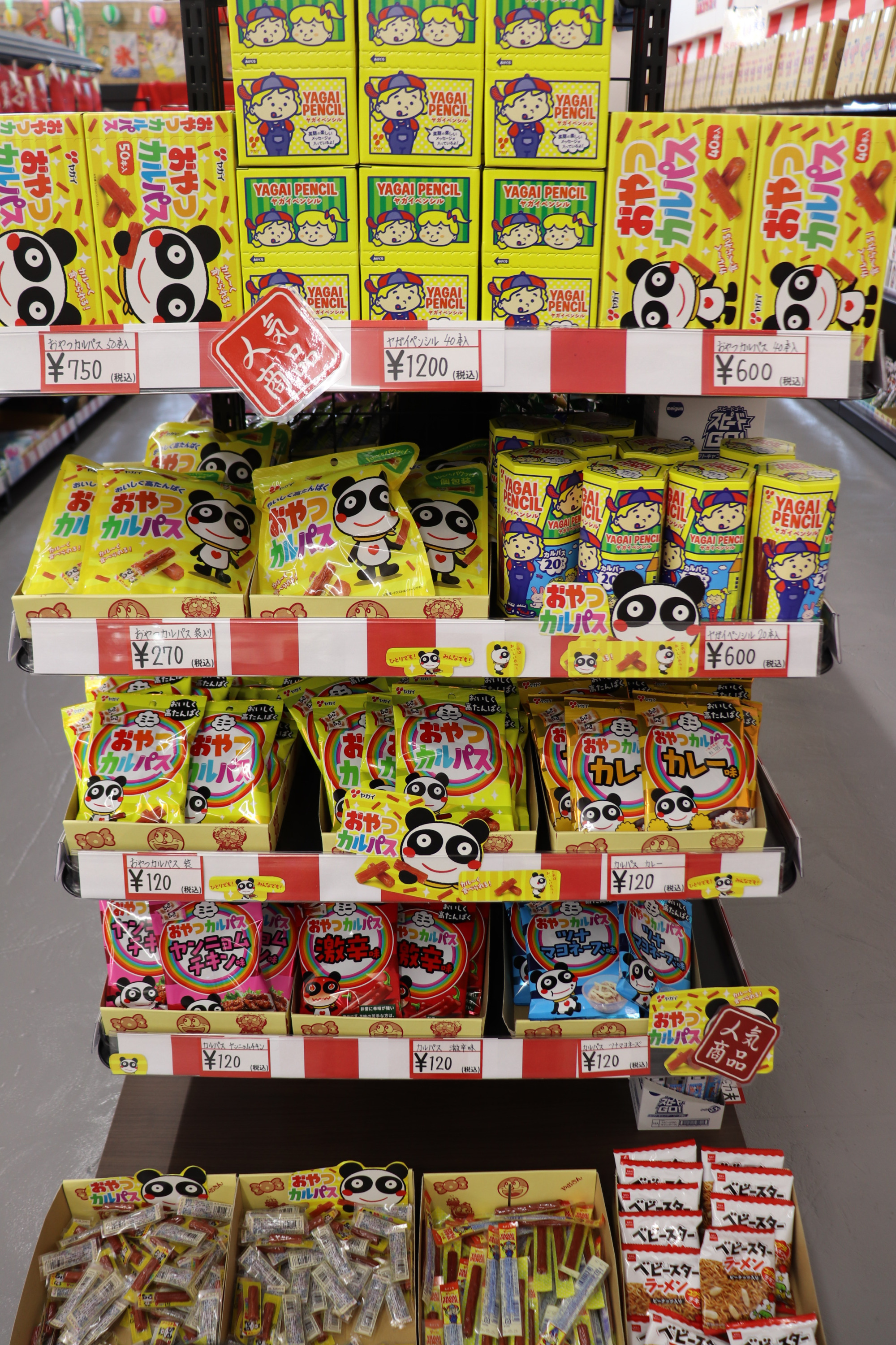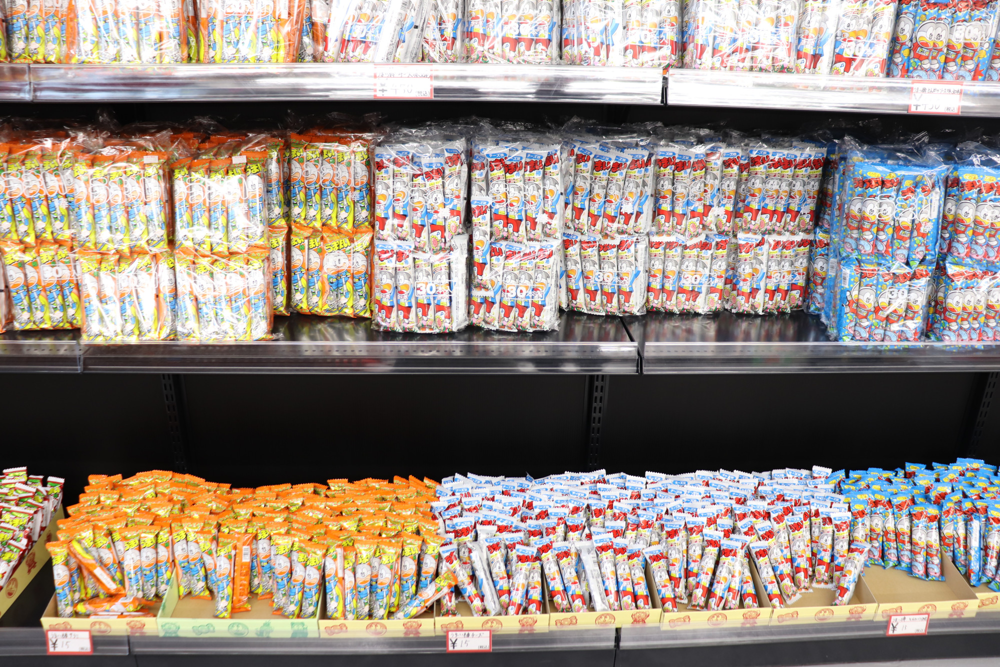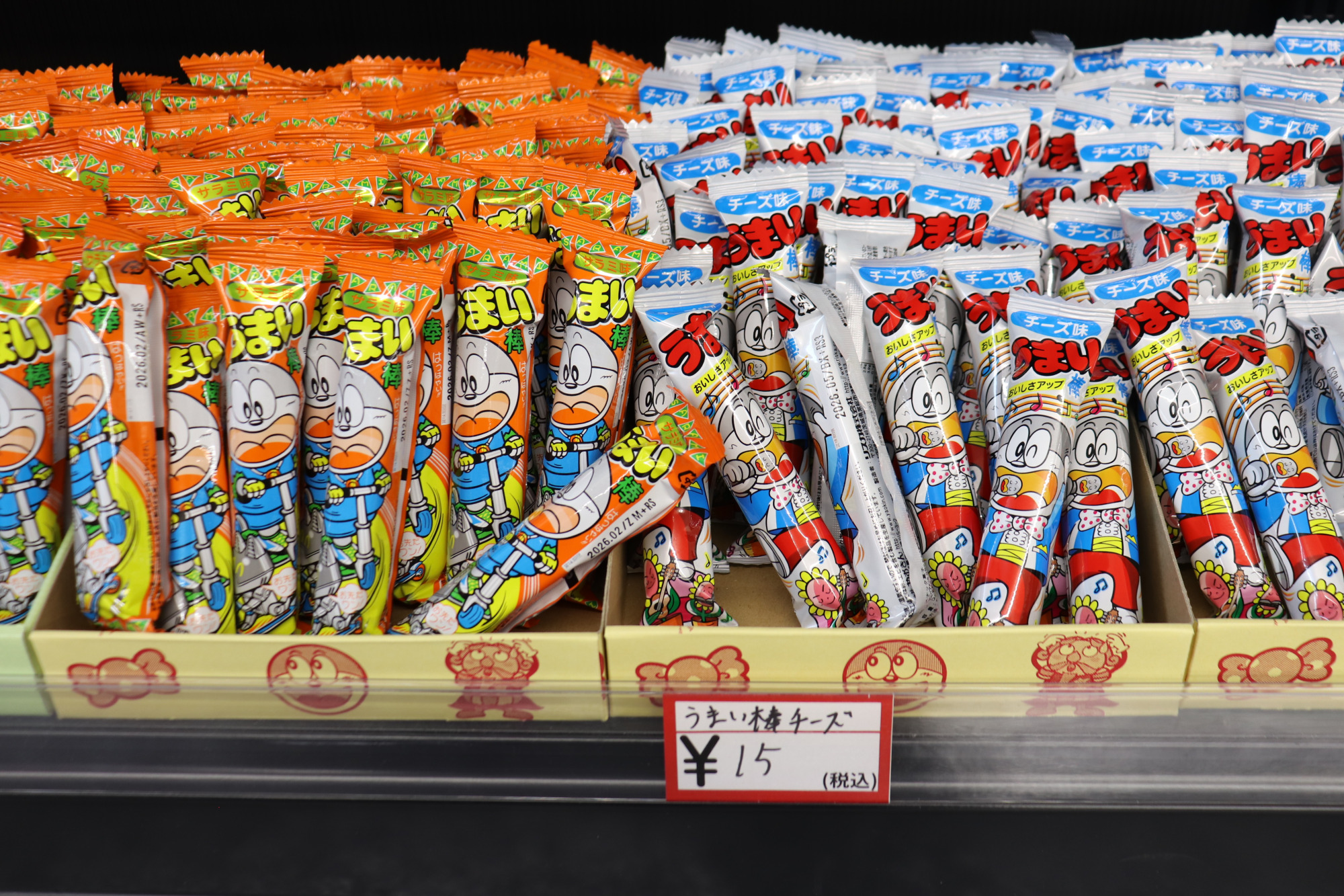 だがしランキング2位は、うまい棒です!こんなにも種類があるのかとびっくりするくらい並んでいました。こちらもバラ買いができるので、お好みの味を選ぶことができます。ゴージャス感のあるプレミアムうまい棒や、大きなサイズのビッグうまい棒など、レアなものもここにはあります。袋買いもできるので、買いだめも可能です。