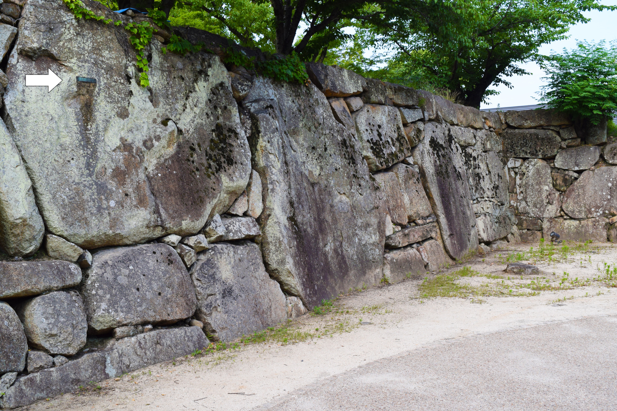 しかし、水害との戦いはそれで終わりではありませんでした。昭和9年(1934)の室戸台風により岡山の流域各所で深刻な水害が発生したことを機に、百間川の機能を強化する大規模な改修事業が昭和~平成~令和まで続くことになりました。上の写真は岡山城本丸「内下馬門」の石垣で、白い矢印の先にあるのは「室戸台風の浸水被害の水位」を示したプレートです。同様の表示が市内各所に今も残されています。