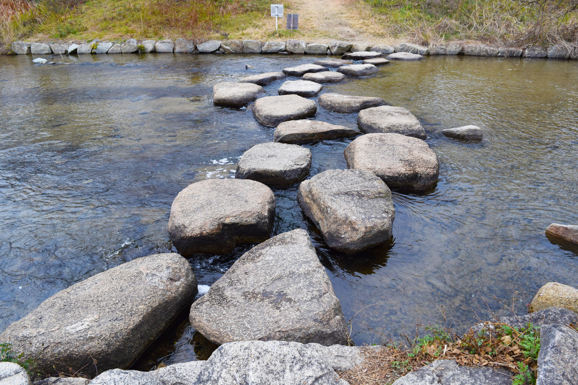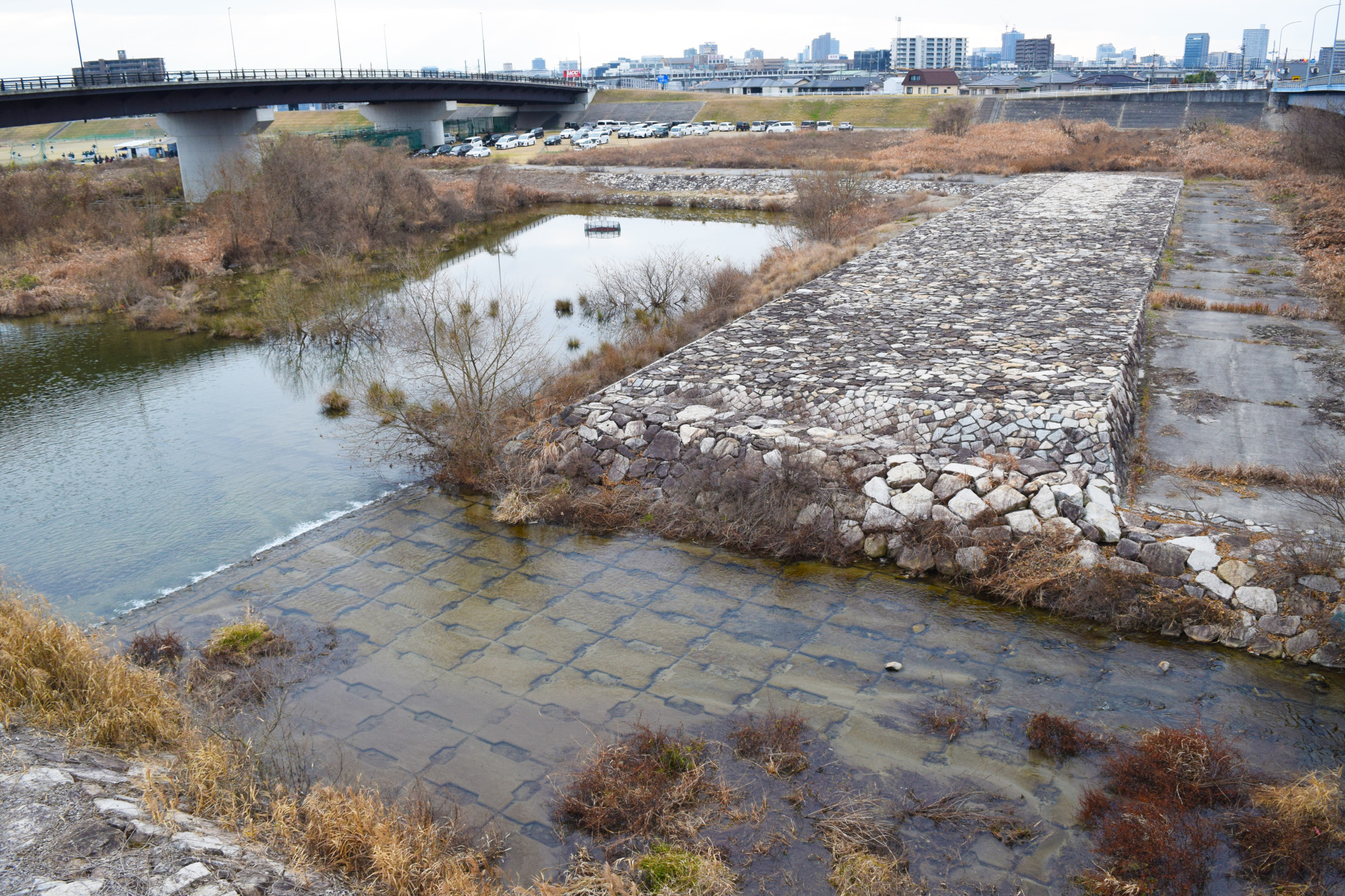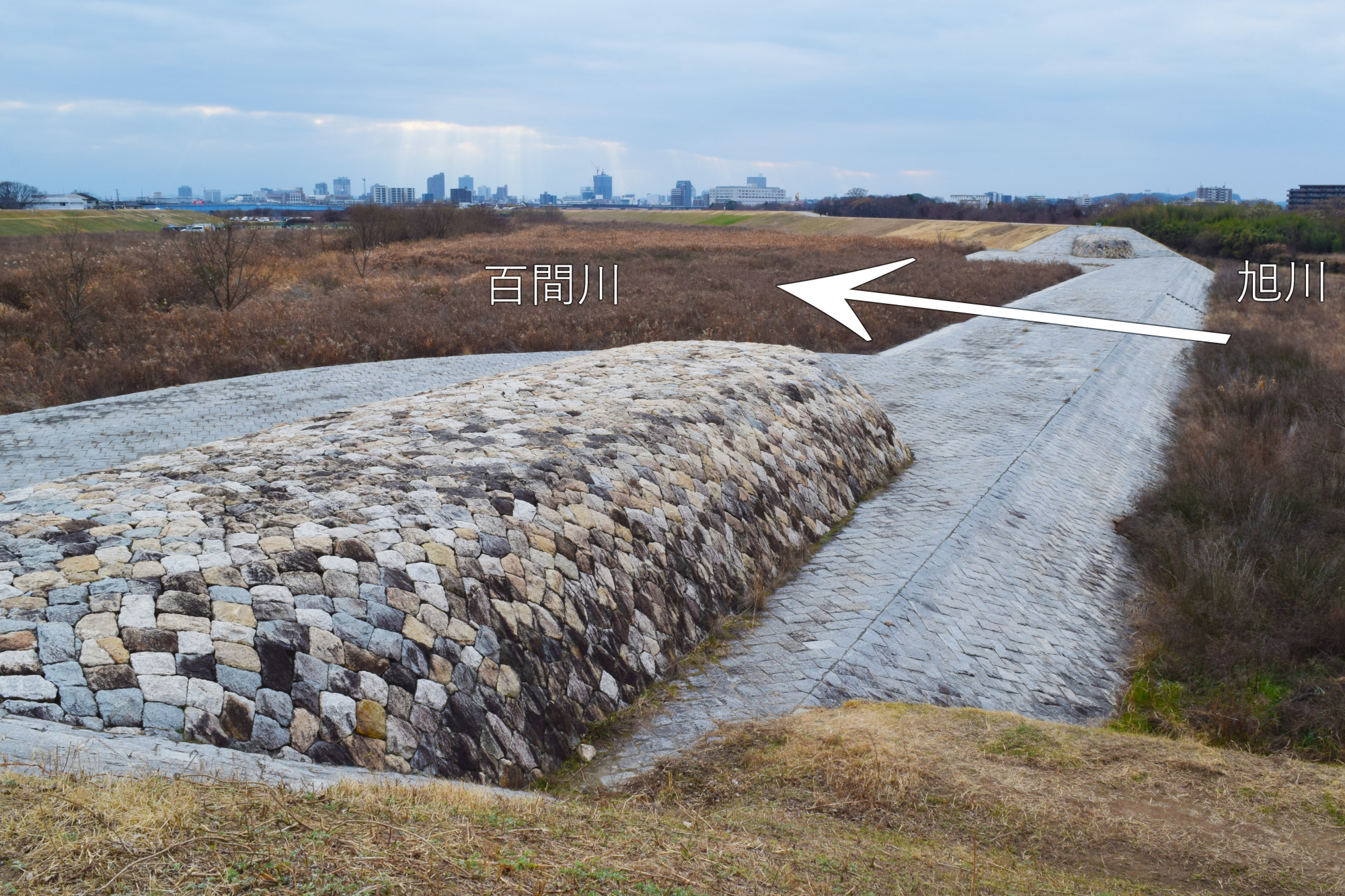 「一の荒手」の800メートルほど下流には、流入する水の勢いを弱めたり、土砂を沈殿させたりする目的で設けられた「二の荒手」があります。こちらもコンクリート等で補強を行なったうえで江戸時代の石積みを使用した現役の治水施設となっています。この「二の荒手」の幅が当時の長さの単位で100間(けん)あったことが「百間川」という名称の由来だそうです。余談ですが、岡山市出身の作家「内田百閒」のペンネームは百間川に由来するそうです。