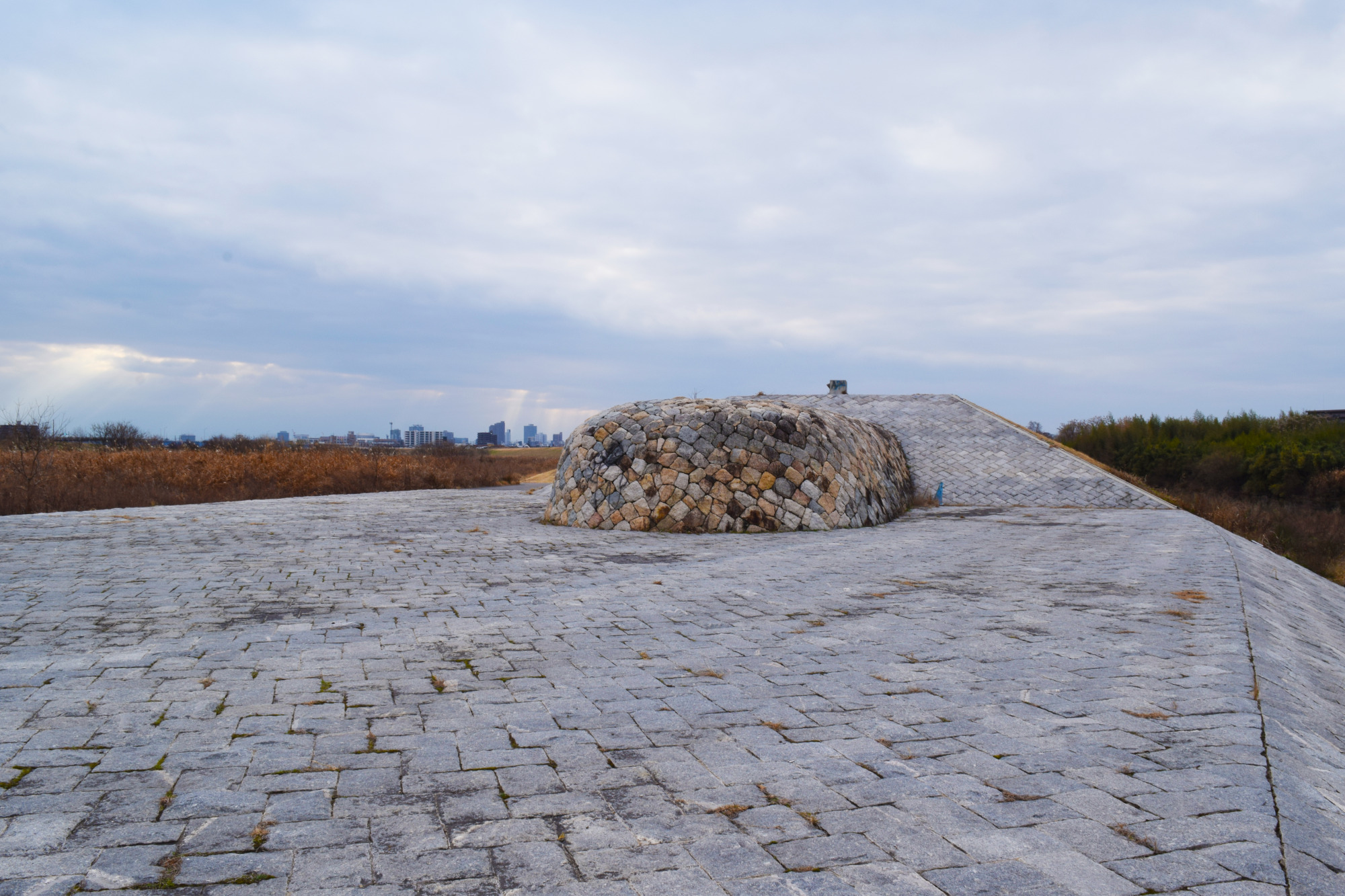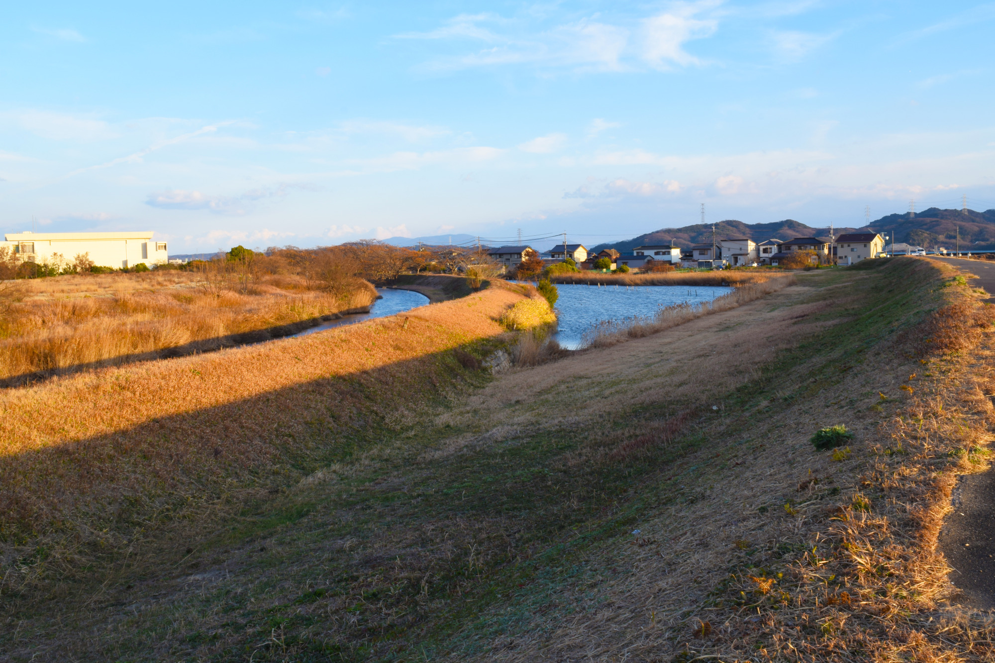 瀬戸内海が満潮の際には百間川の水を排水できないため、河口には一時的に水を溜めておく遊水地が必要でした。上の写真の中央でカーブを描く細い堤防は「大水尾(おおみお)」と呼ばれる遊水地を囲んでいた築造当時の堤防です。江戸時代の技術で水害対策と新田開発を同時に実現させた「津田永忠」の手腕には、ただただ驚くばかりです。