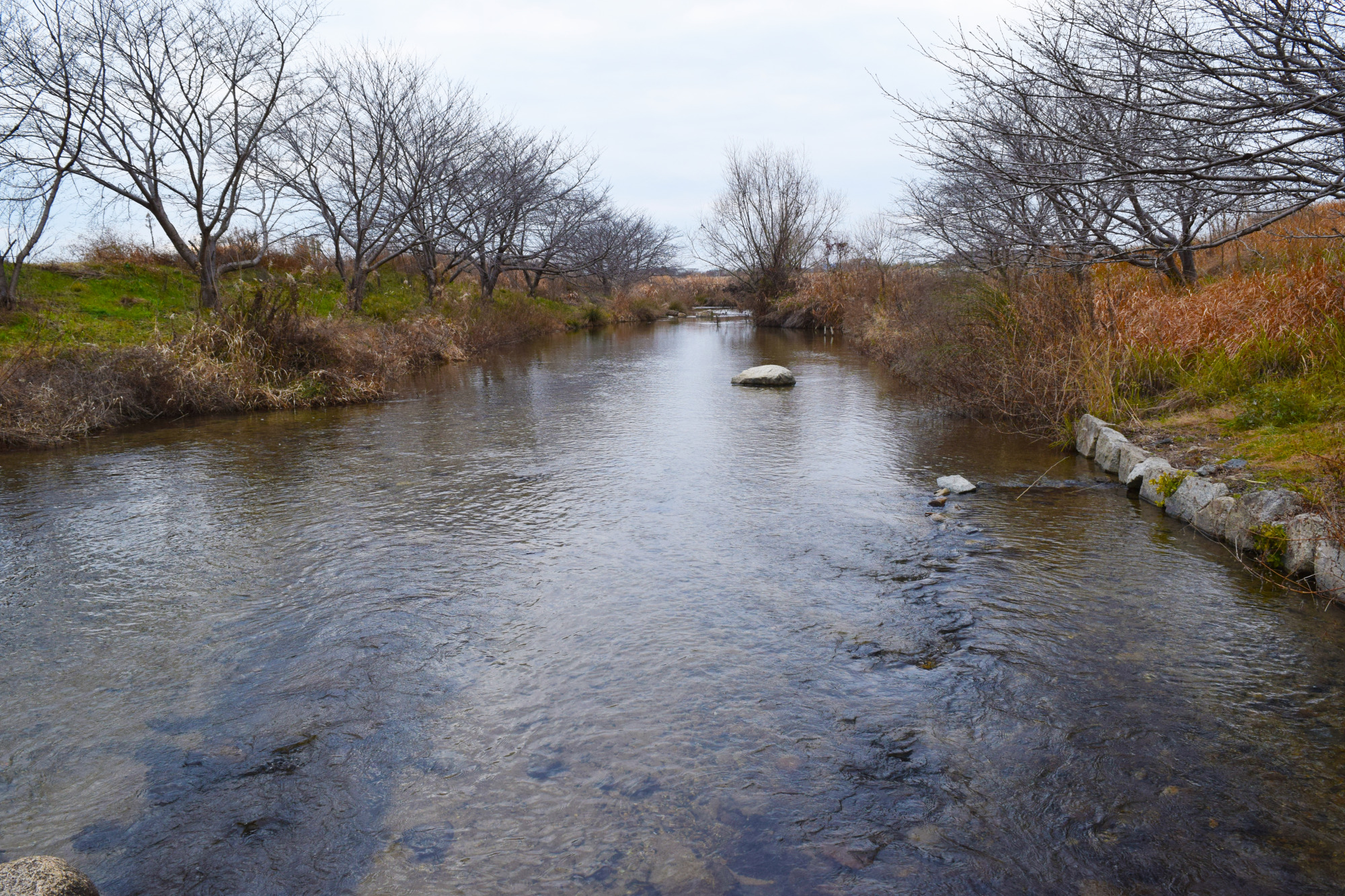 かつての百間川は平時には水の流れない空川でしたが、改修工事によって現在は少量の水が常に流れるようになっています。この地点は、旭川から取水した小さな流れが始まる百間川の源流であり、児島湾まで約13kmの長さの人工河川となります。
