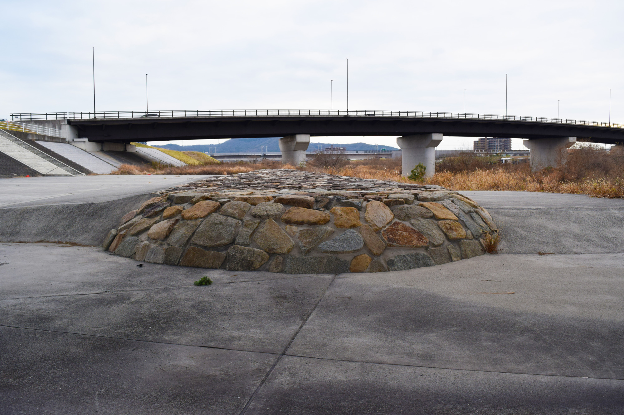 「二の荒手」にも「亀の甲」が残されています。こちらは水の流れを制御する導流堤として築かれたもので、コンクリートで直接固めて補強されています。かつては「二の荒手」の下流に「三の荒手」も存在したそうですが、明治25年(1892)の洪水によって流失してしまい、現存していません。