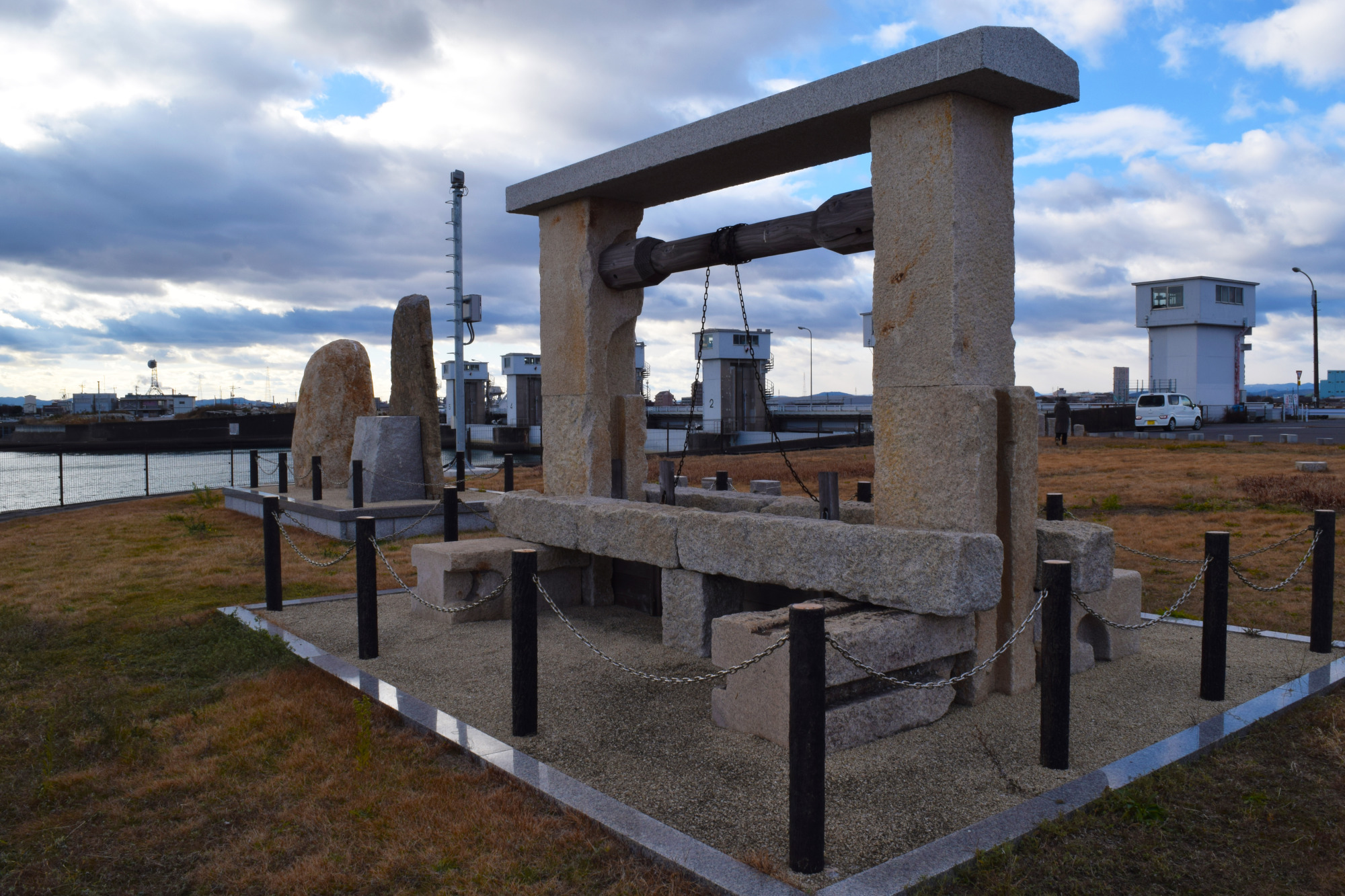 かつての百間川は上流部では水のない空川でしたが、途中で複数の用水や干拓地の排水が流入し、河口では大河のようになります。しかし、瀬戸内海が満潮の際には川より海面の水位が高くなるため、海水の逆流を防ぐ水門が必要となります。現在、河口水門の中央にある防潮堤広場には、昭和の改修前まで長期にわたって使用されたという石造の水門が展示保存されています。