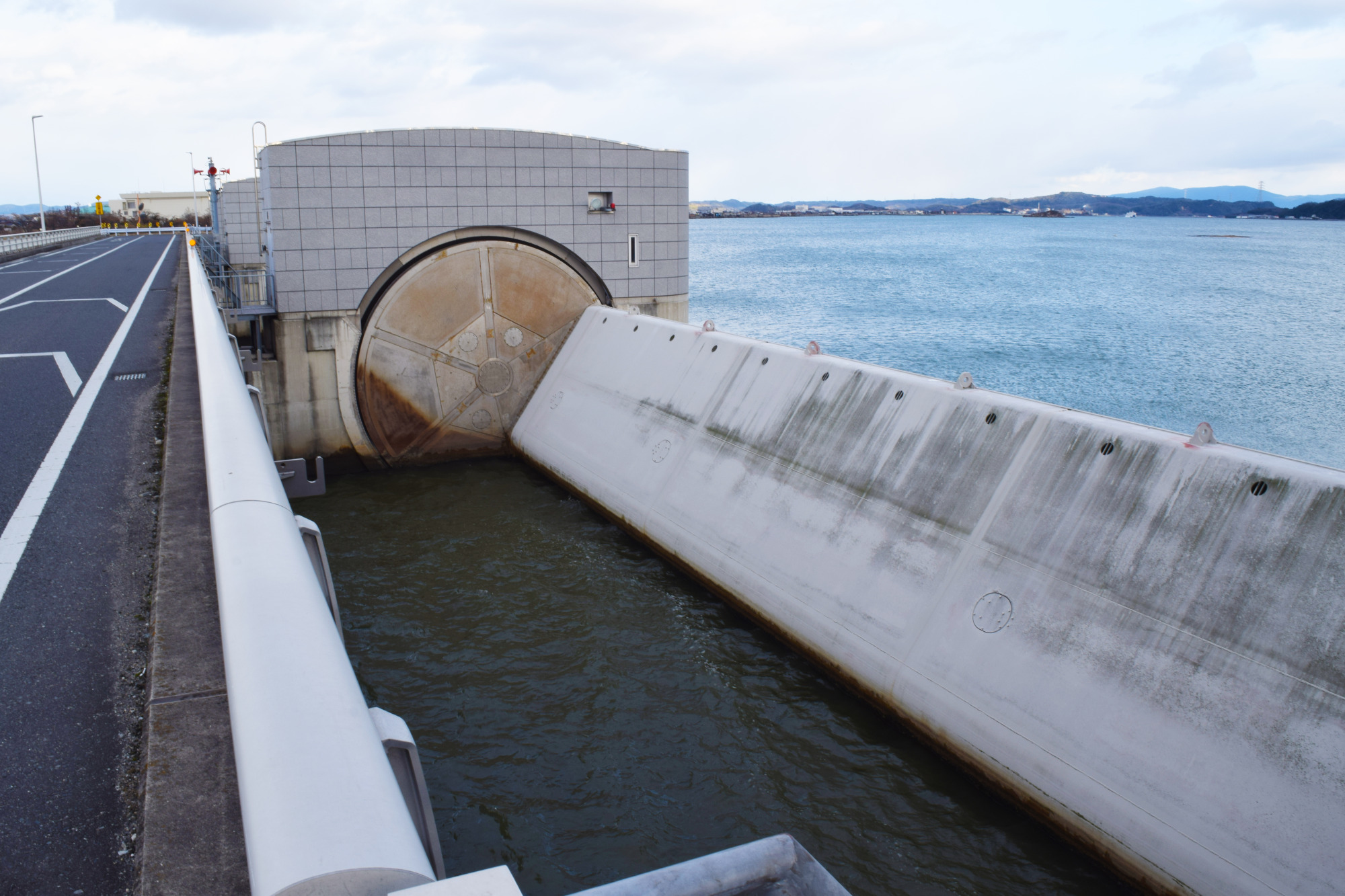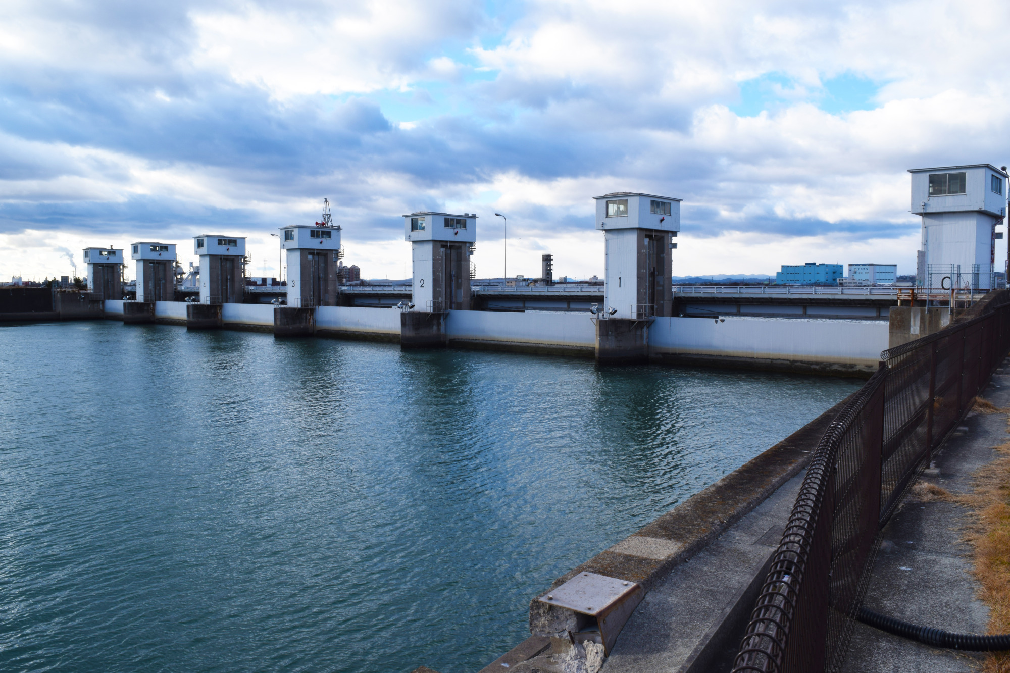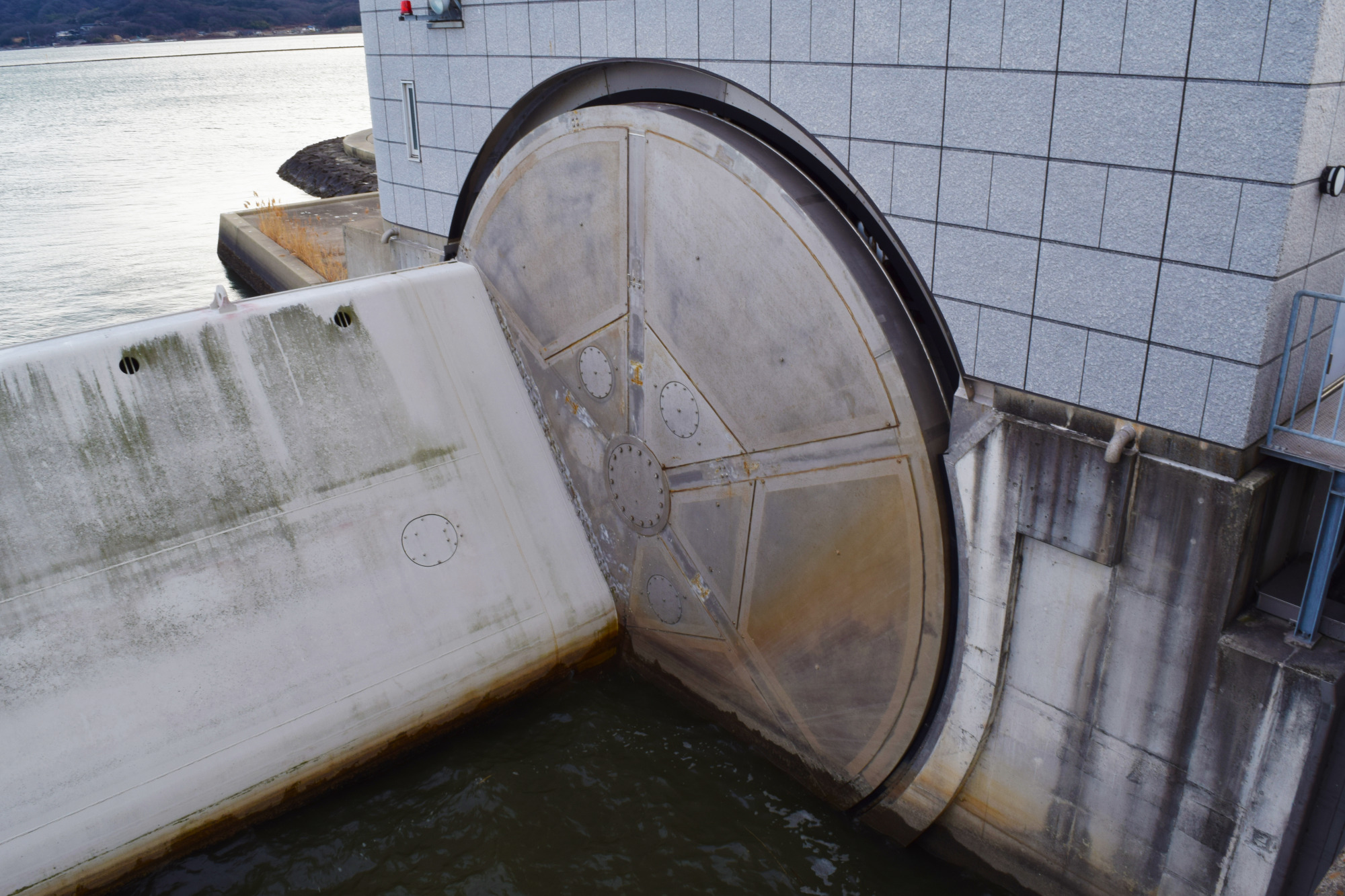 河口水門の東半分は平成27年(2015)に完成した「ライジングセクターゲート」という最新の設備で、水門の開閉が回転式になっています。このタイプのものとしては国内最大級だそうで、メカメカしい構造や必殺技のような名称など、なかなか男心をくすぐる施設です(笑)。