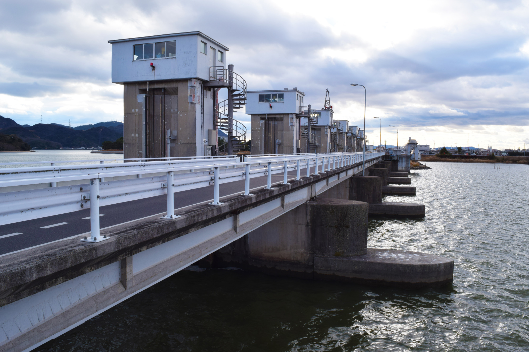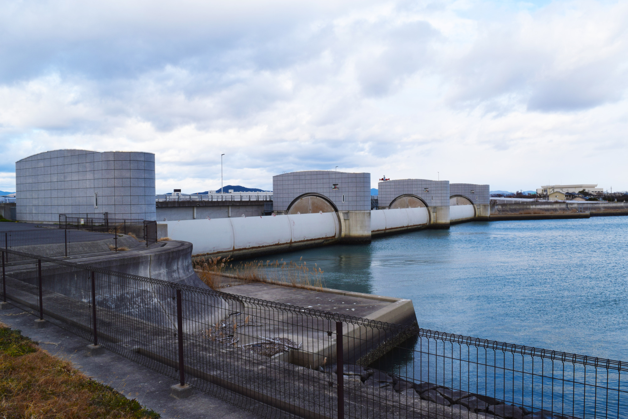 百間川は岡山藩による干拓事業とも深い関わりがありました。旭川の緊急の放水路としてだけではなく、干拓地の排水と農業用水の供給にも関与する重要なインフラだったのです。下流域の両岸は広大な干拓地となり、大規模な治水施設が構築されました。とくに、河口部分がすべて水門で守られている光景は圧巻です。