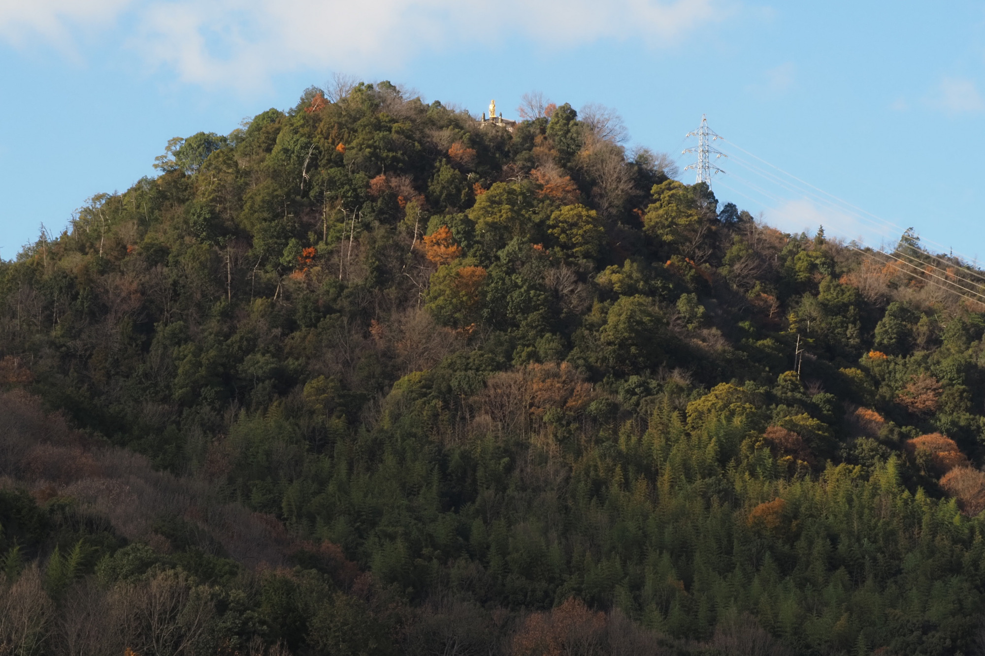 山頂付近に鎮座する「銀寿観世音菩薩」は「ボケ封じ観音」としても親しまれており、平成3年(1991)に町民の協力によって建立されました。青空に映える金色の姿は圧巻ですが、ここからの景色もまた格別!