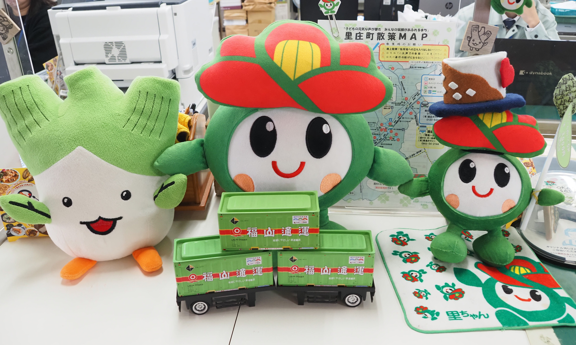 企画商工課の窓口には、「里ちゃん」のぬいぐるみ、ピンバッジ、マスキングテープなどが並んでいます。