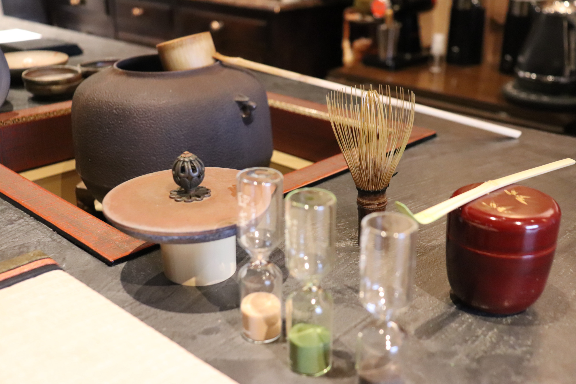 お抹茶を待ちながら目の前に並ぶ茶道具も楽しみました。電気釜には、お湯がまろやかになるように鉄瓶がかかっています。時間を計る砂時計はおしゃれな形で、伝統の中に新しさもあり、新鮮な感じがしました。
