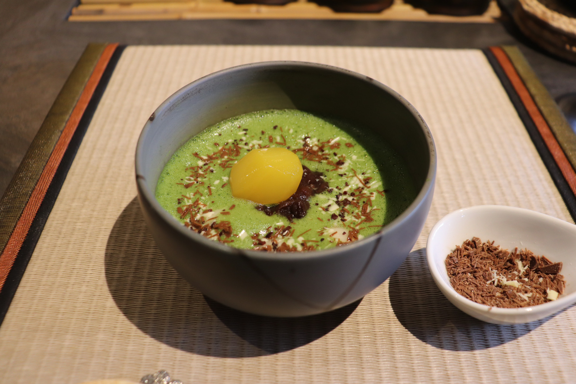 お抹茶が出来上がりました。せっかくなので人気の「栗と抹茶のぜんざい チョコ風味」(1,400円)を頂いてみました。お抹茶は岡山辻梨園さんの宇治抹茶で、温かい特製餡子に栗の甘露煮、茹でたての白玉団子が入っていました。そこに、カカオニブとチョコレートをトッピングして味変して楽しむと美味しいです。一見合わないような取り合わせですが、絶妙な美味しさで、これぞ元フレンチシェフの店主の感性が生かされていると感じました。