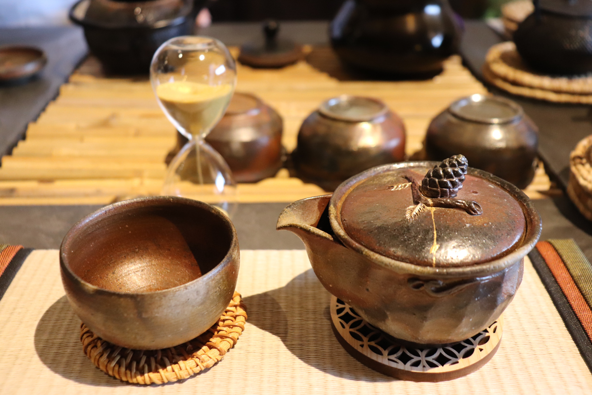 お茶を入れる急須も備前焼で、蓋の形がいろいろあって選ぶことができます。私は松ぼっくりにしてみました。備前焼は素焼きの焼き物で、お湯をまろやかにしてくれ、お茶が美味しくいただけます。
