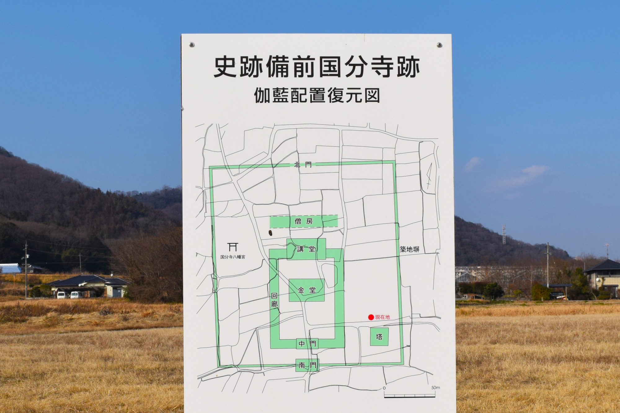 スタート地点は「備前国分寺跡」です。国分寺とは、奈良時代(741年)に聖武天皇の勅令によって、当時60か国ほどあった国ごとに建立された寺院のことです。備前国では山陽道に面した当地に造営され、この地域における文化の中心地として栄えたそうです。