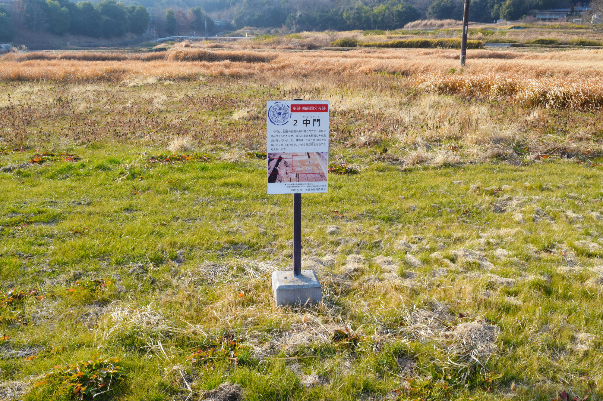 平安時代中頃に七重塔は失われ、その他の建物も徐々に縮小されていったと考えられています。最終的には戦国時代の末頃に終焉を迎えたようなので、何らかの戦乱に巻き込まれたのかもしれません。発掘調査に基づいて、伽藍の配置を示した案内板のほか、塔や講堂の基壇などが復元整備されています。