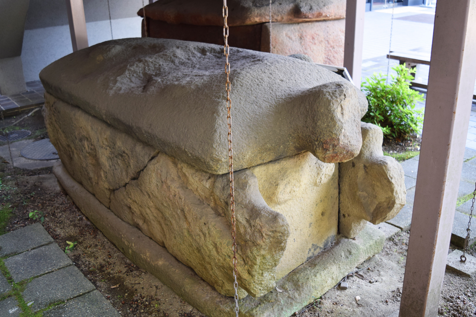 「朱千駄古墳」の後円部からは、組み合せ式の「長持形石棺」が出土しました。縄掛突起(なわかけとっき)が特徴的なこの石棺は、「岡山後楽園正門/岡山県立博物館」の前に保存されていて自由に見学することができます。